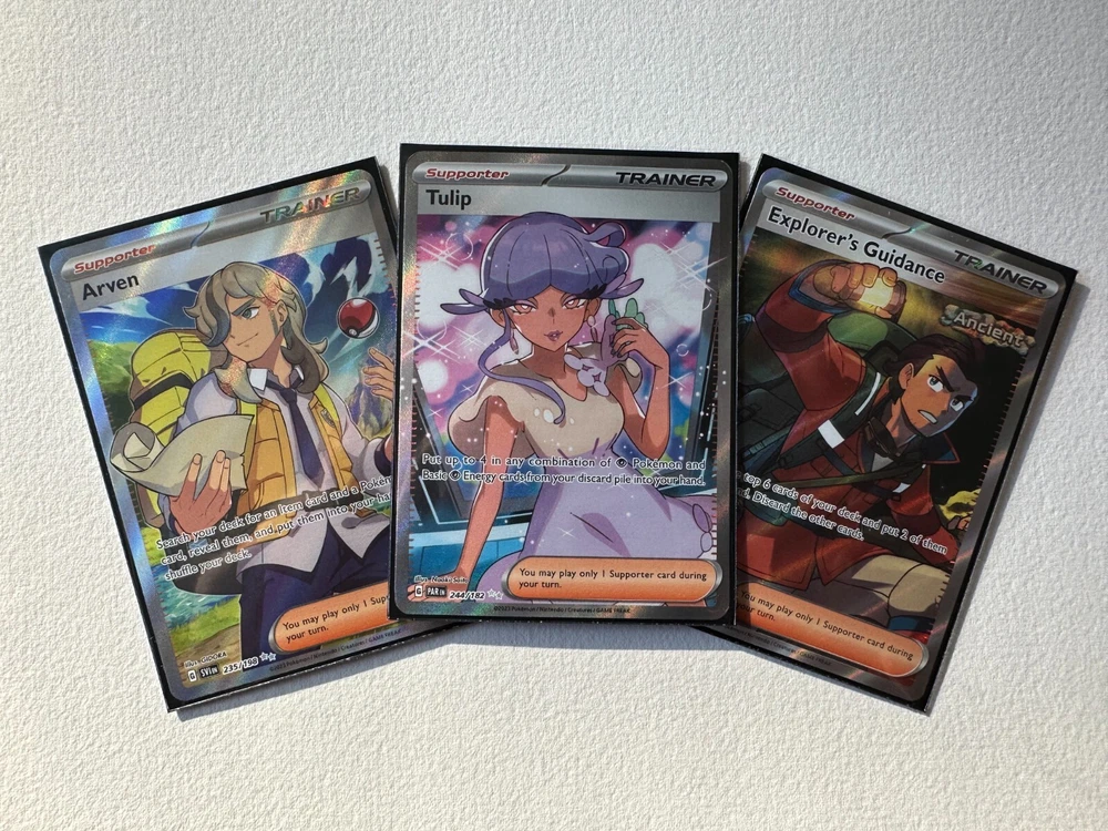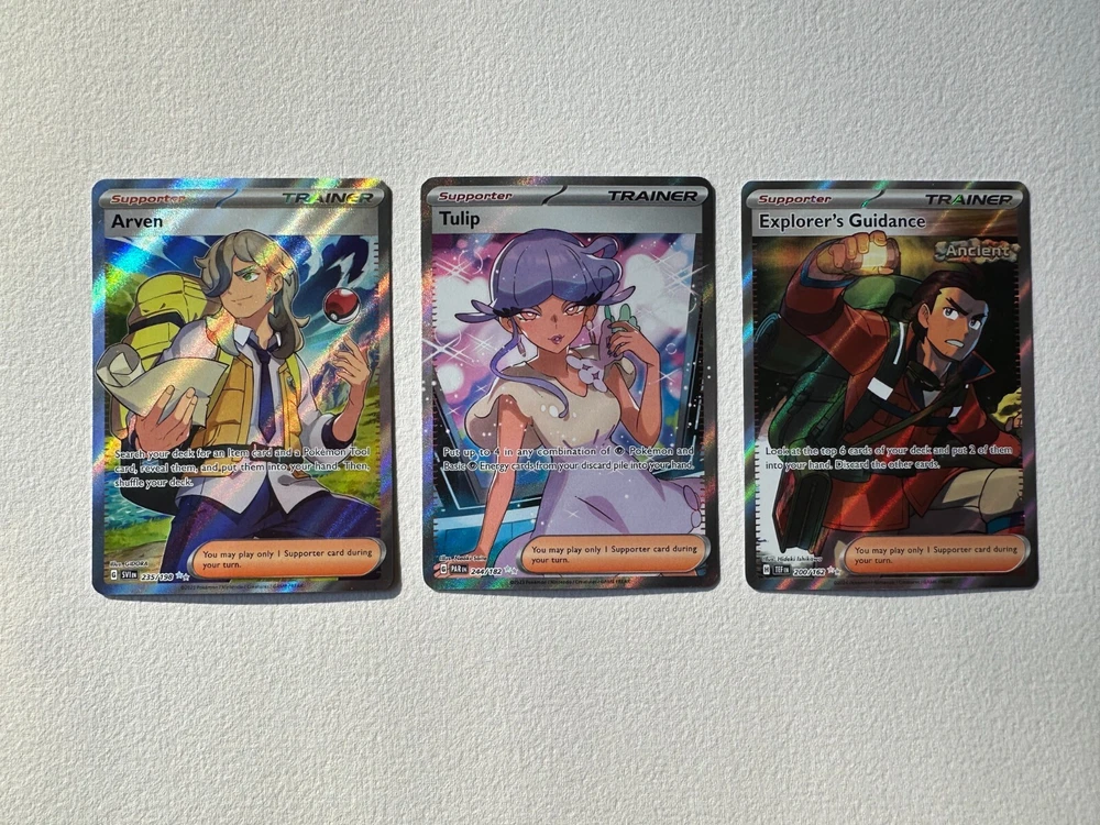 Three trainer cards from the SV era of Pokemon TCG! Arven from SV base set, Tulip from Paradox Rift, and Explorer's Guidance from Temporal froces. Will arrive well-packaged and sleeved.