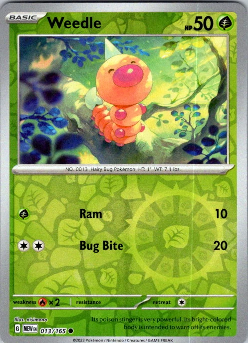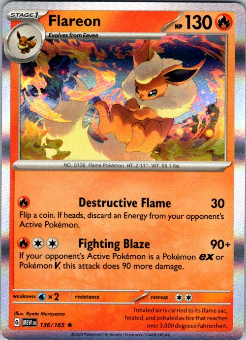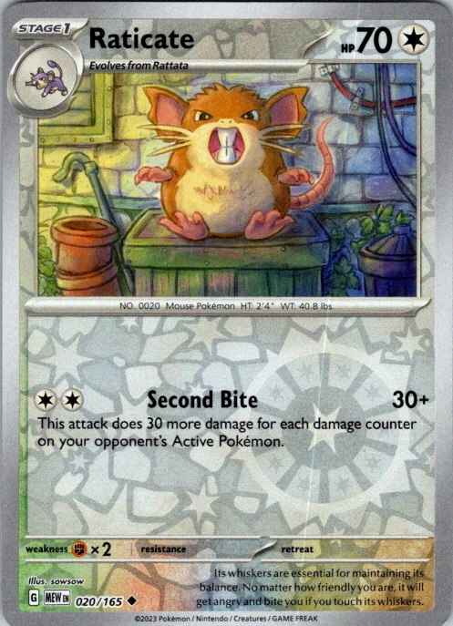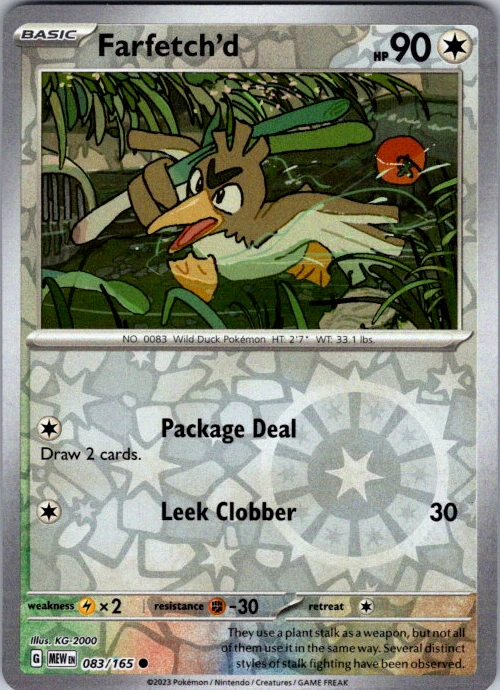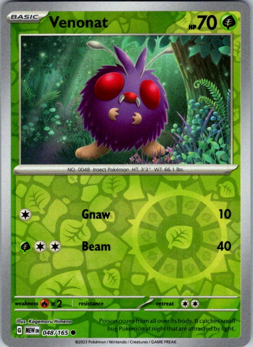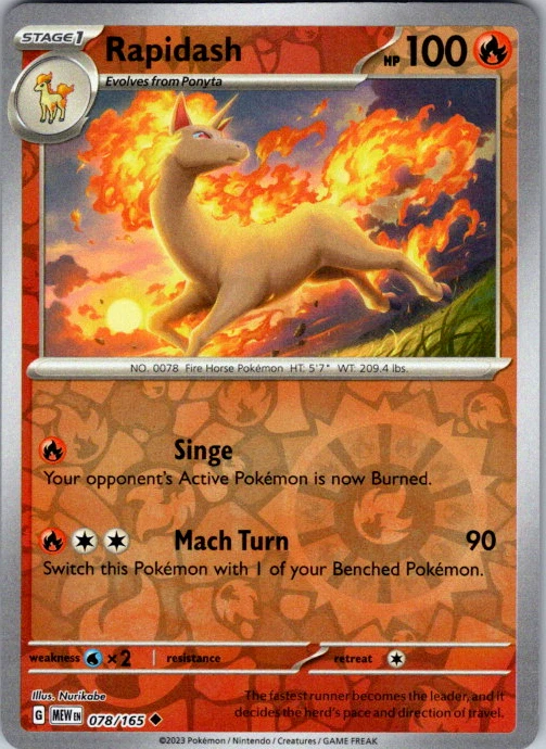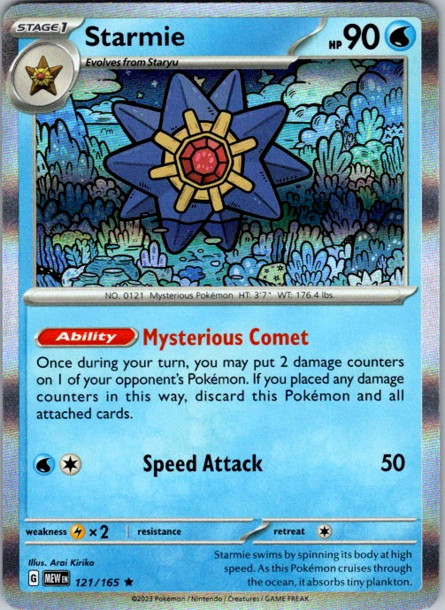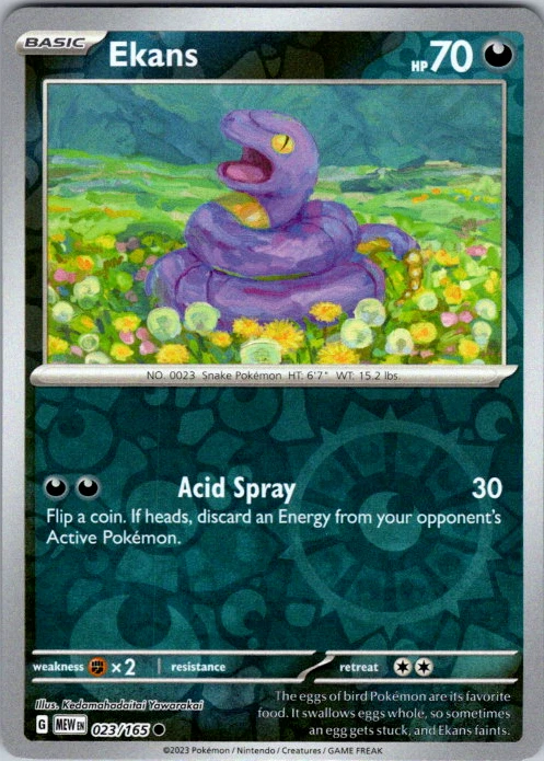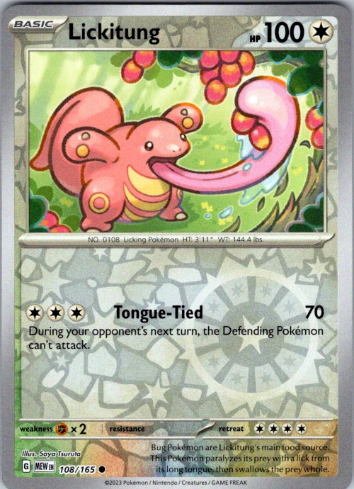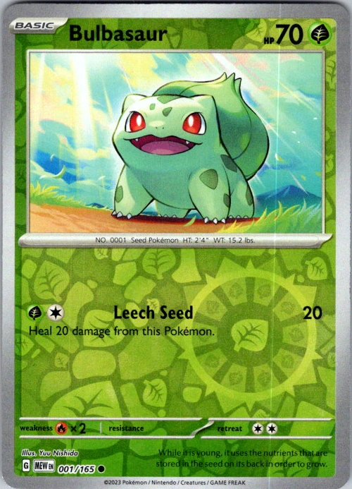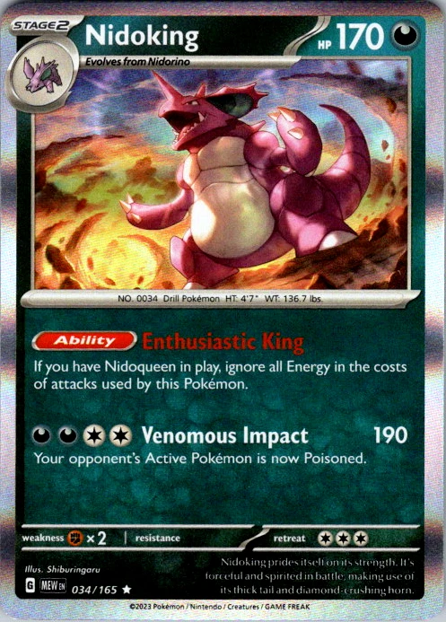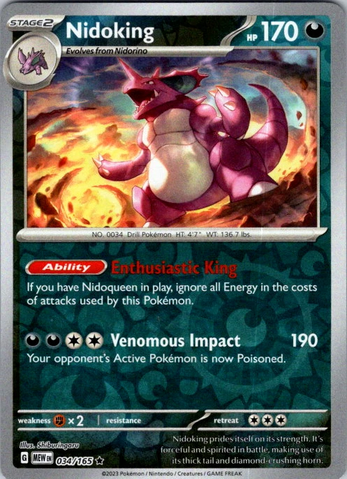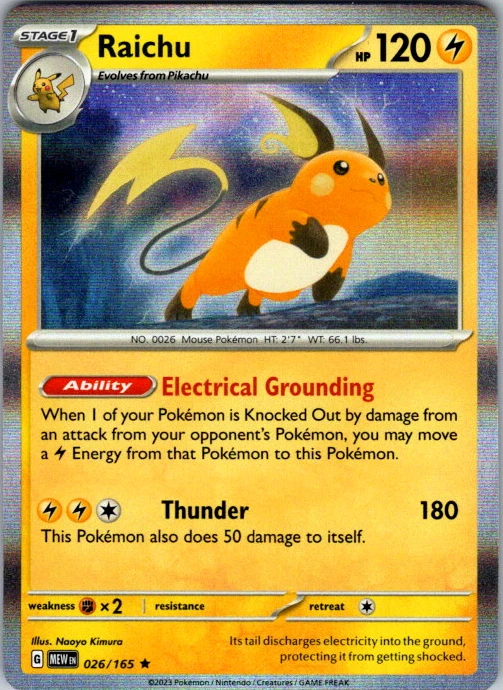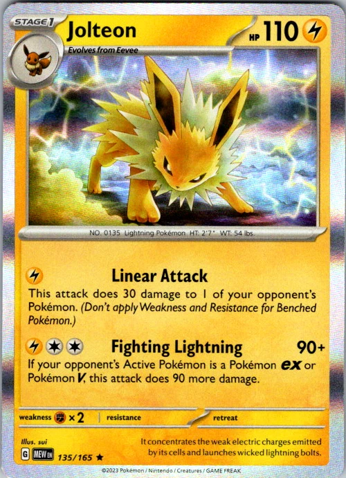 Upgrade your deck or collection, with this assortment of rare and reverse holo cards from SV: Scarlet & Violet 151. All cards in this listing are near mint. Don't forget to leave positive feedback, and thanks for your purchase! ---Card Condition Guide--- Near Mint (NM): Cards in Near Mint condition show minimal wear from shuffling, play, or handling and can have a nearly unmarked surface, crisp corners, and unblemished edges outside of a few slight flaws. A Near Mint card may have slight edge wear or a couple minor scratches, but overall look nearly un-played with no major defects. The acceptable range of cards within the Near Mint condition includes both cards with no imperfections and cards with few, minimal imperfections. Lightly Played (LP): Cards in Lightly Played condition may have minor edge wear, scuffs, or scratches. There are no significant imperfections or issues with the structural integrity of the card. Noticeable imperfections are okay, but none should be too severe or at too high a volume. The acceptable range of cards within the Lightly Played condition includes both cards with few or a handful of minor imperfections. Moderately Played (MP): Cards in Moderately Played condition can have edge wear, surface wear, scratching or scuffing, bends with creases, or a combination of moderate examples of these imperfections. Some imperfections, such as bends, peels, or liquid exposure may be acceptable at Moderately Played as long as they do not impact the structural integrity of the card. Measurements provided with the standards will determine acceptability. Heavily Played (HP): Cards in Heavily Played (HP) condition show a major amount of wear. Cards can show a variety of moderate imperfections along with creasing, whitening and other faults. Heavily Played cards can also have defects or severe imperfections that do not impact the integrity of the card. While Heavily Played cards can have many imperfections, they must still be able to be authenticated and cannot be structurally damaged. Damaged: Damaged cards show wear or imperfections beyond the standards for other conditions. Cards in Damaged condition may have major border wear, scratching or scuffing, as well as bends, tears, splitting, foreign substances such as food or liquid, or other damage that impacts the integrity of the card. (VotS TCG will not sell damaged cards that contain foreign substances)