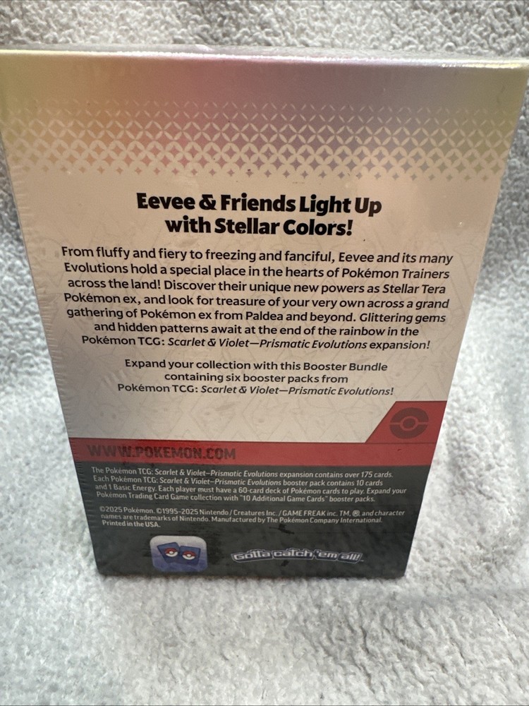 The Pokemon TCG SV8.5 Prismatic Evolutions Booster Bundle features a set of Scarlet & Violet cards with a total of 60 cards in a single box. This booster bundle includes popular characters such as Umbreon, Flareon, Jolteon, Eevee, and Vaporeon. Manufactured in 2025 by Nintendo, the cards are made of durable card stock material and are in English language. Perfect for collectors and gamers alike, this booster bundle is a must-have for any Pokemon TCG enthusiast looking to add to their collection.