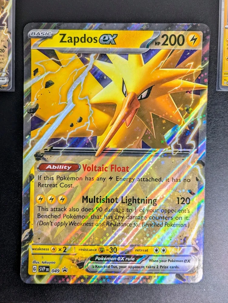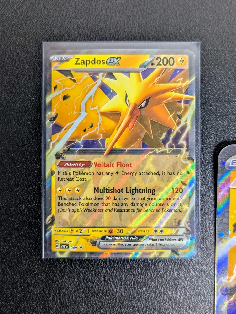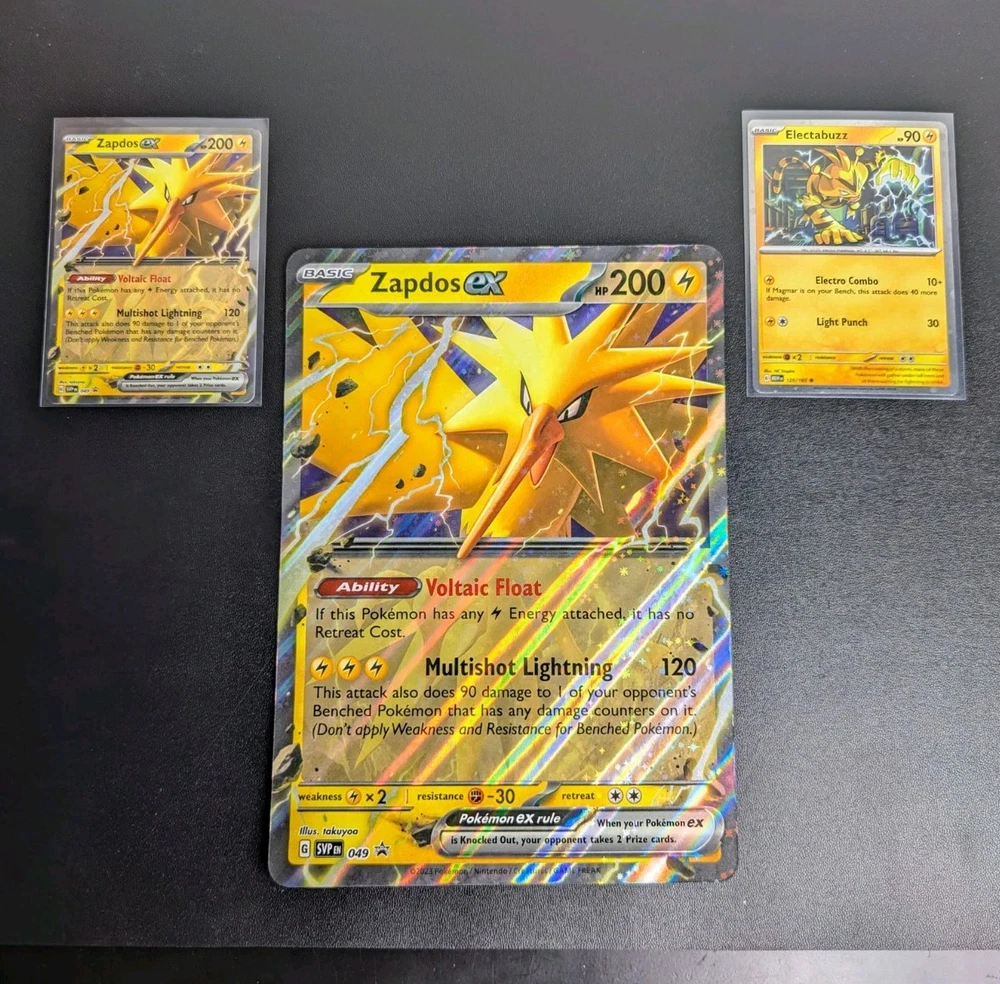 Pokemon TCG: Scarlet & Violet 151 Zapdos EX Box PROMO CARDS w/ Jumbo Card You will receive the cards pictured above. 2 standard size promo cards (ZAPDOS EX + ELECTABUZZ) and 1 JUMBO card (ZAPDOS EX). They are in near mint condition and were sleeved immediately after opening the product box. ---------------------------------------------------------- A stunning set of Pokemon TCG Scarlet & Violet 151 Promo Cards. This set includes Zapdos EX, and Electabuzz, it also includes the jumbo promo card. They feature a beautiful holo finish. These promo cards are a must-have for any serious collector of the Pokemon TCG. Don't miss out on this opportunity to add these rare and speciality cards to your collection! Thanks for looking!