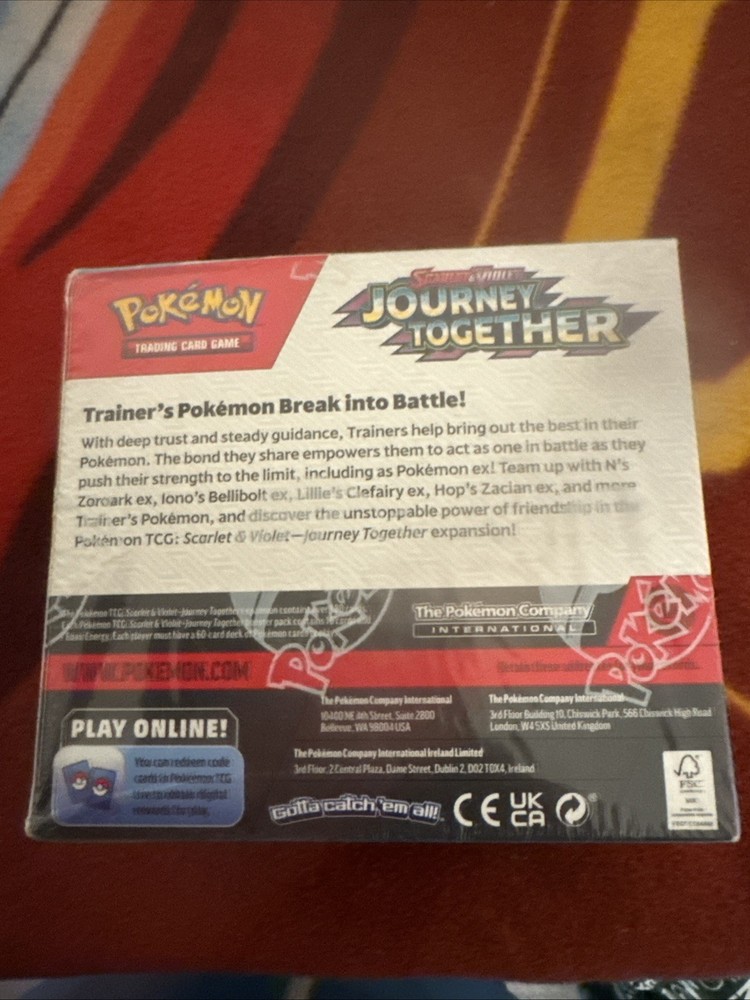 The Pokemon TCG Scarlet & Violet Journey Together Booster Box is a new and sealed collectable card game product featuring cards from the popular Pokemon franchise. This box includes 360 standard-sized cards from the Journey Together set, manufactured by Nintendo in the United States. The cards are in English and illustrated by The Pokemon Company Art-team, making it a desirable item for fans and collectors of Pokemon TCG. Each booster box contains one set of cards, perfect for players aged 6 and above to enjoy at home or in competition at the Pokemon League events.