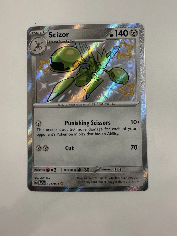 Dive into the world of Pokémon TCG with the Scarlet & Violet - Paldean Fates Scizor card, a shiny holo rare that's a must-have for collectors and players alike. Boasting a striking holographic finish, this card features the formidable Scizor, ready to take on any challenge in your next battle. With card number 191/091, this English-language Pokémon card from The Pokémon Company is packed with 140 HP, promising power and resilience. It fits seamlessly into standard card protectors and binders, making it a valuable addition to any collection. Whether for competitive play or as a treasured collectible, this Scizor card shines in any assortment.