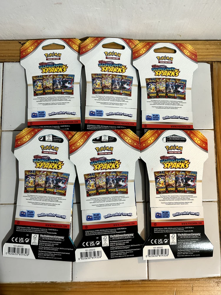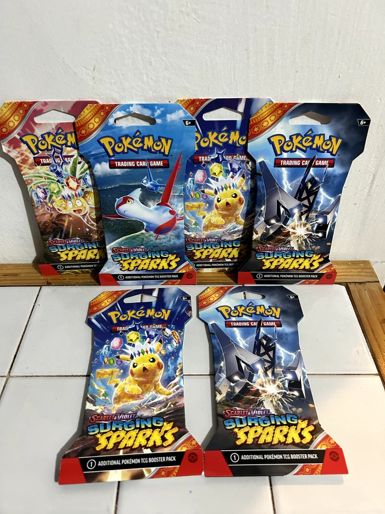 The product is a set of six sealed booster packs from the Pokémon TCG Surging Sparks series. Each pack contains 10 standard-sized cards featuring characters like Latias, Pikachu, and Exeggutor. The cards are made of cardboard and are in English, manufactured by Nintendo in the United States. These packs are part of the Pokémon League event and are designed for players aged 6 and above to enhance their TCG game collection with new cards from the Surging Sparks expansion.
