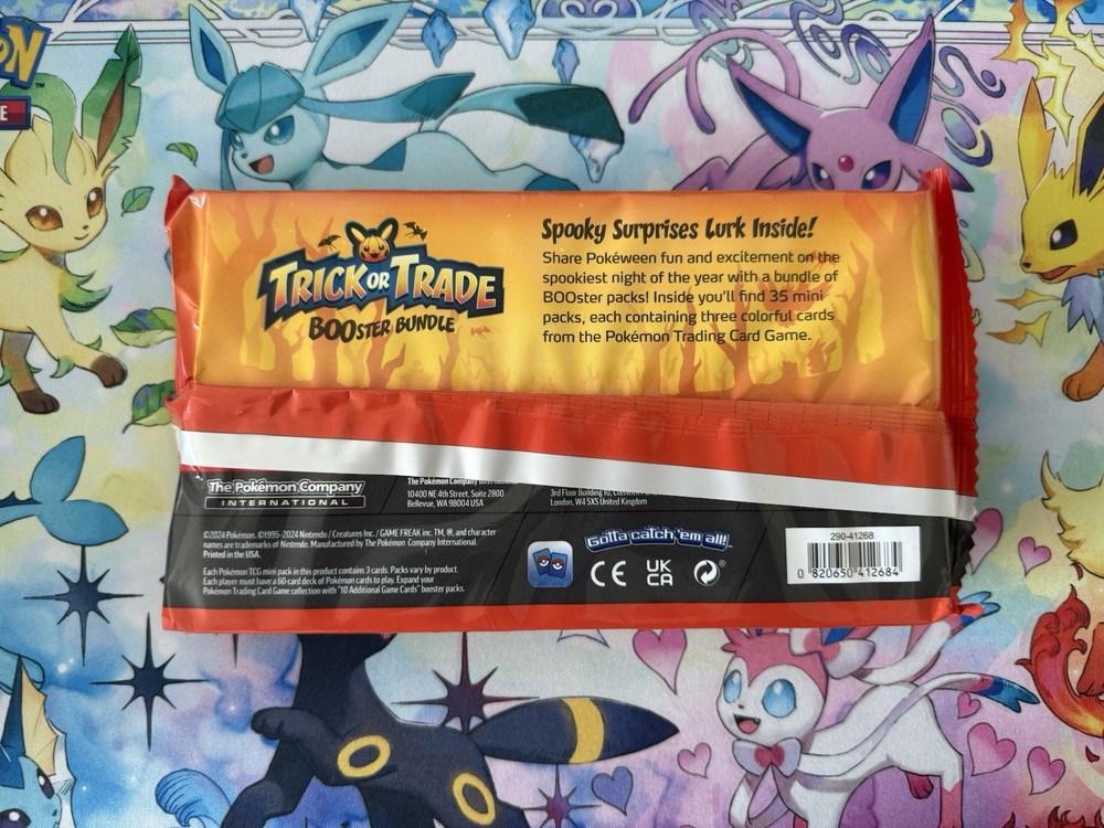 The Pokemon Trick or Trade 2024 Booster Bundle includes 35 mini packs, each containing 3 sealed cards featuring characters from the Pokemon GO set like Pikachu and Gengar. The packs are made of standard-sized card stock and are in English language.
