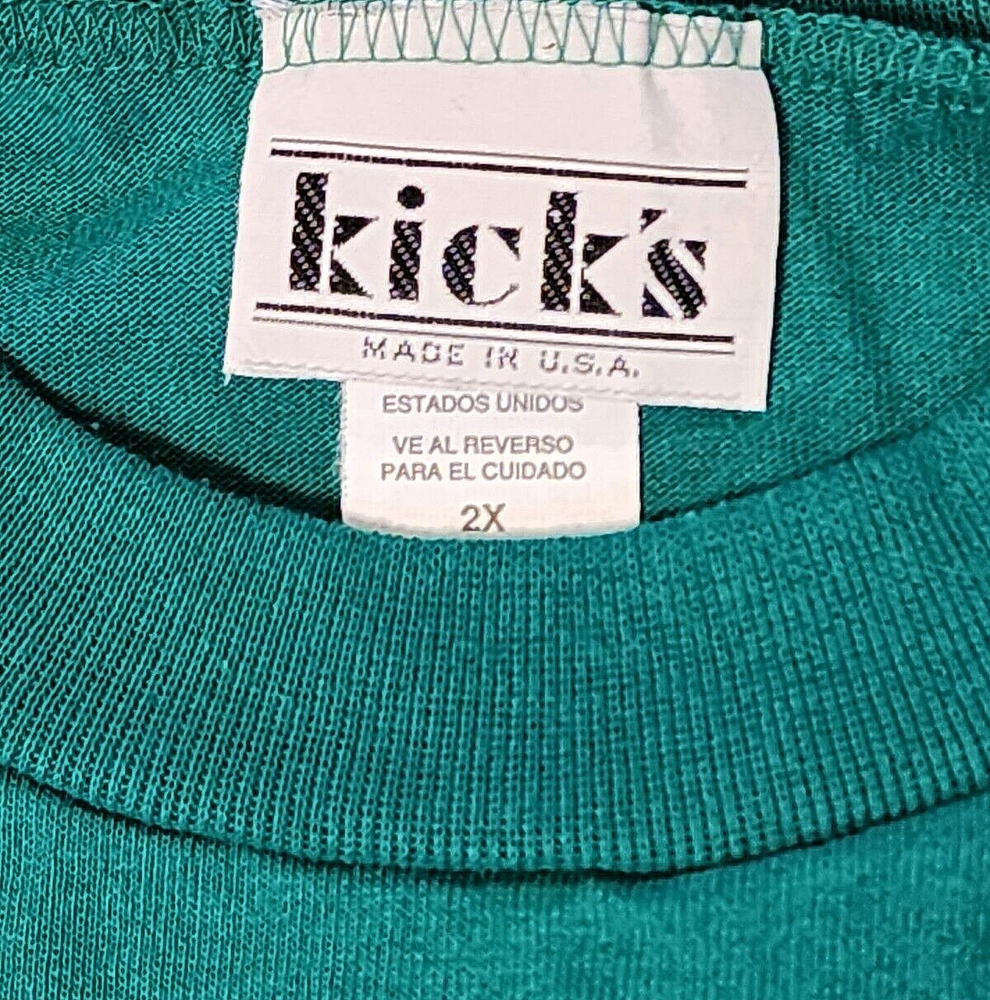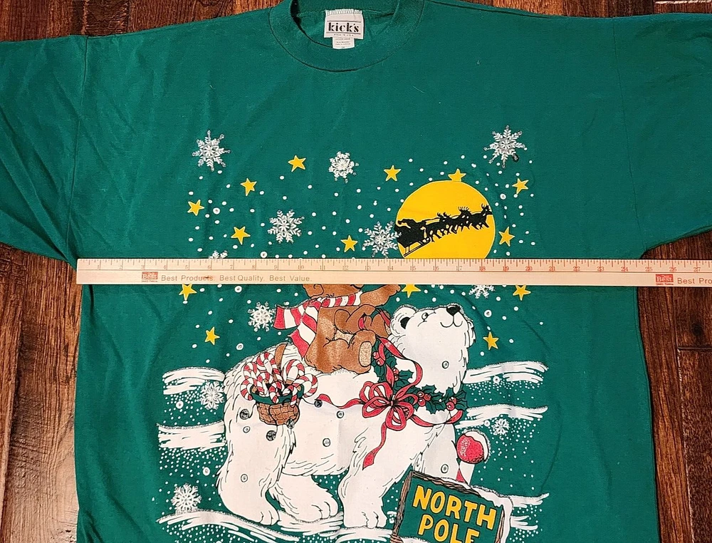 Style: Tunic Theme: Christmas Size: 2XL Material: 50% Cotton 50% Polyester Department: Women Type: T-Shirt Size Type: Regular Color: Green Neckline: Crew Neck Pattern: Christmas graphic Seller Notes: “In very good pre-owned condition, probably vintage” Sleeve Length: Short Sleeve Brand: Kick's