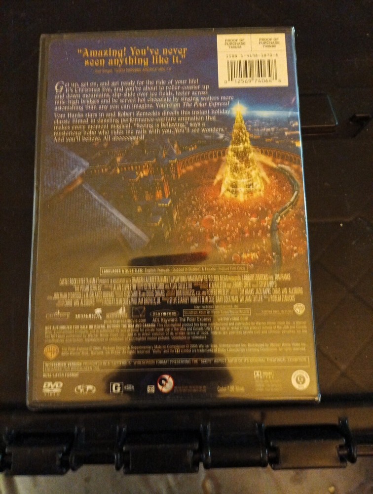 The product is a "Polar Express" DVD featuring Tom Hanks, a Christmas-themed movie in English with a G rating. It is presented in widescreen format by Warner Home Video and has a runtime of 100 minutes. The DVD is brand new, sealed, and unopened.