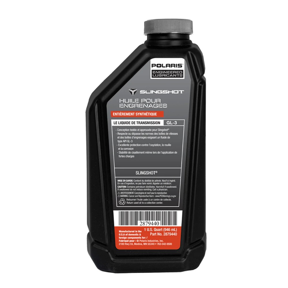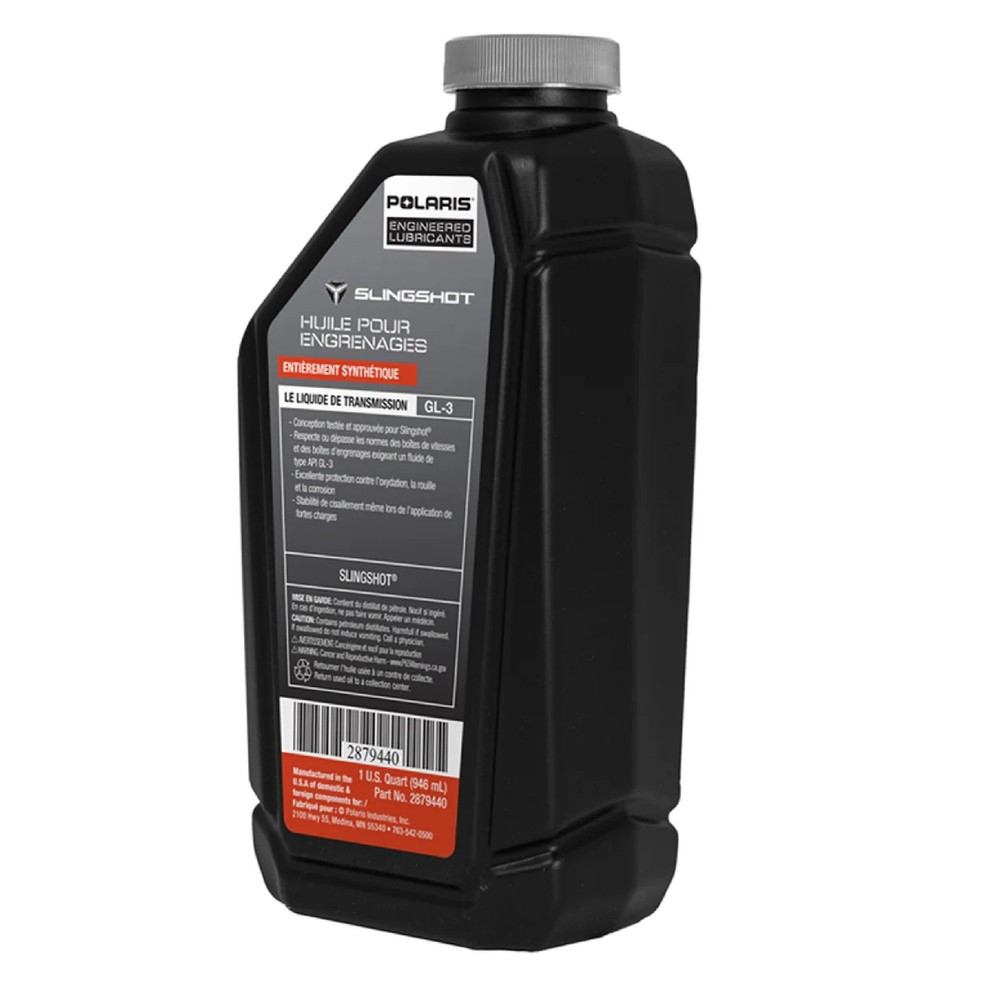 Genuine Polaris Slingshot New OEM Transmission Oil Lubricant 75w-90 32oz Quart 2879440. This is a factory original equipment accessory, not aftermarket. Manufacturer Part # 2879440. Polaris Engineered and developed specifically for the Polaris Slingshot. Advanced additive technology provides proper friction characteristics for smooth shifting and remains shear stable under high loads. Features include:- Polaris Engineered tested and approved for Slingshot® - Meets or exceeds transmission/gearcase performance requiring API GL-3 grade fluid - Excellent oxidation, rust and corrosion protection - Shear stable even in high load applications - 1 Quart 1 Quart - Meets or exceeds transmission/gearcase performance requiring API GL-3 grade fluid Advanced additive technology provides proper friction characteristics for smooth shifting Remains shear stable under high loads Excellent oxidation, rust and corrosion protection Shear stable even in high load applications SKU# 2879440 Fits: Slingshot