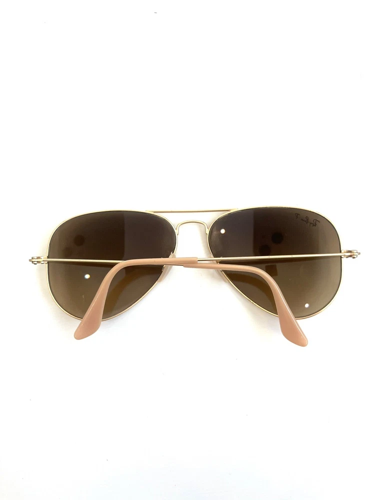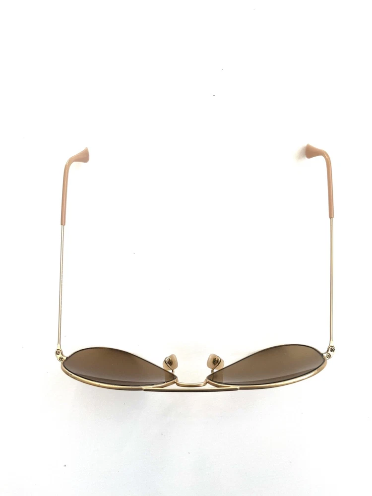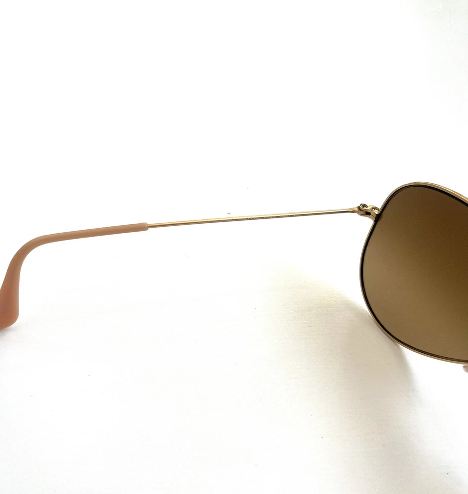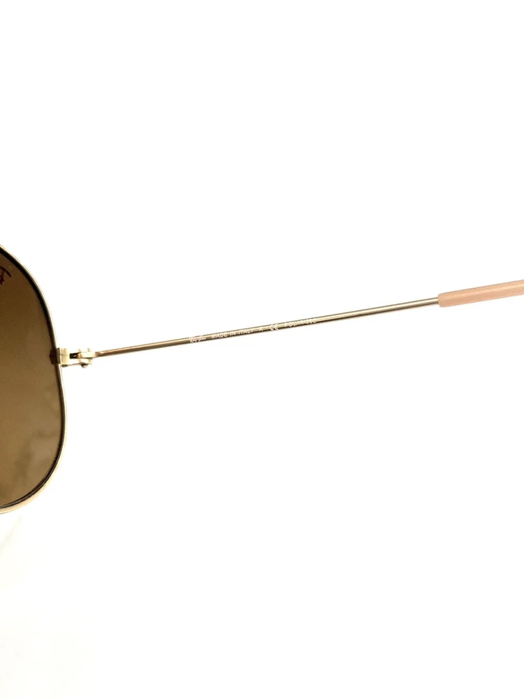 These are Ray-Ban RB 3025 001/51 Aviator Sunglasses in a gold frame with brown gradient lenses. They are unisex pilot-style sunglasses with a metal frame and glass lenses providing 100% UV protection. These designer sunglasses have a lens width of 58 mm, bridge width of 14 mm, and temple length of 135 mm. Made in Italy, they offer a stylish and fashionable accessory for both men and women.