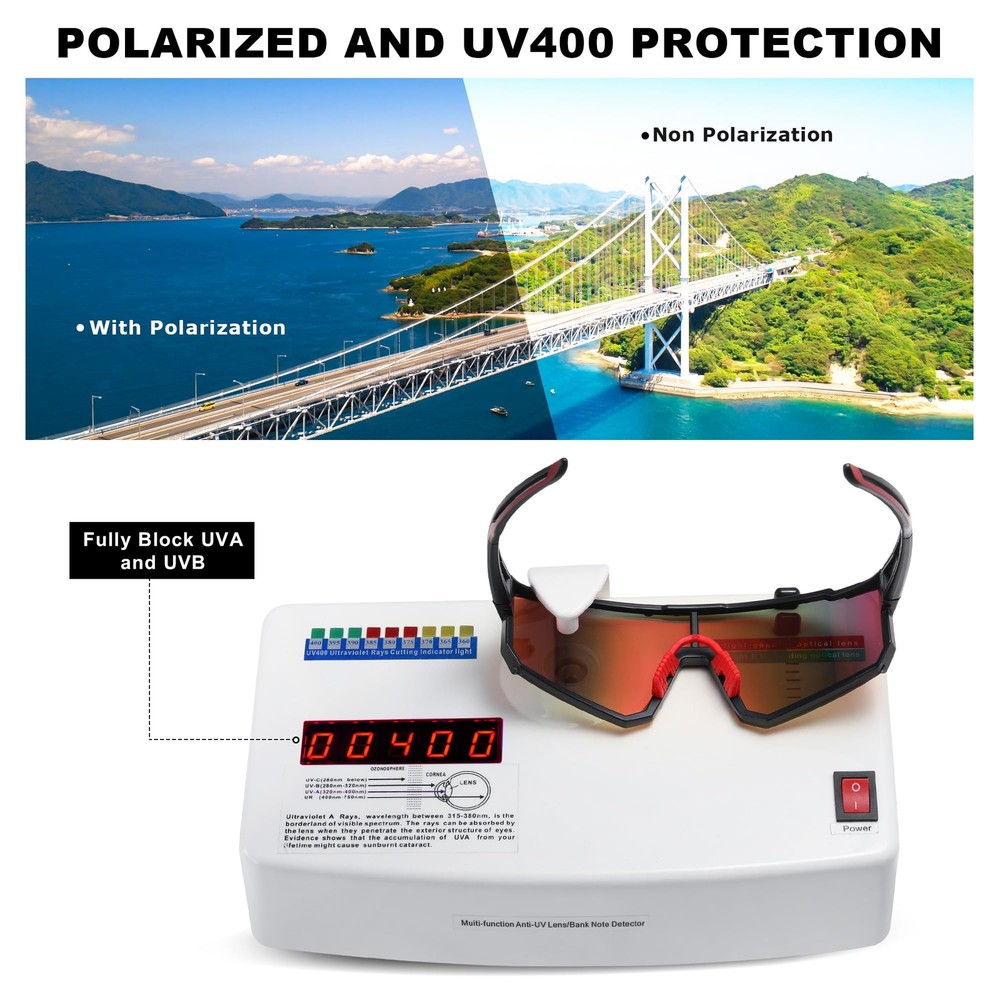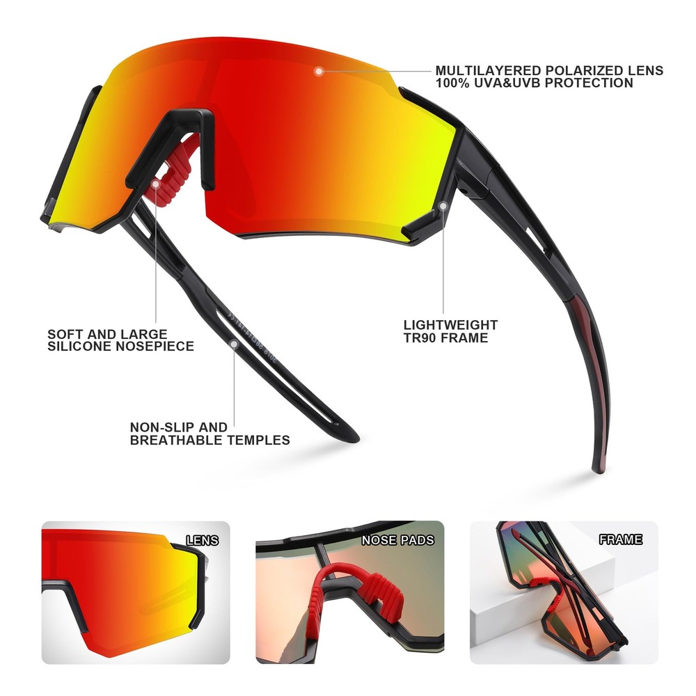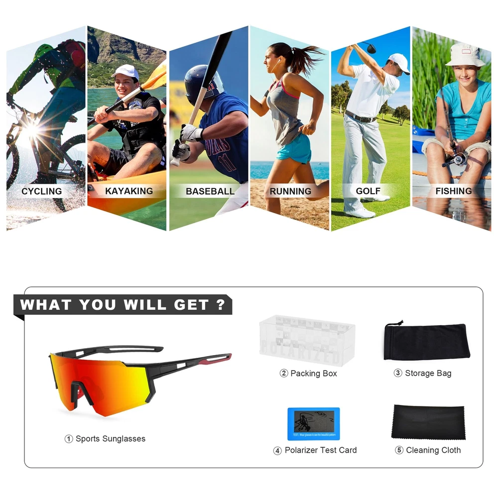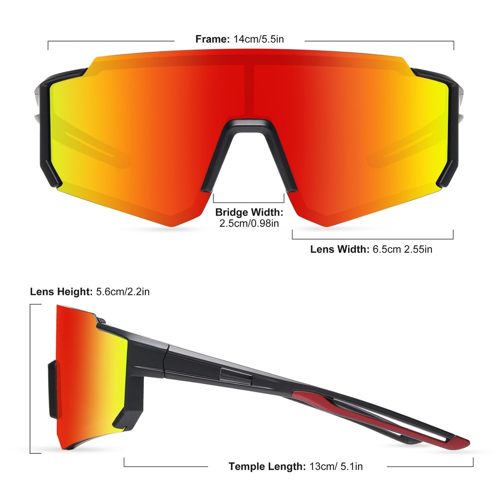 Fashion and stylish design, with rich color combinations of frames and lens. High-quality polarized lenses can show the most reality and colorful world to you. Increasing contrast and deepening perception, ideal for partly cloudy to sunny conditions, Lightweight design of our sunglasses are ideal for motorcycle and cycling bicycle, driving, running, fishing, racing, skiing, climbing, trekking or other outdoor activities. 100% UV400 protective for this sports sunglasses, blocks 100% harmful UVA & UVB Rays.