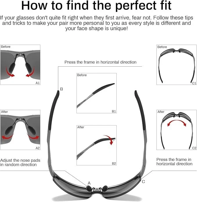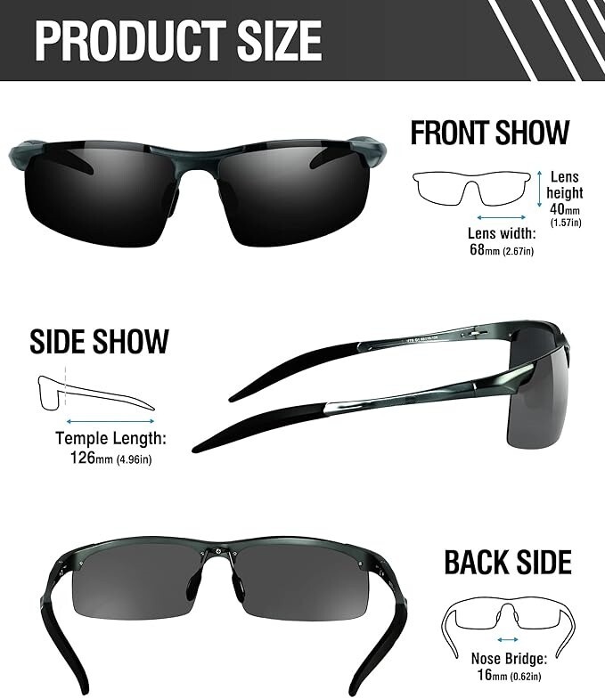 【Lentes polarizadas TAC】El revestimiento de protección UV400 filtra eficazmente la radiación UVA y UVB, proporcionando una protección solar completa. Elimina la luz reflejada o dispersa para restaurar la verdadera percepción del color. Las lentes de triacetato polarizadas TAC cuentan con cualidades como resistencia al impacto, resistencia a los arañazos, diseño liviano y durabilidad. 【Marco de aleación de metal AI-Mg】Fabricadas con marco deportivo de metal Al-Mg, estas gafas de sol son irrompibles y resistentes a la corrosión. Las almohadillas nasales suaves ajustables y la bisagra de metal flexible garantizan un ajuste cómodo, mientras que las puntas de las patillas talladas ofrecen un agarre antideslizante y la capacidad de doblarse en cualquier ángulo. A pesar de su construcción robusta, pesan solo 25 g, lo que las hace extremadamente cómodas de usar. 【Dimensiones del producto】Altura de la lente: 40 mm (1,57 pulgadas) - Ancho de la lente: 68 mm (2,67 pulgadas) - Longitud de la patilla: 126 mm (4,96 pulgadas) - Puente nasal: 16 mm (0,62 pulgadas) - Longitud del marco: 144 mm (5,67 pulgadas). 【Accesorios y paquete completos】Las gafas de sol vienen con un estuche para gafas con un mosquetón para mayor comodidad, una caja de regalo para una presentación elegante, una bolsa de microfibra para un almacenamiento seguro, un paño de limpieza de microfibra para un fácil mantenimiento y una tarjeta de prueba de polarización. Con este paquete cuidadosamente seleccionado, es una idea de regalo maravillosa y práctica para amigos y familiares. 【Varios escenarios de uso】Diseñadas para el hombre moderno, estas gafas de sol polarizadas de semimarco son perfectas para una amplia gama de actividades al aire libre, como andar en bicicleta, conducir, pescar, viajar, hacer senderismo, correr, ir de compras y escalar. Con una variedad de opciones de lentes coloridas, pueden complementar sin esfuerzo diferentes estilos de ropa y servir como un accesorio de moda.