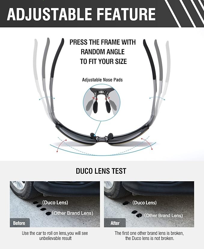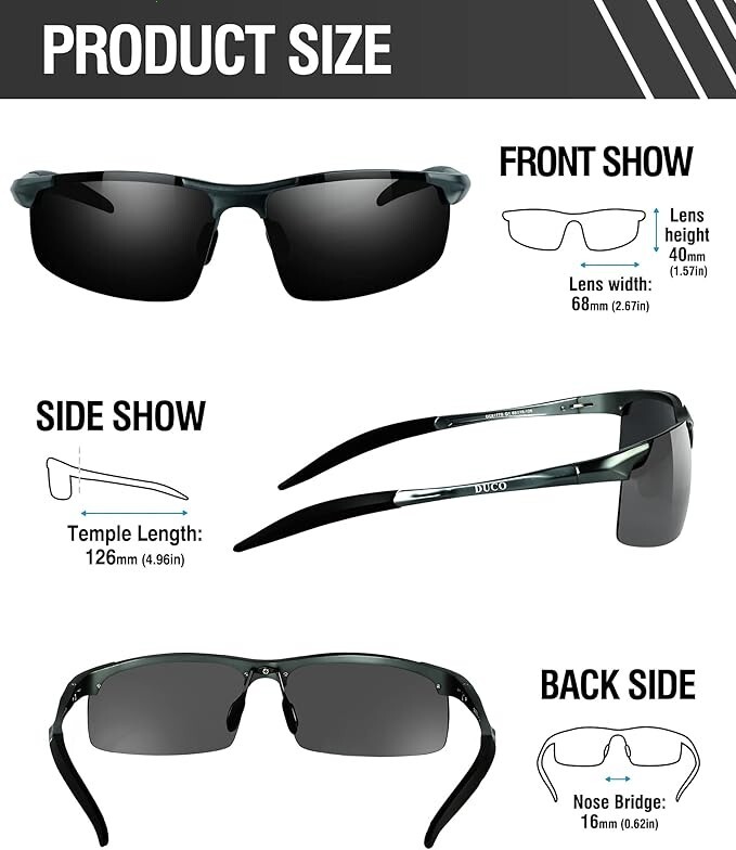 Lente polarizada TAC: el revestimiento de protección UV400 filtra eficazmente la radiación UVA y UVB, proporcionando una protección solar completa. Elimina la luz reflejada o dispersa para restaurar la verdadera percepción del color. Las lentes de triacetato polarizadas TAC cuentan con cualidades como resistencia al impacto, resistencia a los arañazos, diseño ligero y durabilidad. Marco de aleación de metal AI-Mg: hecho de marco deportivo de metal Al-Mg, estos lentes de sol son irrompibles y resistentes a la corrosión. Las almohadillas de nariz suaves ajustables y la bisagra de metal flexible garantizan un ajuste cómodo, mientras que las puntas de las patillas talladas ofrecen un agarre antideslizante y la capacidad de doblarse en cualquier ángulo. A pesar de su construcción robusta, pesan solo 0.88 oz, lo que los hace extremadamente cómodos de llevar. Dimensiones del producto: altura de la lente: 1.575 in (1.57 pulgadas). Ancho de la lente: 2.677 in. Longitud de la patilla: 4.961 in. Puente nasal: 0.630 in. Longitud del marco: 5.669 in. Accesorios y paquete completos: los lentes de sol vienen con una funda para lentes con un mosquetón para mayor comodidad, una caja de regalo para una presentación elegante, una bolsa de microfibra para un almacenamiento seguro, un paño de limpieza de microfibra para un fácil mantenimiento y una tarjeta de prueba de polarización. Con este paquete cuidadosamente seleccionado, es una idea de regalo maravillosa y práctica para amigos y familiares. 【Varios escenarios de uso】Diseñados para el hombre moderno, estos lentes de sol polarizados DUCO con montura semicarca son perfectos para una amplia gama de actividades al aire libre como ciclismo, conducir, pescar, viajar, senderismo, correr, ir de compras y escalar. Con una variedad de opciones de lentes coloridas, pueden complementar sin esfuerzo diferentes estilos de ropa, sirviendo como un accesorio de moda.