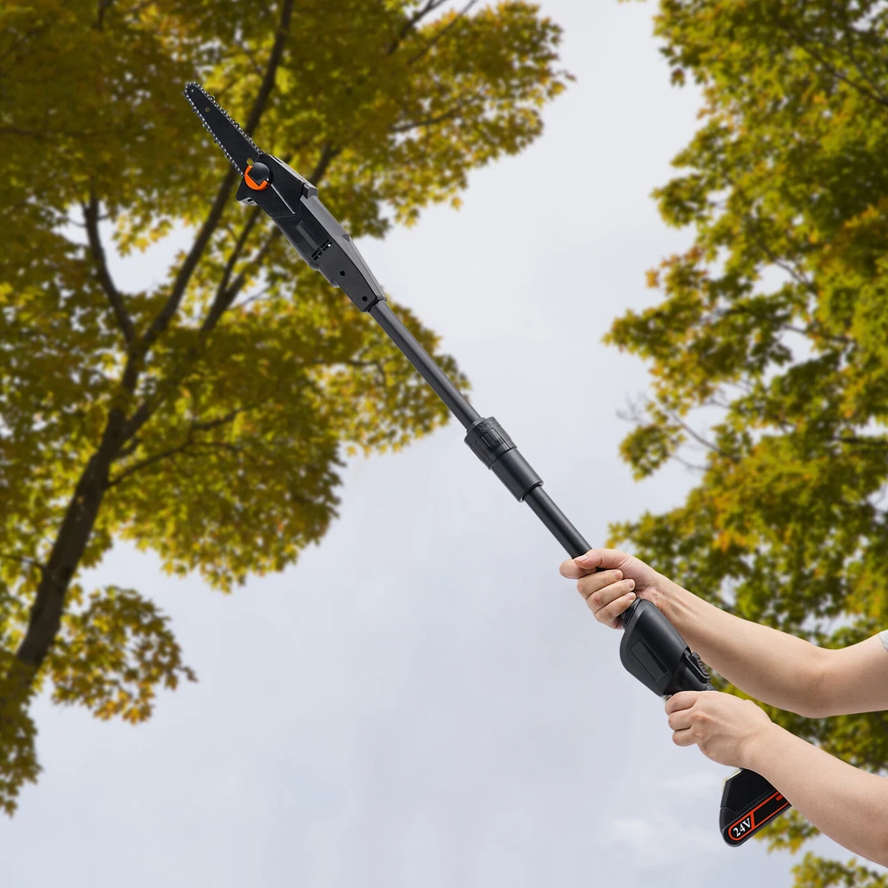 Specification Color: Black Model: F007 Material: Manganese Steel, Alloy Carbon Steel, ABS Process: High-temperature Quenching Power Type: Rechargeable - Lithium Technology Assembly Required: Yes Plug Standard: US Standard Rated Power: 552W Lithium Battery Model: 1500mAh No-load Speed: 4500rpm Saw Chain Speed: 1200m/min / 66ft/s Guide Plate Length: 18cm/7.08in Chain Teeth Pitch: 2.5cm/0.98in Chain Thickness: 15mm/0.59in Input: AC 100-240V 50/60Hz Output: DC21V 1A Charging Time: About 2H Duration: About 0.5H Guide Plate Adjustment Angle: Guide adjustment Angle: cannot be adjusted Gross Weight: 2.8kg/ 6.17 lbs Net Weight: 2.3kg/ 5.07 lbs Base Size: 11.8*7.5 cm/4.64*2.95 in Product Length: 1.25m/4.1ft Package Size: 56*15*16 cm/22.05*5.91*6.3 in Pole Saw Electric Tree Trimmer Pruner Cordless 21V Battery Power & Charger! Description ✳️Description This pole saw is made of high-quality manganese steel saw chain, alloy carbon steel blade, and ABS for long life. The safety lock design can provide you with a higher level of security. The cordless design eliminates the difficulty of jack wiring and the limitation of work caused by tangled wires. It will be your powerful working assistant! ✳️ Specification Color: Black Model: F007 Material: Manganese Steel, Alloy Carbon Steel, ABS Process: High-temperature Quenching Power Type: Rechargeable - Lithium Technology Assembly Required: Yes Plug Standard: US Standard Rated Power: 552W Lithium Battery Model: 1500mAh No-load Speed: 4500rpm Saw Chain Speed: 1200m/min / 66ft/s Guide Plate Length: 18cm/7.08in Chain Teeth Pitch: 2.5cm/0.98in Chain Thickness: 15mm/0.59in Input: AC 100-240V 50/60Hz Output: DC21V 1A Charging Time: About 2H Duration: About 0.5H Guide Plate Adjustment Angle: Guide adjustment Angle: cannot be adjusted Gross Weight: 2.8kg/ 6.17 lbs Net Weight: 2.3kg/ 5.07 lbs Base Size: 11.8*7.5 cm/4.64*2.95 in Product Length: 1.25m/4.1ft Package Size: 56*15*16 cm/22.05*5.91*6.3 in ✳️ Package Included 1 * Pole Saw 1 * Charger 1 * Lithium Battery 1 * Screwdriver 1 * Chain 1 * English Manual 1 * Guide Plate ✳️ Key Features High-quality Material made of high-quality manganese steel saw chain, alloy carbon steel blade, and ABS, with high hardness, high-pressure resistance, and long service life Long pole saw The pole saw (the overall length is 4.1ft) makes tough jobs safer and it doesn't need to rely on unstable ladders to handle overhead work. High-Performance 775 Motor the power of the machine up to 552W, no-load speed up to 4500rpm, and saw chain speed up to 66 ft/s, low noise motor with a quieter and non-choking smoke working environment. High Security The machine can only be started by pressing the safety button and the switch at the same time to prevent accidental start-up High-quality Rechargeable Battery The rechargeable 1500mAh lithium-ion battery can provide you with long use time (half an hour after full charge), avoiding frequent charging Wide Application It is applicable to wood cutting, garden pruning, branch pruning, and shrub pruning, and is widely used in gardens, farms, parks, forests, pastures, forest farms, orchards, and greenhouses High-quality Material: The product is made of high-quality manganese steel saw chain, alloy carbon steel blade, and ABS, with high hardness, high-pressure resistance, and long service life. The deep hardened chain has high wear resistance and sharpness. Easy to Use: Large variable speed switch is easy to press (pressing pressure will control the speed, the more force, the faster the speed). The non-slip handle is ergonomic, so you won't feel fatigued even when holding it for long periods of time. The cord-free design also allows you to be free from wire length restrictions, thus providing you with more freedom of use. Long pole saw: The pole saw (the overall length is 4.1ft) makes tough jobs safer and it doesn't need to rely on unstable ladders to handle overhead work. It can reach high branches and cut them with ease. Efficient Heat Dissipation: Ventilation holes are designed to facilitate heat dissipation, thus ensuring normal motor temperature and effectively extending the product's service life. High Security: The machine can only be started by pressing the safety button and the switch at the same time to prevent accidental start-up. The built-in control circuit board with overload and overheat protection can provide you with safer use. High Efficiency: The high-performance 775 motor enables the power of the machine up to 552W, no-load speed up to 4500rpm, and saw chain speed up to 66 ft/s, which brings you efficient trimming. And the low noise motor can provide you with with a quieter and non-choking smoke working environment. High-quality Battery: The rechargeable 1500mAh lithium-ion battery can provide you with long use time (half an hour after full charge), avoiding frequent charging. It also has overload and temperature protection to provide safer use. Easy to Carry: The detachable design and lightweight of 5.07 lbs makes it easy to carry. You can take it with you wherever you need to work. ✳️ Details Knob Adjustment: Fixing the sprocket cover and adjusting the chain tightness do not require tools, the built-in knob can help you to install and adjust quickly. ✳️ Application It is applicable to wood cutting, garden pruning, branch pruning, and shrub pruning, and is widely used in gardens, farms, parks, forests, pastures, forest farms, orchards, and greenhouses. ✳️ Notes 1. Please pay attention to the tightness of the chain at all times. It is normal for the chain to slip after the operation. 2. When charging, it is normal for the charger and battery to heat slightly. 3. Please do not use damaged batteries or disassemble chargers or batteries. 4. The battery will explode when it is put on fire. Do not heat the battery! 5. With the gradual decrease of battery power, it is normal for the ability of the shearing diameter to decrease. 6. If the battery is not used for a long tim