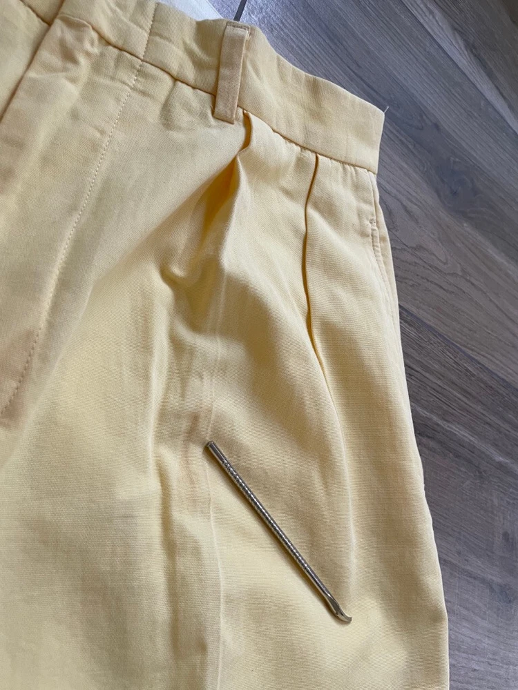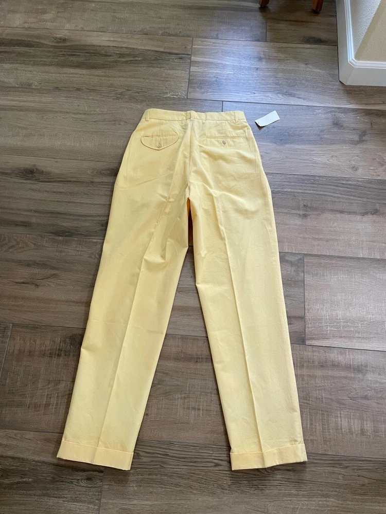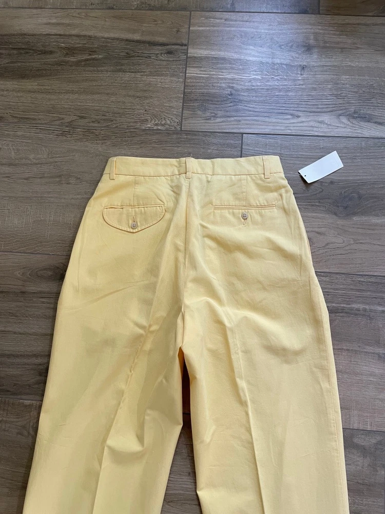 Polo Golf Ralph Lauren Pants Style: Pleated Front Casual Trouser Color: Yellow (brighter color on photos is closer match) Features: Slit and flap button close back pockets Fabric: 100% Cotton Approximate flat measurements: Waist 15 1/2", Rise 13", Inseam 35 1/2" Condition: New with tags/ flaws = with 2 areas of spots shown in last photos that I have not attempted to wash out due to tags Tag Size: 32x36