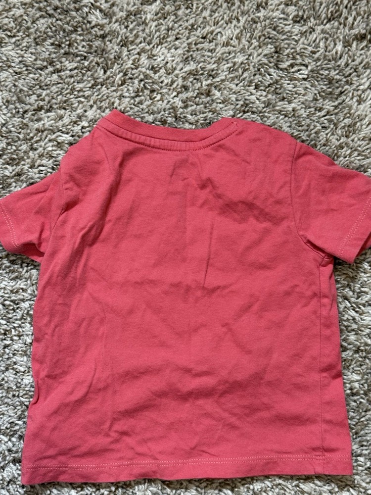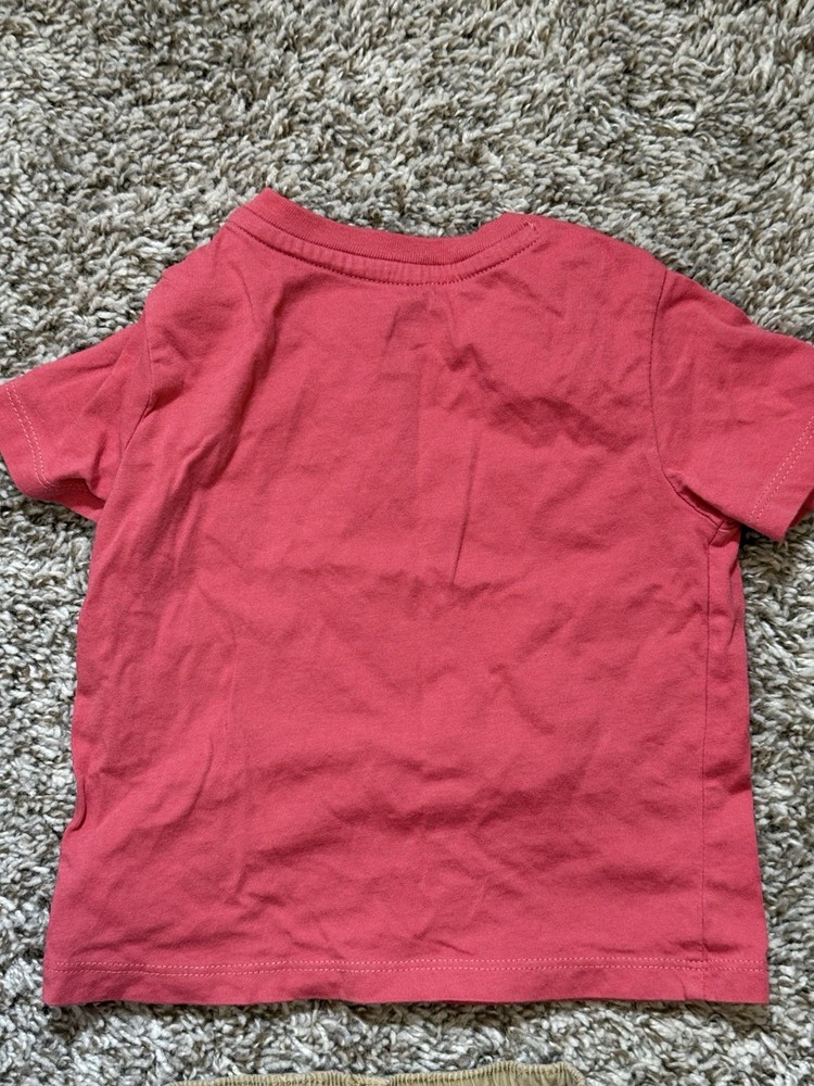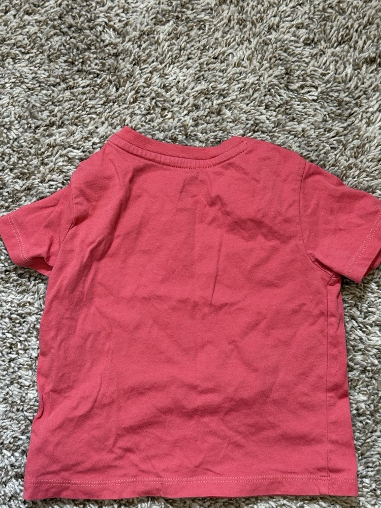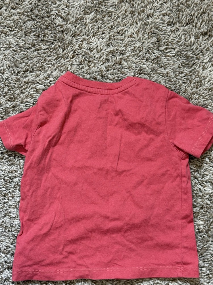 This is a pre-owned Polo Ralph Lauren baby boy short-sleeve t-shirt in a size 12 Months. The shirt features a solid coral or salmon pink color with a signature navy blue embroidered pony logo on the left chest. Designed for easy dressing, it includes a two-snap placket at the left shoulder. The garment is made from 100% soft cotton jersey fabric and has a standard crew neckline. It is in good used condition with no major flaws noted.