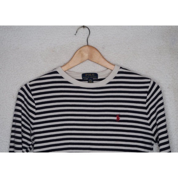 In good condition with slight sleeve wear! Size: Large (14-16) 100% Cotton Approximate Measurements: Shoulder to hem: 21.5" Pit to pit: 18" Notes: polo ralph lauren boys striped long sleeve shirt navy white stripe red pony logo preppy classic crewneck cotton shirt school casual top designer kids clothing classic polo kids Bn 12