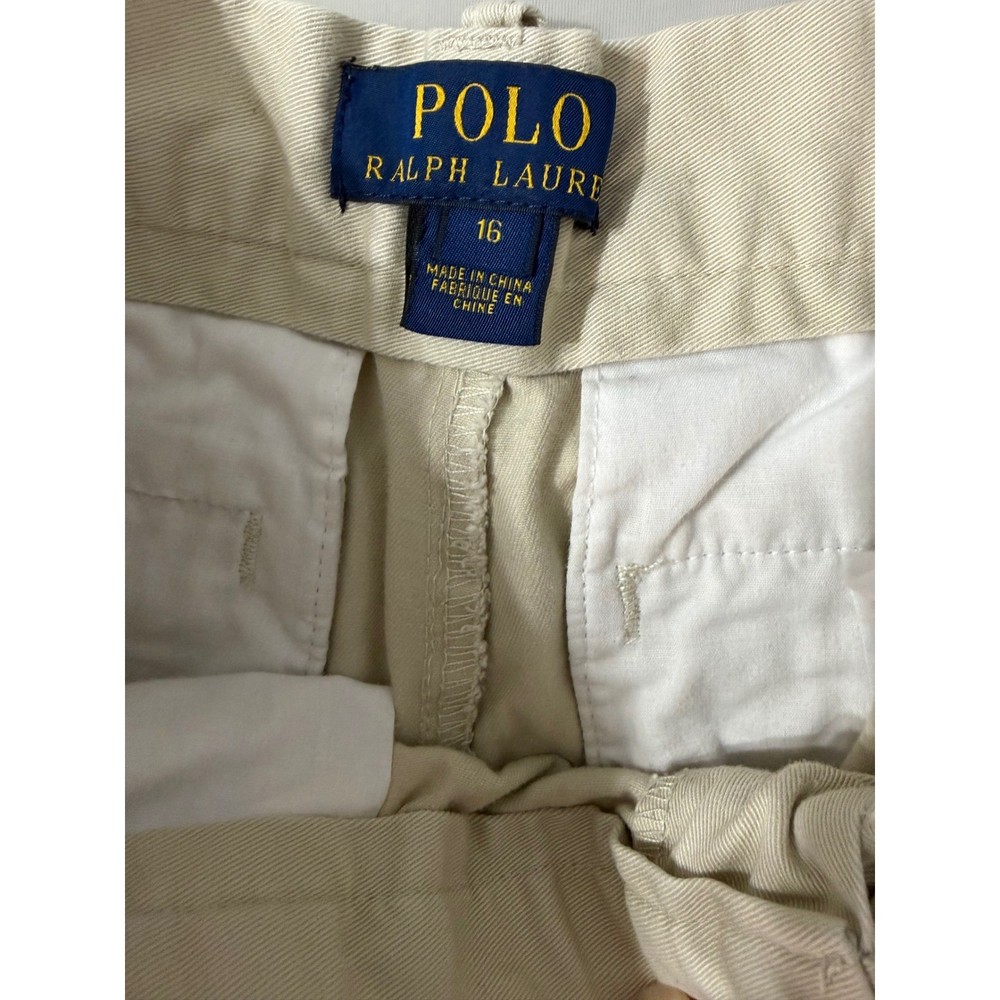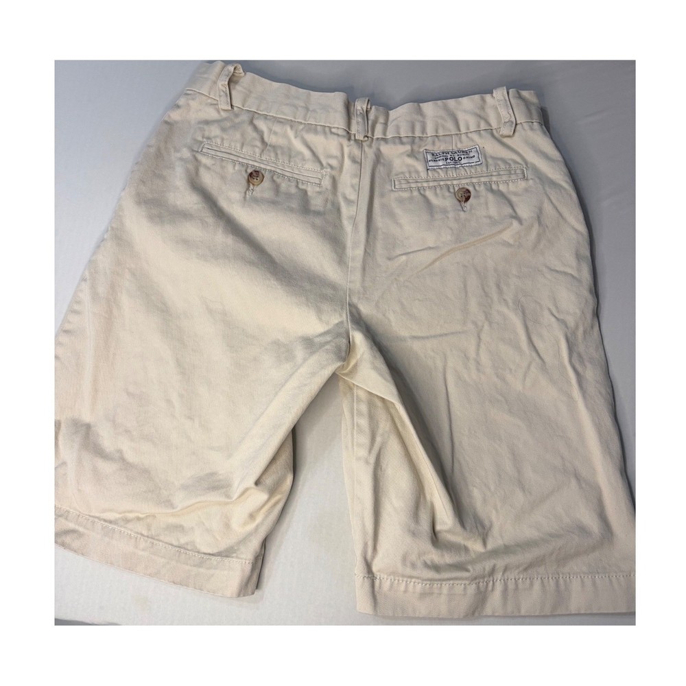 Polo Ralph Lauren classic chino shorts in a versatile beige khaki. Crafted from durable cotton twill, these shorts feature a flat front design with a zip fly and button closure. They include two side slit pockets and two button-through back welt pockets for a clean, traditional look. A woven "Classic Polo Chino" label is featured above the back right pocket, adding a signature touch to this preppy essential. Ideal for casual outings or school uniforms. Note that there is a faint mark on the front left leg as shown in photos.