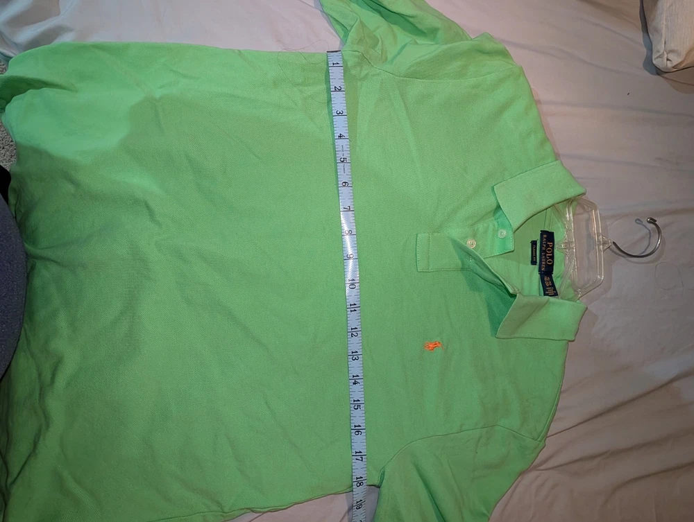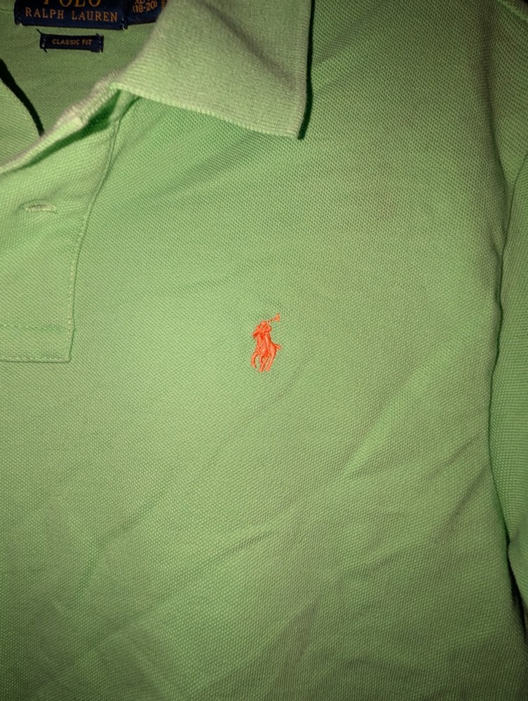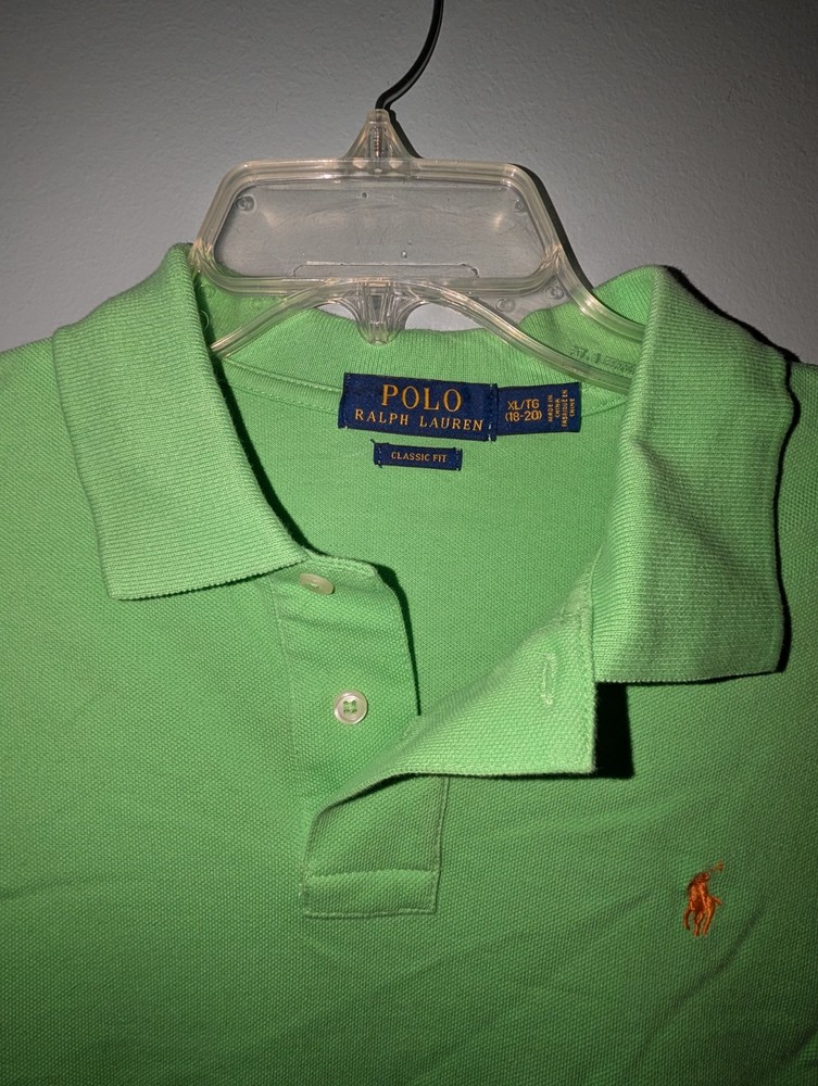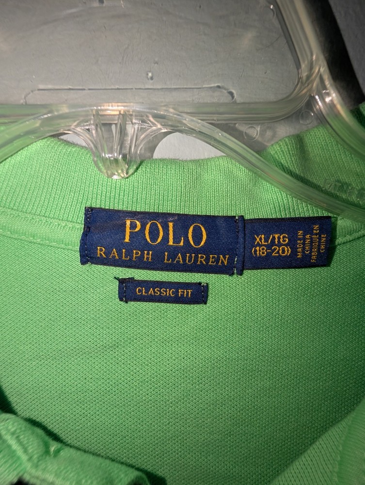 The Polo Ralph Lauren Boys Classic Fit Polo Shirt in green, size XL 18-20, is a stylish and versatile top perfect for boys. Made from 100% cotton, this polo shirt features a solid pattern, short sleeves, a collared neckline, and a button closure. The classic fit and pullover style make it comfortable for casual occasions during the summer, fall, and spring seasons. With the renowned Polo Ralph Lauren brand, this shirt combines quality, timeless design, and a touch of boyish charm.