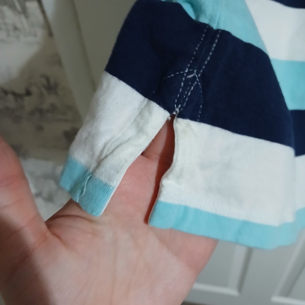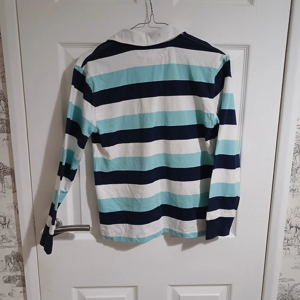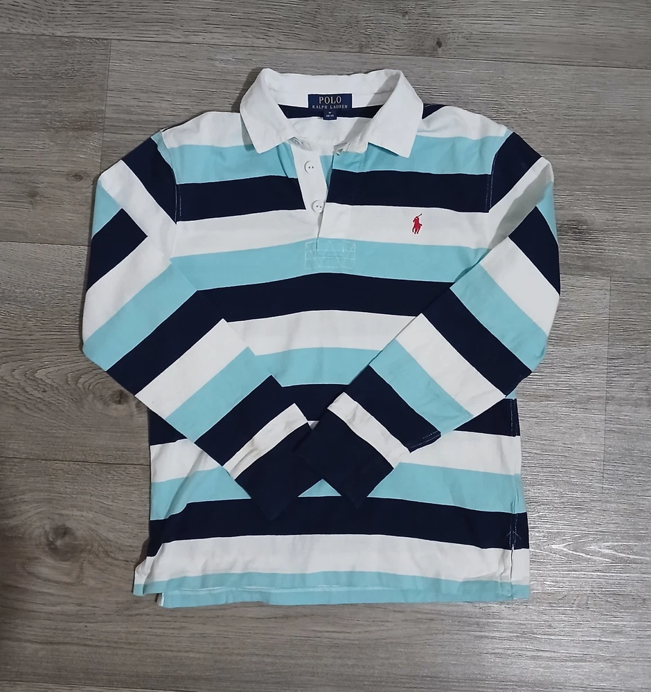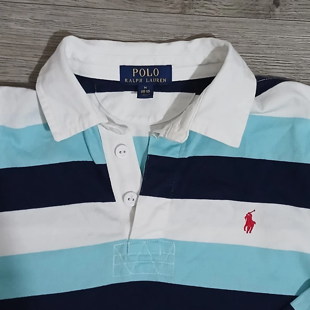 The Quintessential Ralph Lauren Look Dress him in a timeless classic. This Polo Ralph Lauren Iconic Rugby Shirt perfectly balances sporty energy with a polished, Ivy League aesthetic. Whether for a family photo, a school event, or a casual weekend, this shirt is built to look sharp and last through every adventure. Why You'll Love It: Signature Style: Features a crisp white twill collar and a vibrant red embroidered Pony on the chest. Nautical Vibes: Bold horizontal stripes in Navy and Aqua/Light Blue for a fresh, clean look. Built to Last: Crafted from heavy-duty 100% cotton jersey with a hidden rubber-button placket designed to handle wear and tear. Comfortable Fit: Ribbed cuffs and a vented hem allow for easy movement without losing shape. Condition Note: This shirt is in good condition. I have included close-up photos of a couple of very small, faint marks to ensure you know exactly what you’re receiving. Please review all images to see the high quality of the fabric. Verified Flat Lay Measurements: Shoulder to Shoulder: 16" Pit to Pit (Chest): 17" Length: 22" (Top of shoulder to hem)