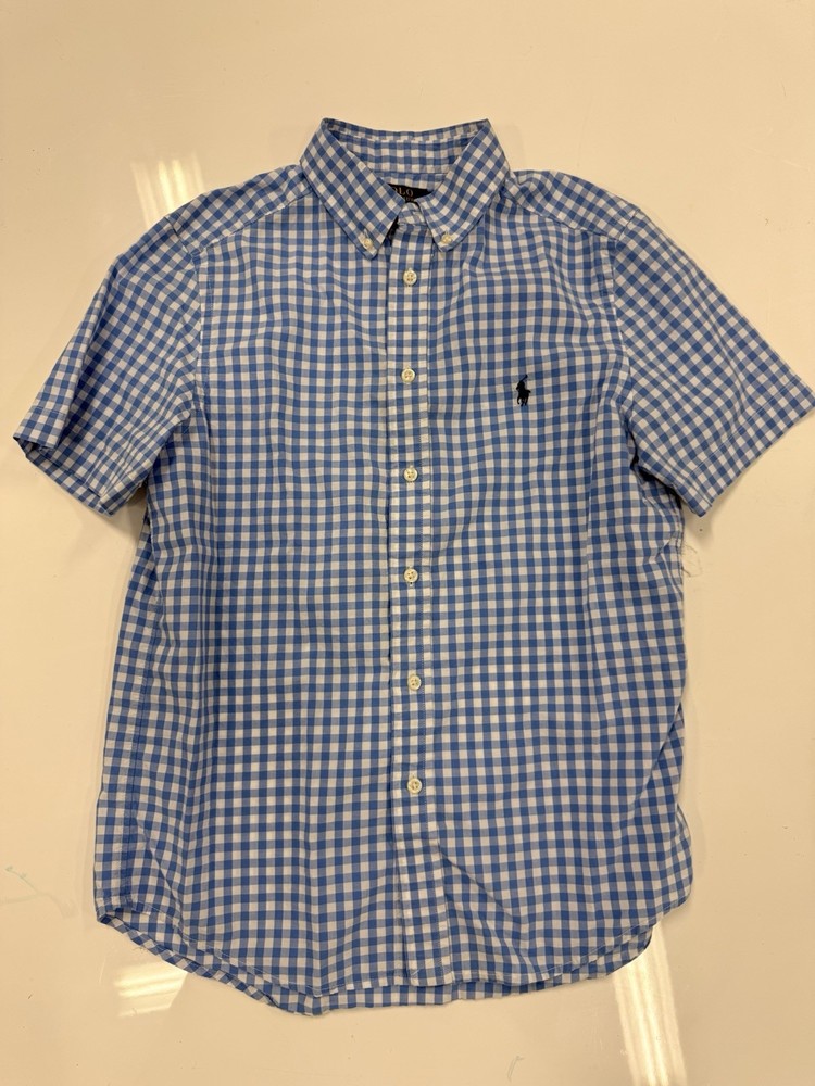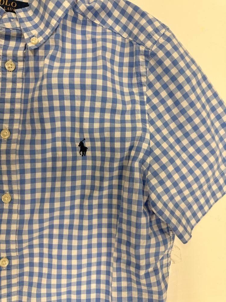 The Polo Ralph Lauren Boys Shirt in size large (14/16) is a classic and stylish addition to any young boy's wardrobe. Made from comfortable cotton knit fabric, this short sleeve button-up shirt features a solid blue color with a collared neckline and the signature Polo Ralph Lauren logo accent. Perfect for casual occasions in the summer, fall, or spring, this shirt is machine washable and designed for a regular fit. The timeless design and quality brand make it a versatile piece that can be worn for various activities and school events.