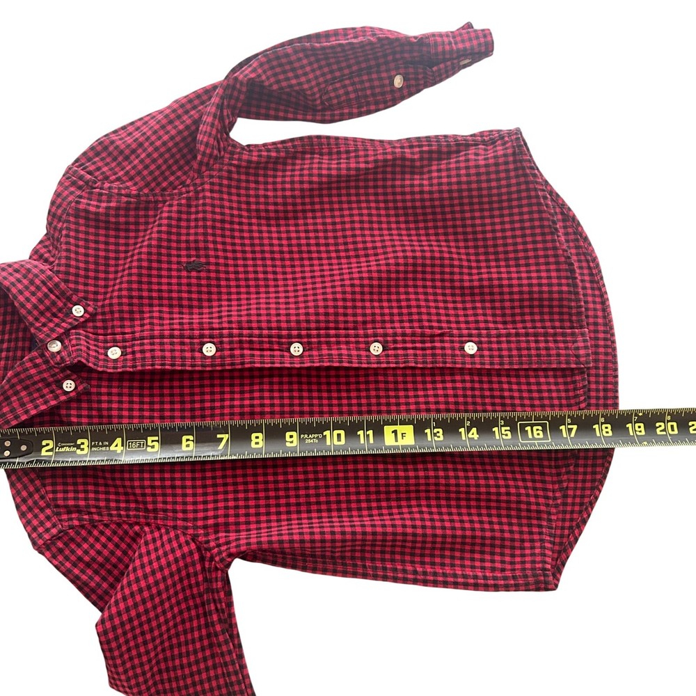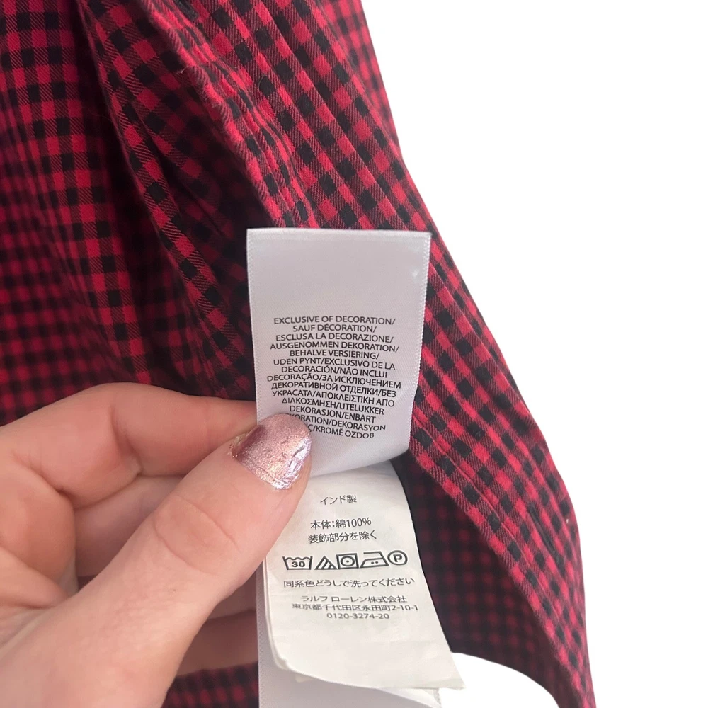 Polo Ralph Lauren long-sleeve button-down shirt in a classic red and black gingham pattern. Crafted from 100% cotton, this sport shirt features a button-down collar, buttoned cuffs, and the signature embroidered pony logo on the chest. The timeless checkered design makes it a versatile piece for both casual and semi-formal occasions. Measurements: • Pit to Pit: 13" (26" doubled) • Length: 18.5" Keywords: Gingham, Checkered, Preppy, Classic, Cotton, Sport Shirt, Holiday, School, Casual, Traditional, Timeless, Buffalo Check Brand: Polo Ralph Lauren Product Type: Button-Down Shirt Material: 100% Cotton Color: Red, Black Pattern: Gingham/Check Sleeve Length: Long Sleeve Collar: Button-Down Closure: Button Front Accents: Embroidered Logo Country of Manufacture: India Style: BDPPC LS SPT-SHIRTS Season: All Season All items come from a smoke free, golden retriever dog friendly home. All of items unless NWT or Dry Clean Only are washed with Tide. We try our best to disclose any flaws with items, if we miss something please reach out and let us know.