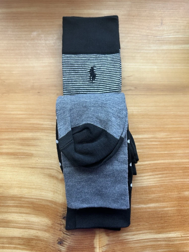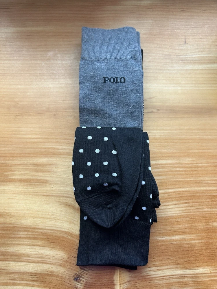 Elevate your sock game with these stylish Polo Ralph Lauren dress socks. Made of a comfortable blend of polyester and spandex, these mid-calf socks feature a polka dot pattern in gray and black, adding a touch of classic elegance to your outfit. Perfect for any occasion, from casual to formal, these socks are lightweight, breathable, and machine washable for easy care. With a size of 10-13 and a regular size type, these socks are perfect for men who love to walk, golf, or dance. The socks also feature the iconic Polo Ralph Lauren logo, adding a touch of luxury to your look. Get ready to rock any season, whether it's winter, summer, fall, or spring.