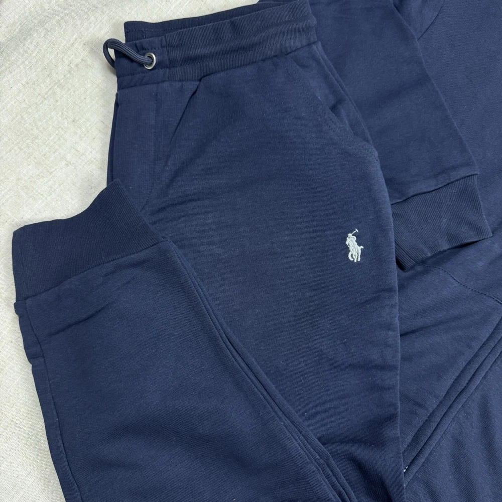Elevate your activewear collection with this two-piece Polo Ralph Lauren tracksuit in a stunning Navy blue color. The set includes a hoodie and joggers, both made of comfortable and lightweight fleece material. The pullover closure and adjustable waist ensure a perfect fit for any occasion, whether it's a casual day out or a formal event. The tracksuit features a solid pattern with accents of a zip and the iconic Ralph Lauren logo. It's machine washable and easy to care for, making it a perfect choice for all seasons. The set is ideal for various activities, including cycling, running, gym training, and more. Get ready to look stylish and comfortable in this Ralph Lauren tracksuit.