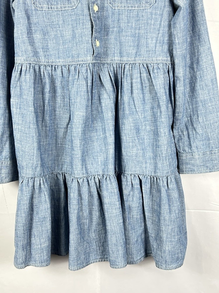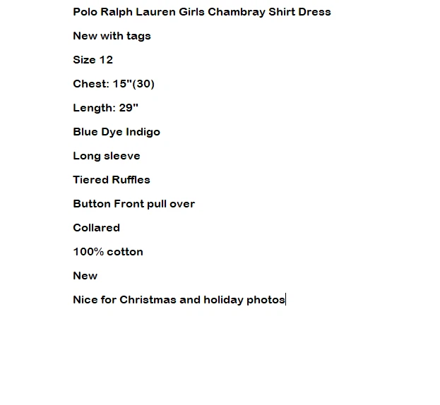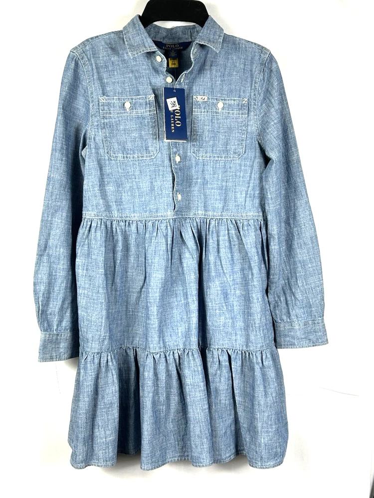 Polo Ralph Lauren Girls Chambray Shirt Dress New with tags Size 12 Chest: 15"(30) Length: 29" Blue Dye Indigo Long sleeve Tiered Ruffles Button Front pull over Collared 100% cotton New Nice for Christmas and holiday photos