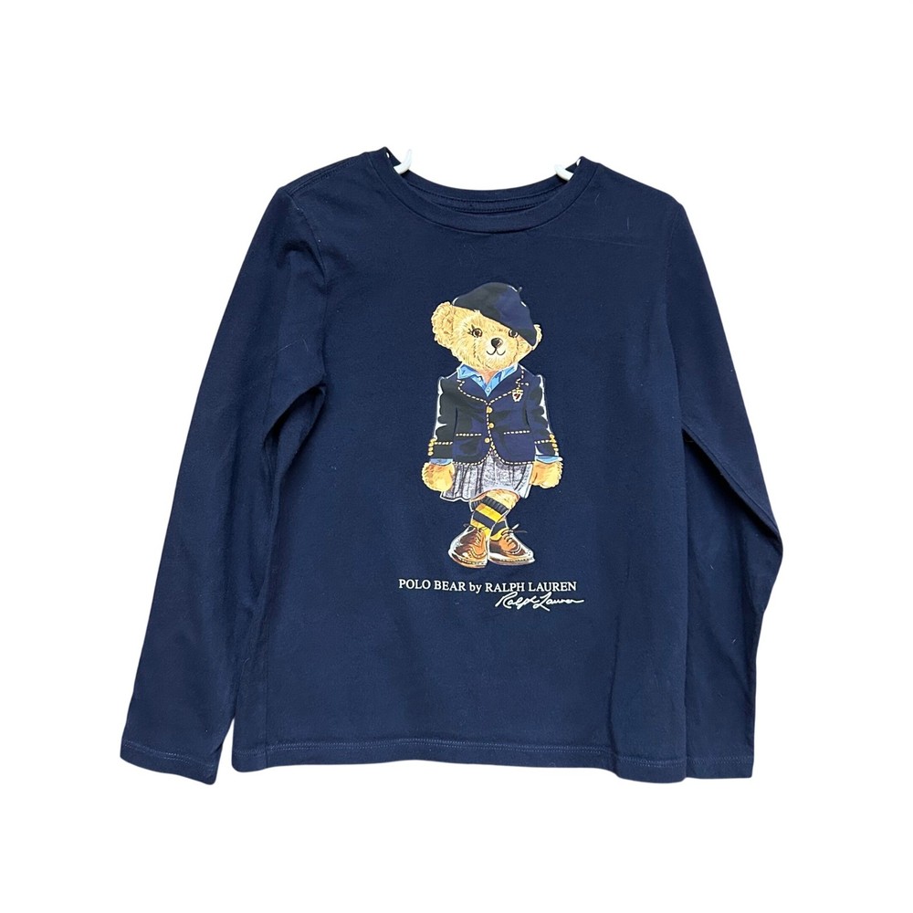 Polo Bear cotton long-sleeve tee showcases the iconic mascot in a sophisticated prep school-inspired outfit, complete with a blazer, beret, and pleated skirt. Crafted from soft washed cotton jersey, this navy blue top offers a comfortable crewneck silhouette and a classic straight hem. The detailed graphic print is accented by the "Polo Bear by Ralph Lauren" signature script for an authentic heritage look. Brand: Ralph Lauren Line: Polo Bear Size: Small (7) Color: Navy Blue Material: 100% Cotton Sleeve Length: Long Sleeve Neckline: Crew Neck Pattern: Graphic Print Style: Preppy Fit: Regular Department: Girls Keywords: Preppy, Collegiate, Academic, School Girl, Classic, Designer, Iconic, Mascot, Teddy Bear, Navy, Fall Fashion, Back to School All items come from a smoke free, golden retriever dog friendly home. All of items unless NWT or Dry Clean Only are washed with Tide. We try our best to disclose any flaws with items, if we miss something please reach out and let us know.