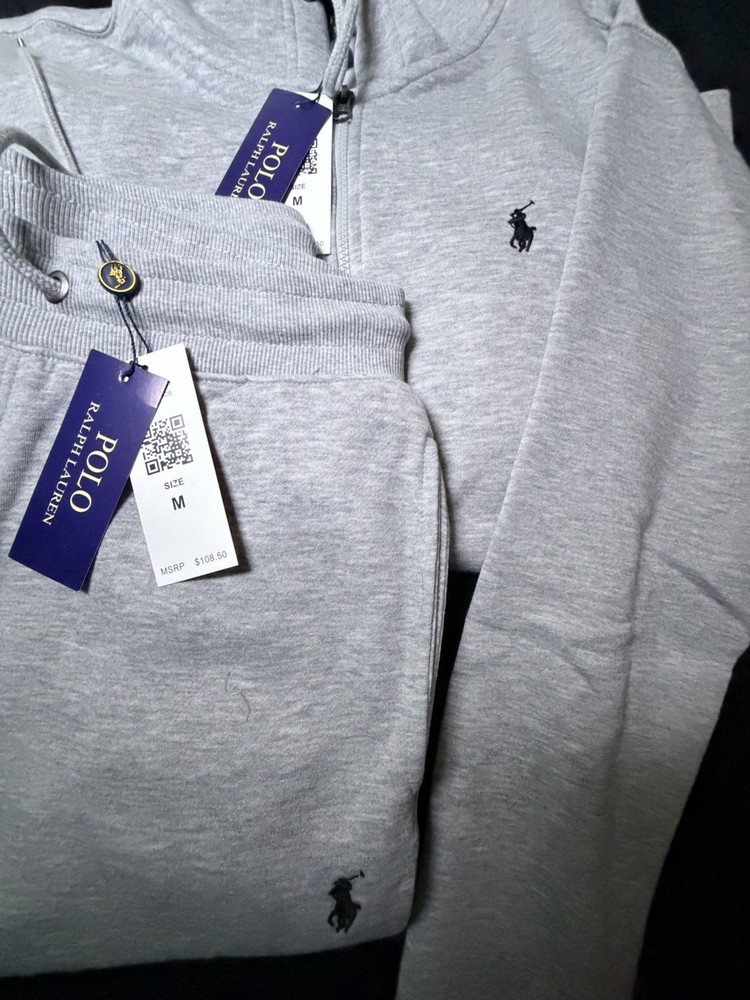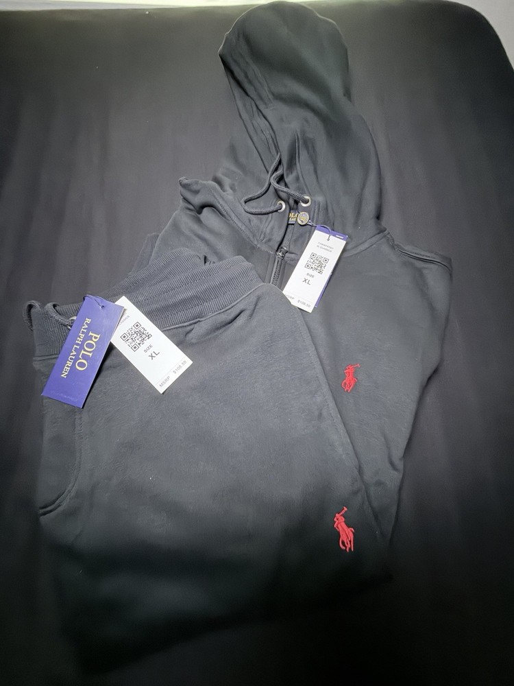 The Polo Ralph Lauren Gray & Black Tracksuit Set includes a stylish hooded hoodie and matching pants, perfect for men in sizes M,L, XL, and XXL. Made from a comfortable cotton blend material, this 2-piece set features a solid pattern with a zip and drawstring closure. The set is designed for activewear and casual occasions, with accents like the Polo Ralph Lauren logo and a tapered leg style. With a hooded neckline, pockets, and drawstring features, this sweatsuit is ideal for gym training in the winter, fall, and spring seasons. 100 cotton