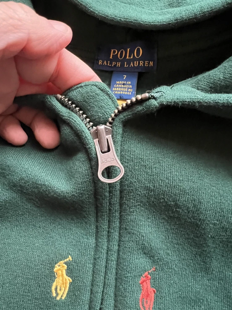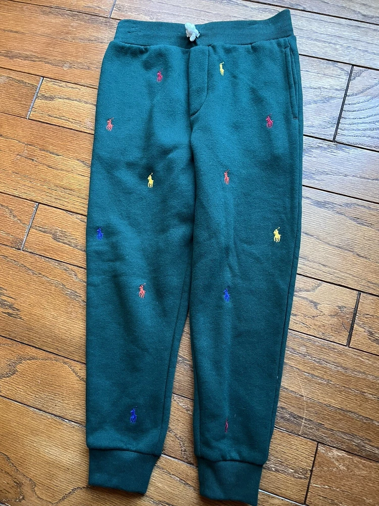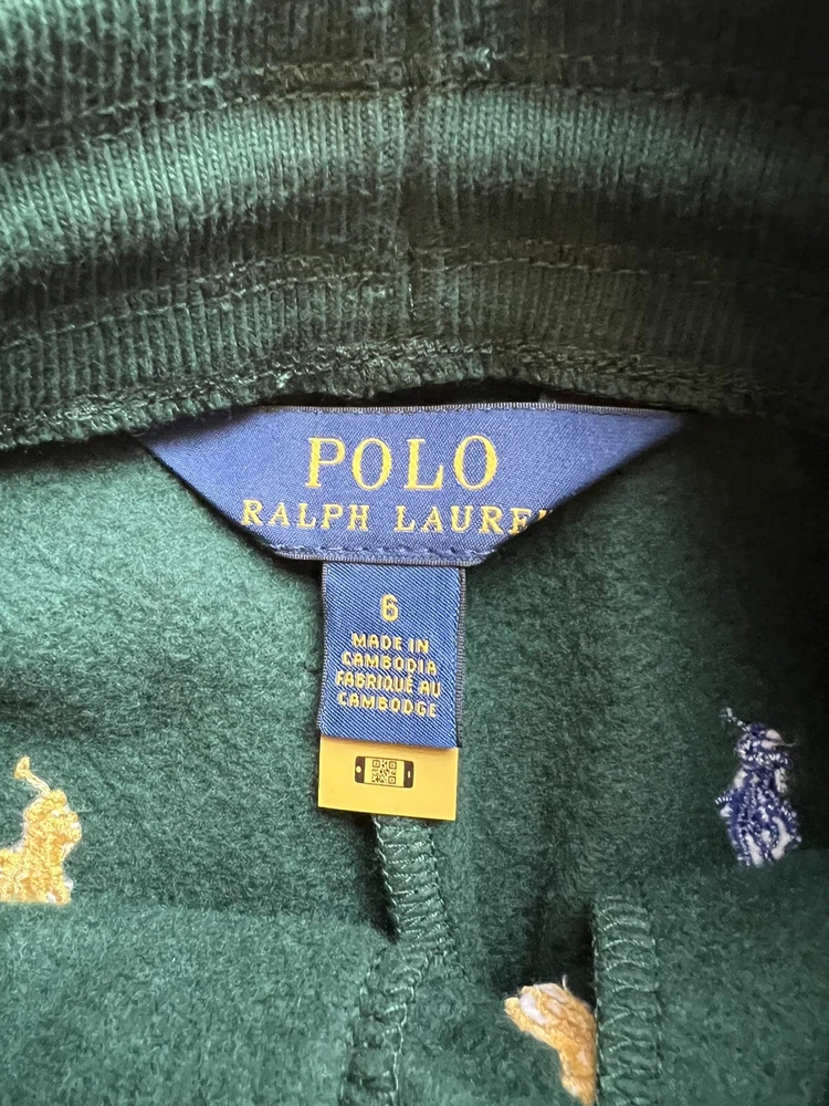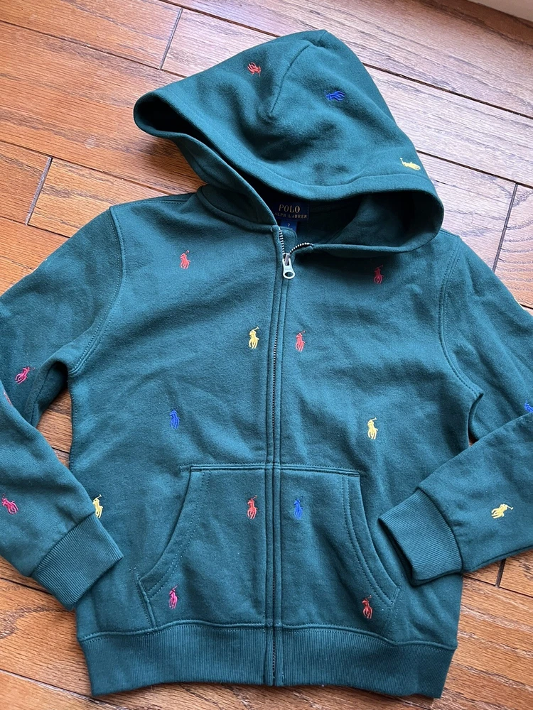 This soft fleece zip front hoodie and jogger pants set are green with multicolor Polo ponies embroidered all over. Size 7 hoodie and size 6 pants. EUC.