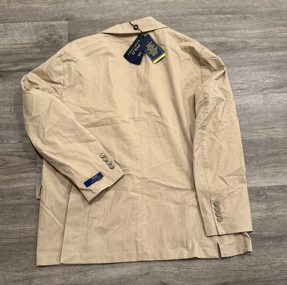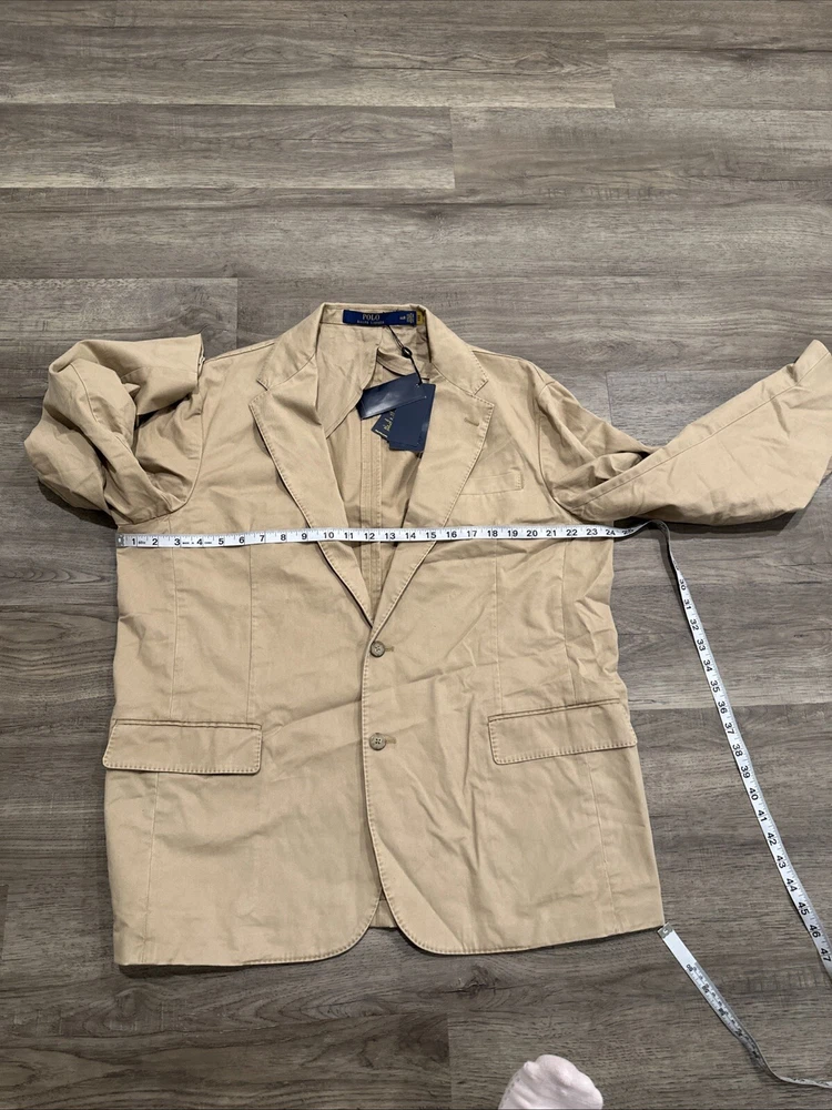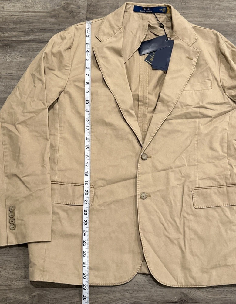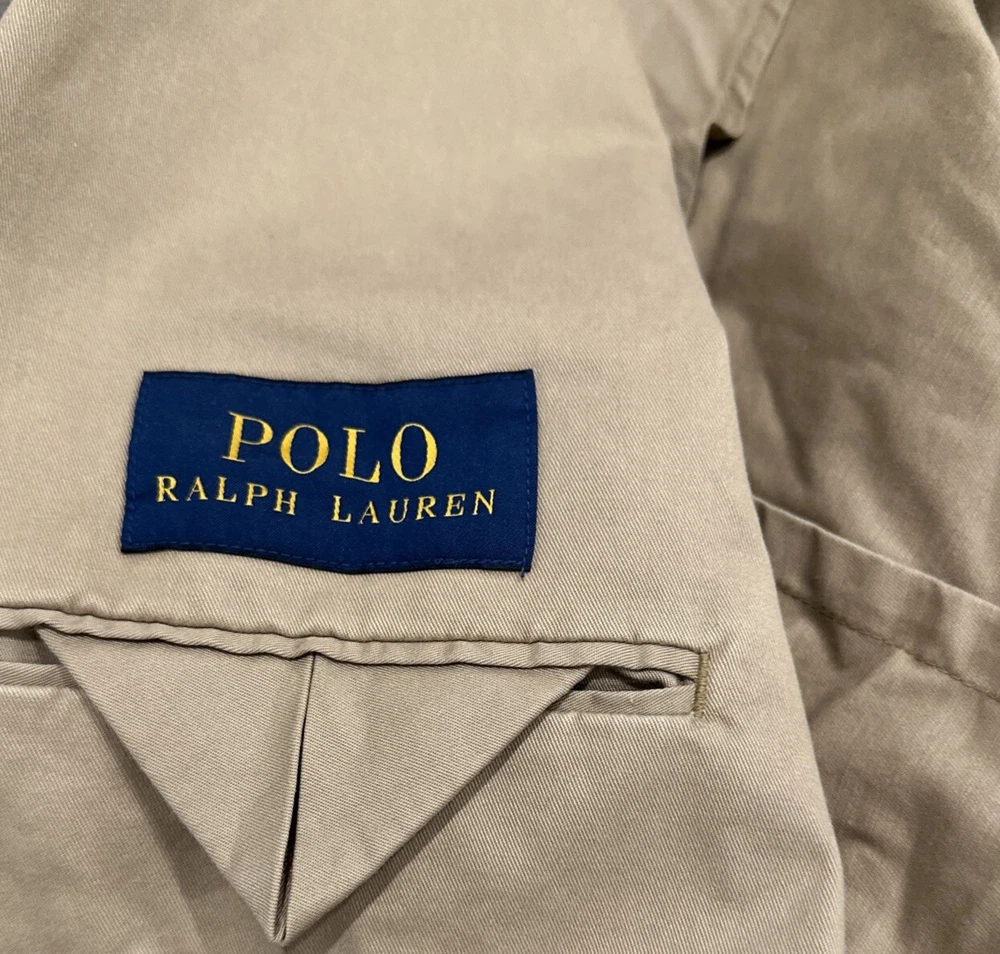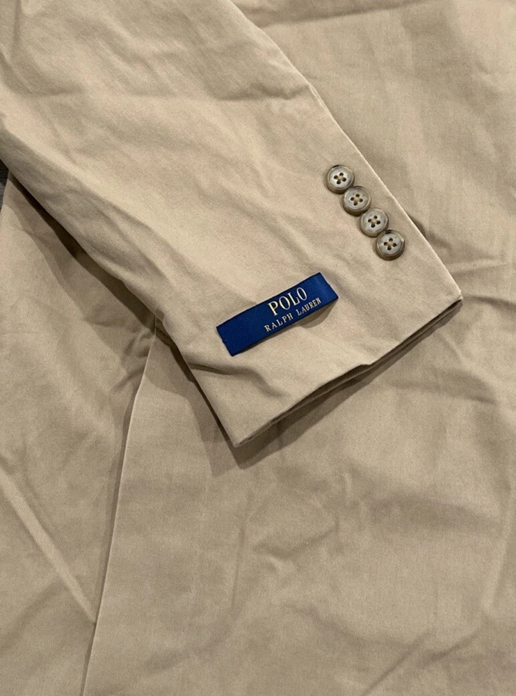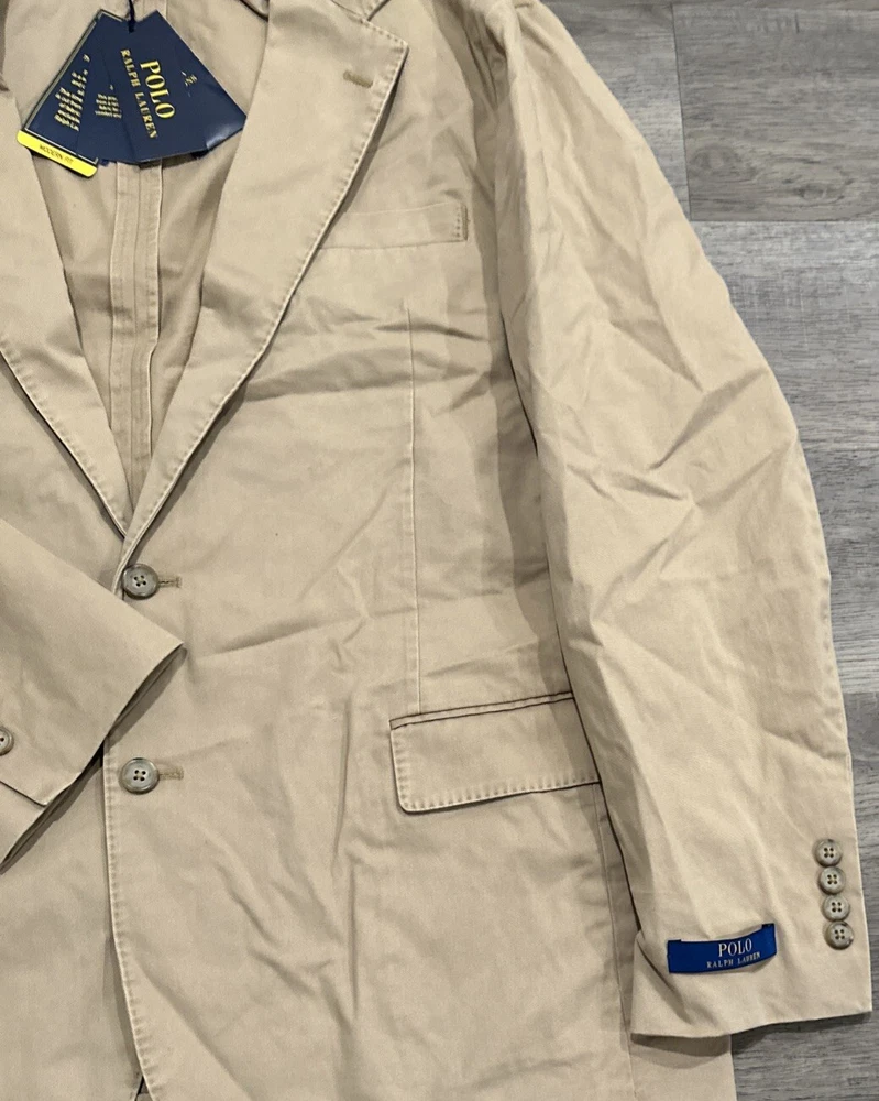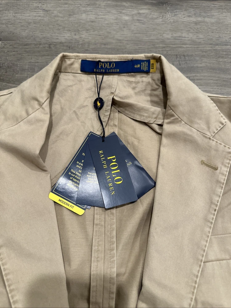 This Polo Ralph Lauren jacket is a versatile piece that can be worn for a variety of occasions. The jacket is a modern stretch chino blazer in khaki, with a solid pattern and a beige color. It features a notch lapel style, a single-breasted cut, and a two-button front button style. The jacket has a regular fit and is available in size 46R. The jacket is perfect for parties, cocktails, business events, and formal occasions. It is made of high-quality materials and is designed to last. The jacket is easy to care for and should be dry cleaned only. This Polo Ralph Lauren jacket is a classic and modern piece that will make you look sharp and stylish.