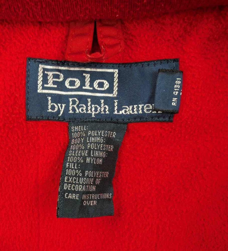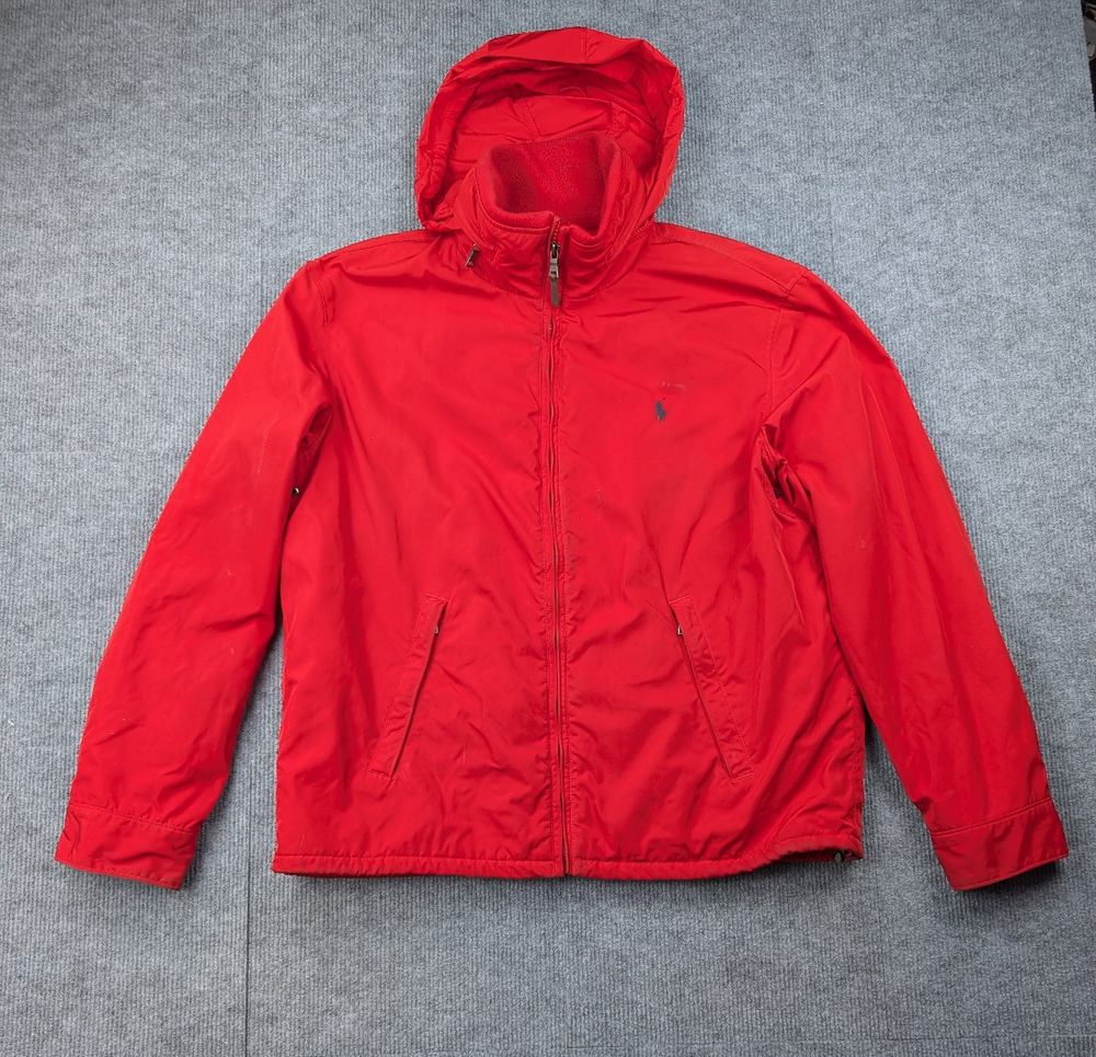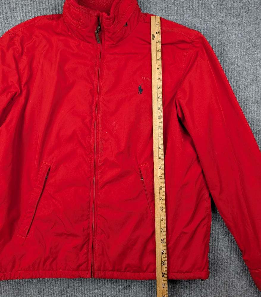 Brand: Polo Ralph Lauren Department: Men Size: L Color: Red Style: Windbreaker Jacket Type: Jacket Outer Shell Material: Polyester Lining Material: Fleece Closure: Zip Features: Full zip, pockets, fleece lined Occasion: Casual, Outdoor Pattern: Solid Country/Region of Manufacture: Bangladesh Condition: Pre-owned