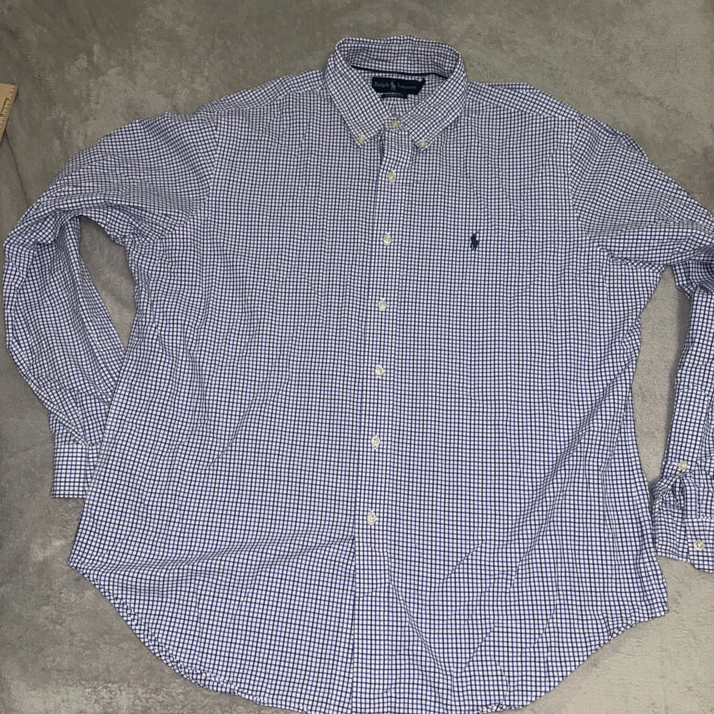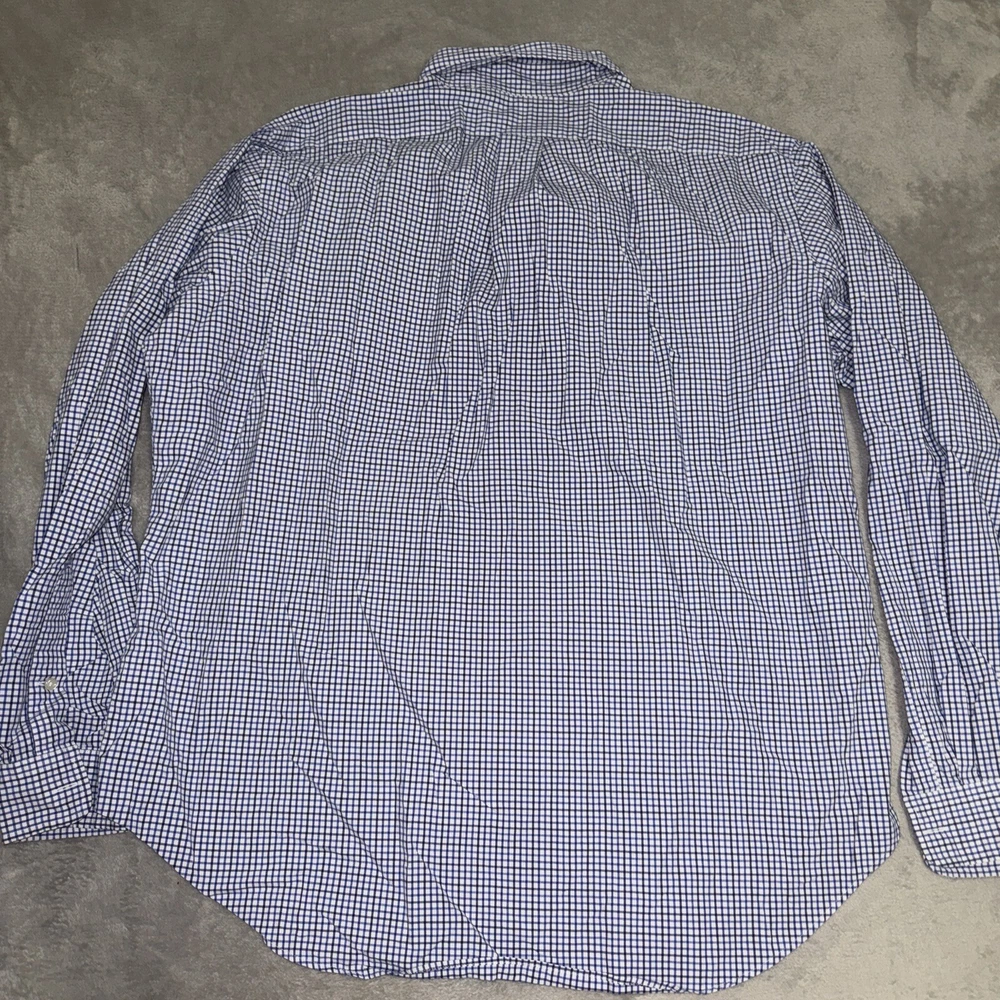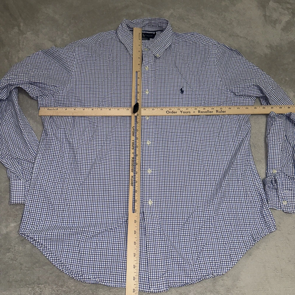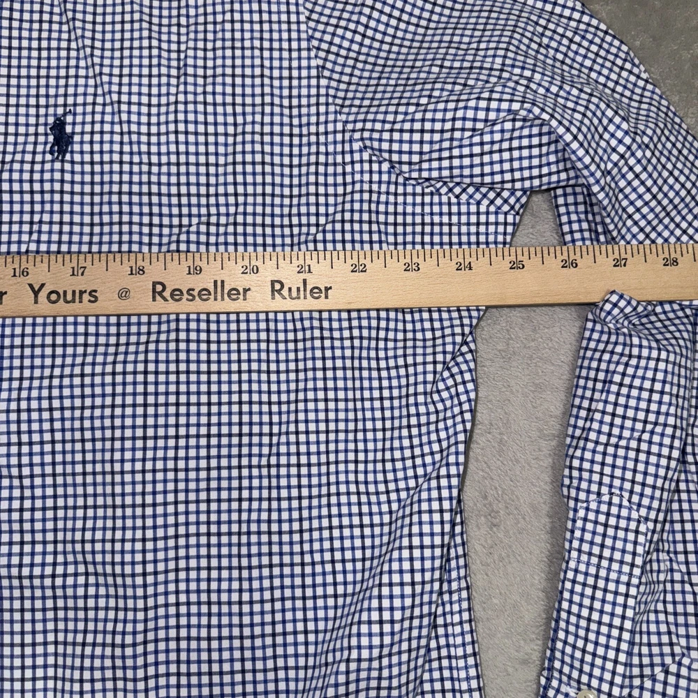 This Polo Ralph Lauren shirt is a classic fit with a blue check pattern. It features long sleeves, a collared neckline, and a button closure. The shirt is made of cotton and is machine washable. It has a chest size of 53 inches and is an XL size. The shirt is suitable for various occasions such as travel, parties, casual outings, workwear, and business meetings. It has embroidered accents and button-down collar style. The shirt is perfect for men who prefer a classic fit and is a great addition to any wardrobe.