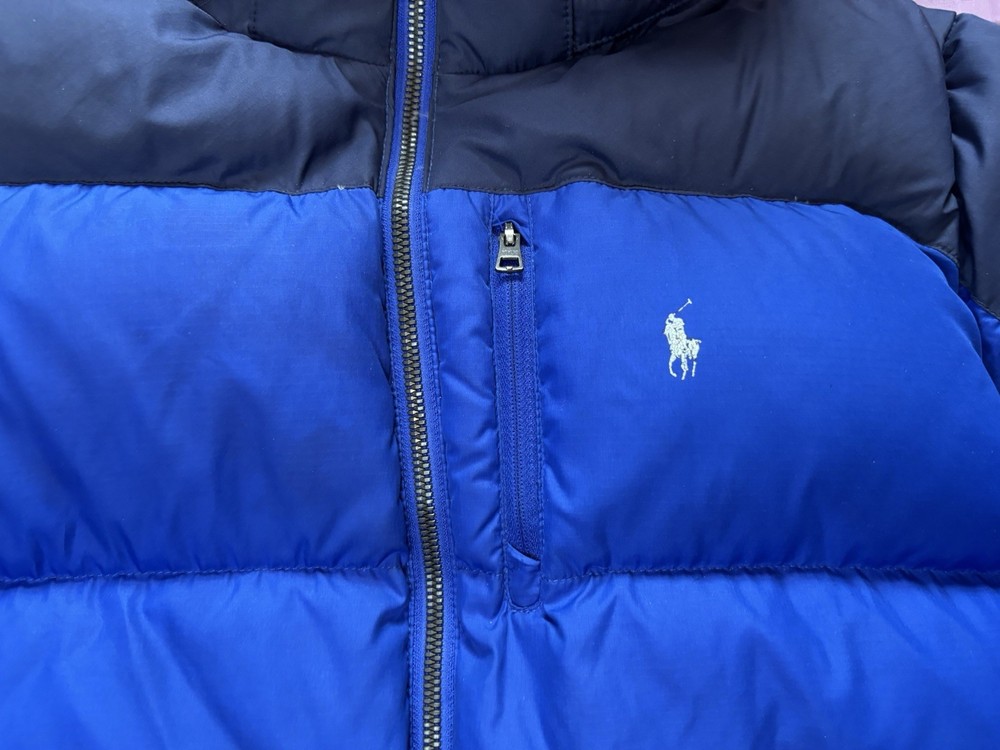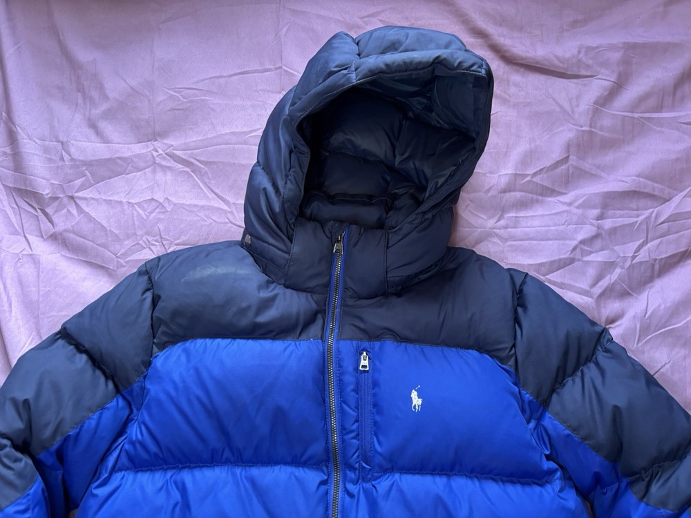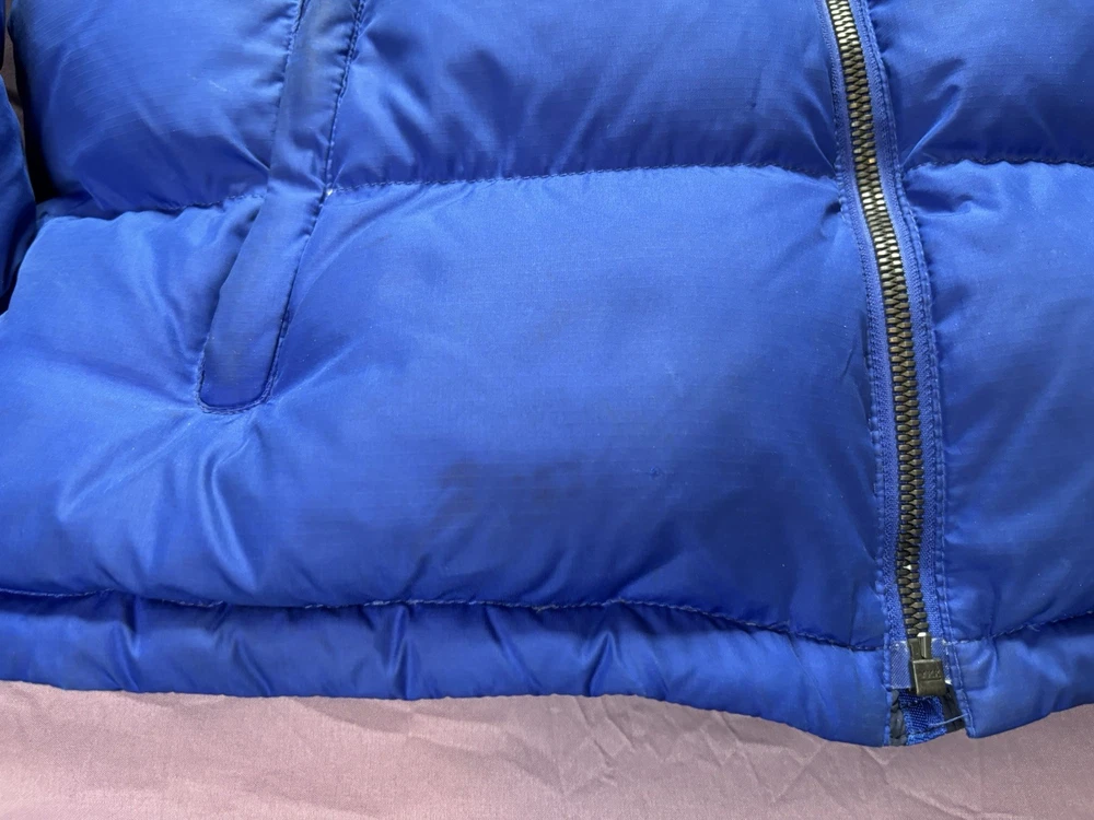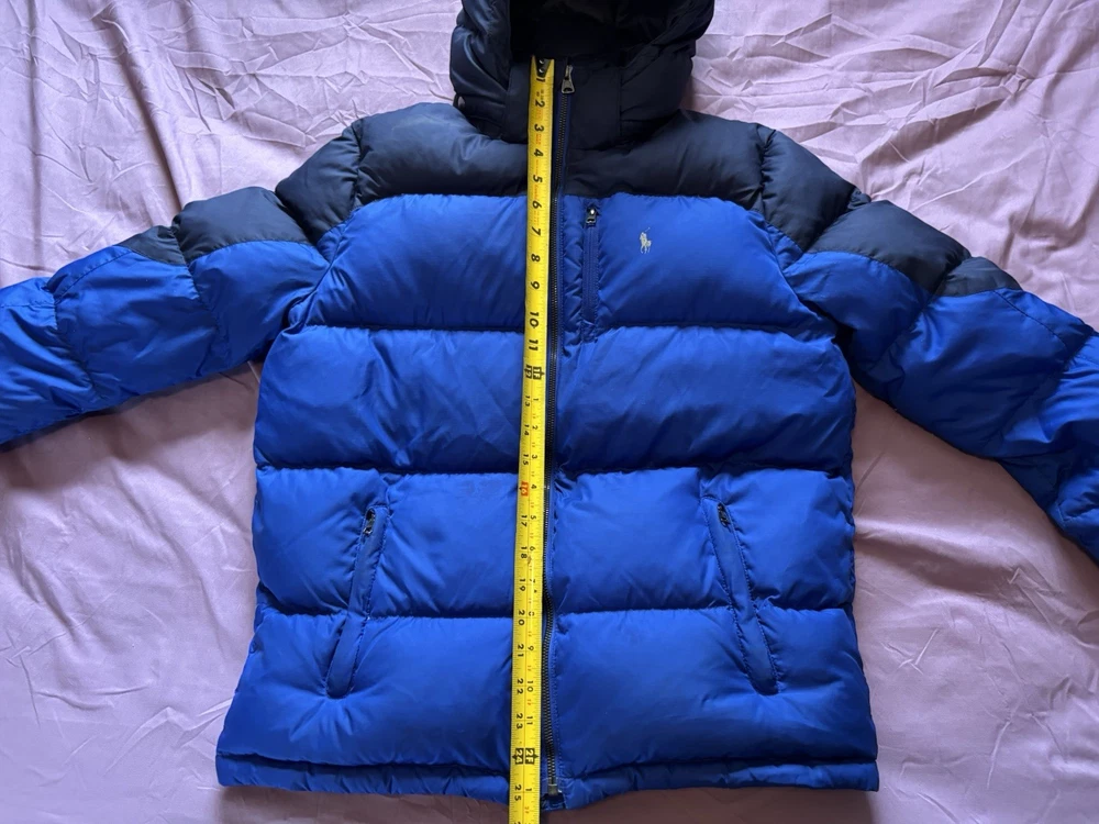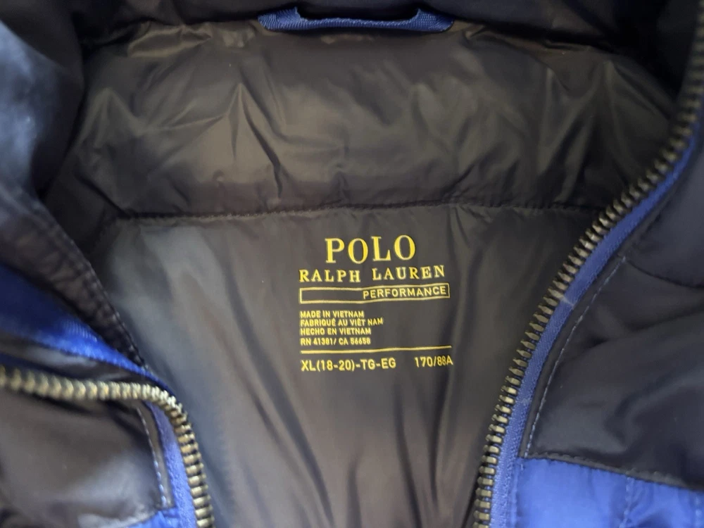 The Polo Ralph Lauren Performance Goose Down Puffer Jacket in Boys XL is a stylish and practical outerwear option for youth boys. Made with high-quality polyester material and insulated with cozy duck down, this jacket is perfect for cold weather activities like skiing or walking. The full zip closure and blue color make it a fashionable choice for casual or activewear occasions. Easy to care for with its machine washable softshell fabric, this jacket is a must-have for any boy's winter wardrobe. There are some dark spots and stains on the jacket. There is a small hole in the hood where down feathers are coming out. Please see photos.