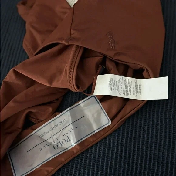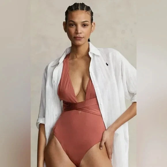 Defined by an alluring plunging neckline, this one-piece swimsuit features a halter silhouette and long straps that can be tied into several different styles . 85% Nylon 15 % Elastane Hand Wash Cold