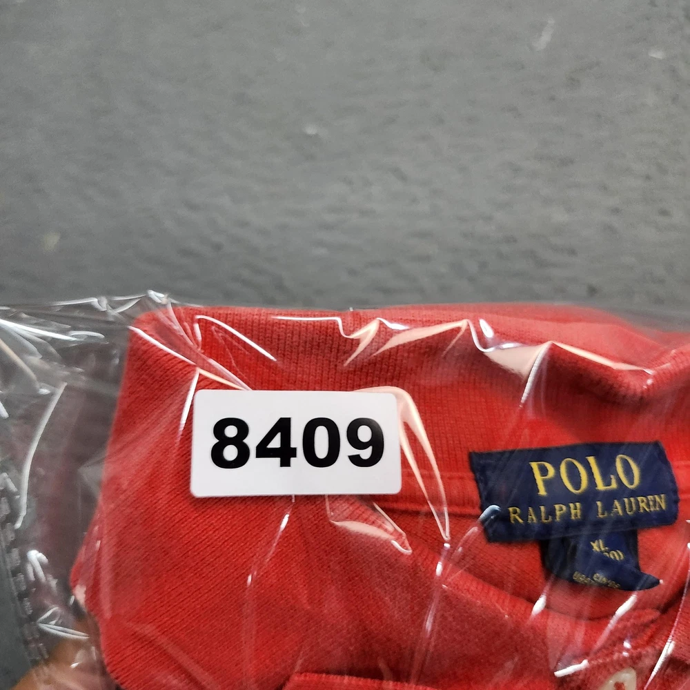 Polo Ralph Lauren polo shirt in boys size XL (18-20) with a solid orange short sleeve collared silhouette designed for casual everyday wear. Tag details: Interior neck label shows POLO RALPH LAUREN branding, size XL (18-20), and MADE IN CHINA country of origin text. Color and fabric: Soft cotton piqué knit fabric in a rich orange tone, offering breathable comfort suitable for warm weather and layering across seasons. Features: Rib-knit polo collar, two-button front placket with matching buttons, short sleeves with rib trim, straight hem with side vents, and a regular fit boys polo silhouette. Design details: Contrasting blue embroidered Polo Pony logo on the left chest adds classic Ralph Lauren styling to the solid color knit body. Additional details: Timeless polo shirt pairs easily with jeans, chinos, or shorts for school, family outings, or casual events throughout the year. Storage details: Shirt is stored folded in a clear plastic bag with a small white inventory sticker labeled '8409' applied near the collar as pictured; please review all photos for visual confirmation of style and design. Use: Versatile Polo Ralph Lauren boys polo shirt ideal for casual, school, and weekend outfits.