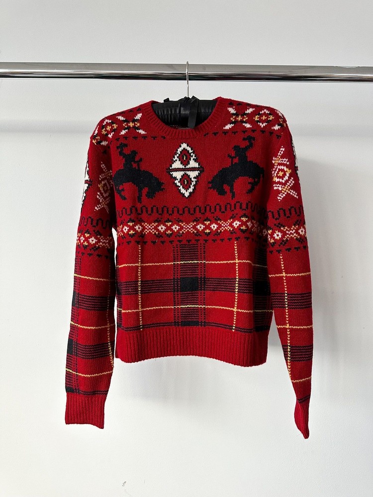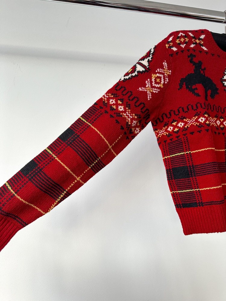 Indulge in comfort and style with Polo Ralph Lauren's Red Tartan Fair Isle Intarsia Crewneck Wool Blend Jumper. Showcasing a classic tartan and Fair Isle design, this jumper features a crewneck and is made from a cozy wool blend for ultimate warmth. Upgrade your winter wardrobe with this festive piece. Details: Red wool blend knitted construction fair isle intarsia knit Tartan detail check pattern crew neck long sleeves ribbed cuffs and hem straight hem Composition 98% Wool, 2% Other fibres Washing instructions Hand Wash