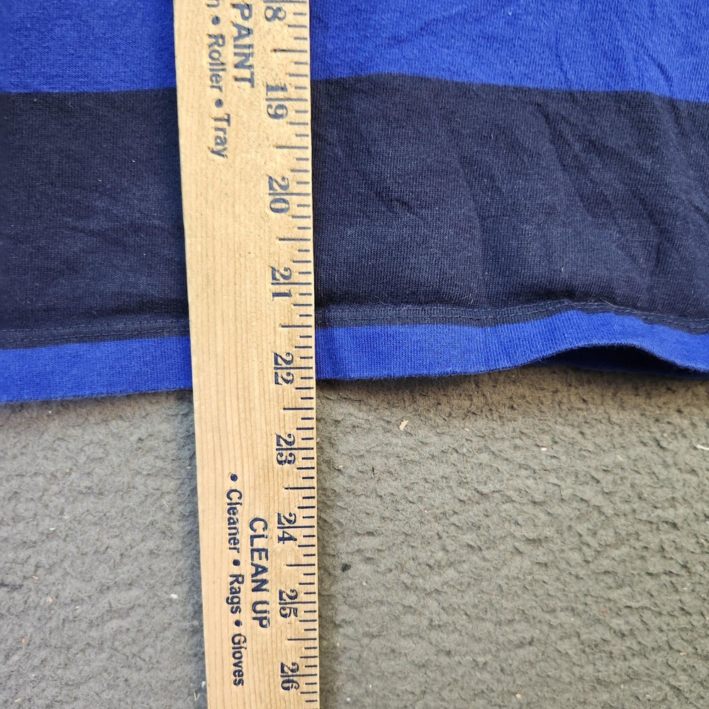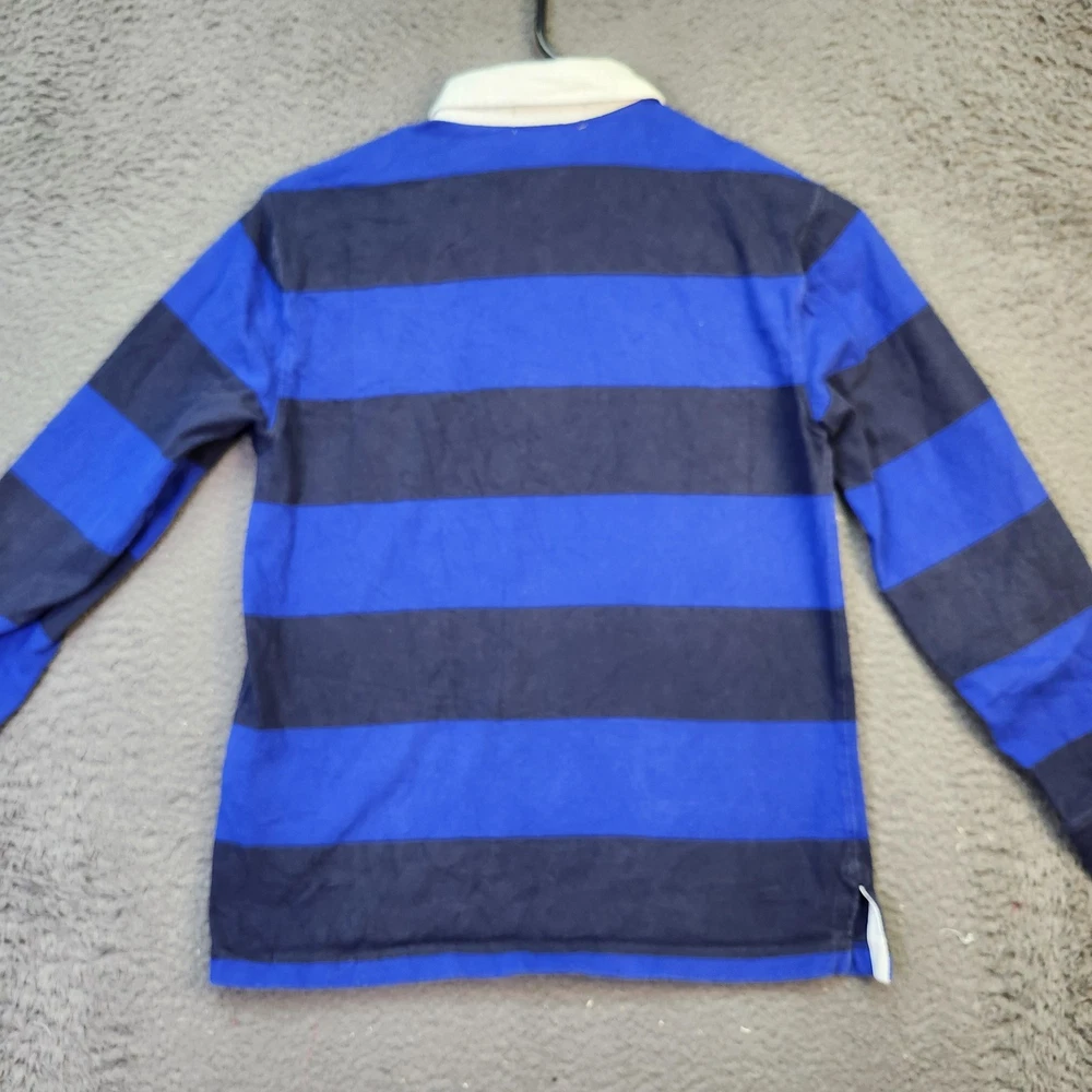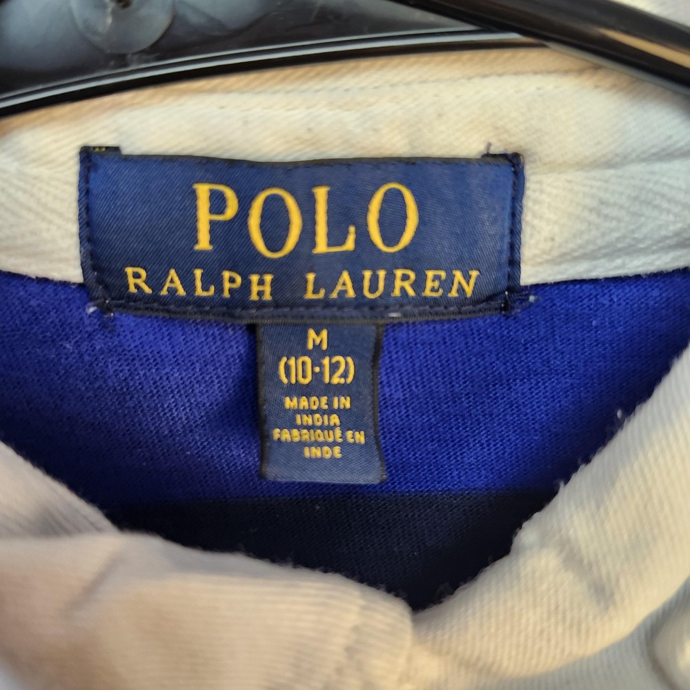 Polo Ralph Lauren Rugby Shirt Boys Medium 10-12 Blue Black Striped Long Sleeve Top Condition: Good used condition with moderate wear, some general fading and wear, small flaw/repair on left sleeve cuff as shown in photos Classic bold blue and black wide horizontal rugby stripes Signature yellow Ralph Lauren polo player logo embroidered on left chest White woven collar and partial button placket Tag size: Medium (10-12) Youth/Boys Approximate flat measurements shown in photos: pit to pit ~17.5", back length from collar ~22.5" Made in India Great layering piece for casual or preppy style
