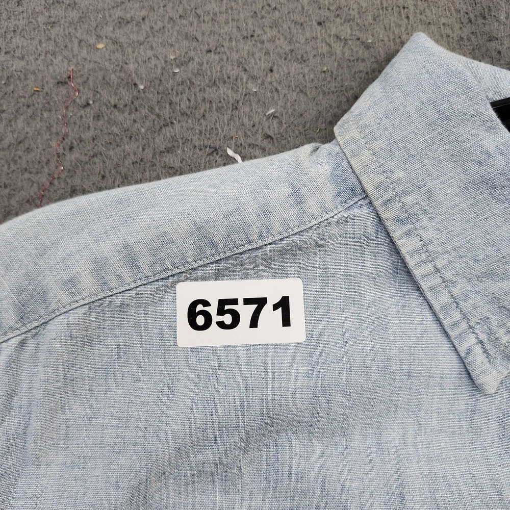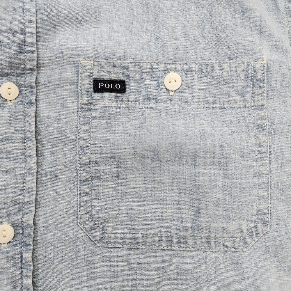 Polo Ralph Lauren shirt in boys size Large 14-16 with a blue long sleeve button-front collared silhouette designed for casual wear and layering. Tag details: Interior neck label shows POLO RALPH LAUREN branding and size L (14-16) text. Color and fabric: Light blue chambray-style woven fabric with subtle texture throughout for a classic denim-inspired look suitable for everyday wear. Features: Point collar, full button-front placket with light buttons, long sleeves with button cuffs, back yoke with pleats, and curved shirttail hem for comfortable movement and easy layering. Design details: Two front chest patch pockets with button closures, left pocket featuring a small woven POLO logo tab for subtle branding. Additional details: Inventory sticker labeled '6571' is attached at the upper back as pictured. Use: Versatile boys button-up shirt suitable for school, casual outfits, or layering over tees; please review all photos for additional visual details and confirmation of style and design.