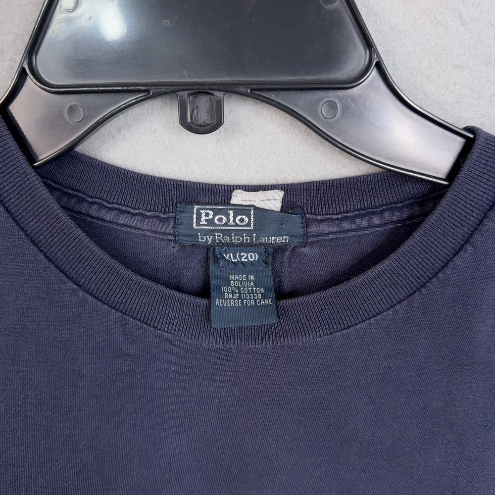 Polo Ralph Lauren Shirt Boys XL 20 Navy Blue Hyannis Port Fish Graphic Tee Beach Pinhole and darker spot at bottom. Pre-owned Polo Ralph Lauren boys graphic t-shirt with overall wear from normal use. Fabric, seams, and hem are intact with a soft feel; small pinhole at the lower front near the hem and a faint spot on the back are shown in photos. Interior tags are present; original retail tags and packaging are not included. Brand: Polo Ralph Lauren Item: Boys short sleeve graphic shirt Color/Pattern: Navy blue with Hyannis Port Ralph Lauren fish graphic in yellow, green, and blue with white text at the front. Size on tag: XL (20) Materials: 100% cotton jersey knit (per tag). Country of origin: Made in Bolivia (per tag). Design details: Crew neckline, short sleeves, straight hem, pullover construction, and soft midweight knit suitable for casual everyday wear. Branding/Logos: Hyannis Port Ralph Lauren Est. 1967 fish graphic printed across chest; woven Polo by Ralph Lauren neck label; interior care tag at side seam. Tags/Codes: Interior tag notes 100% cotton, made in Bolivia, and care instructions on reverse. Notes: Nautical-themed Polo Ralph Lauren boys tee ideal for beach trips, coastal vacations, or casual school outfits; please review all photos for full design details. 25680 Measurements: Previous washings may change sizing on the tag. Refer to photos above for all measurements. Compare our measurements to one of your favorite garments. Measurements are approximate. All items are bagged and sealed after being photographed, then stored in a smoke free environment. Washed per eBay standards. I carefully package and ship daily. Contact me with any questions. Thanks