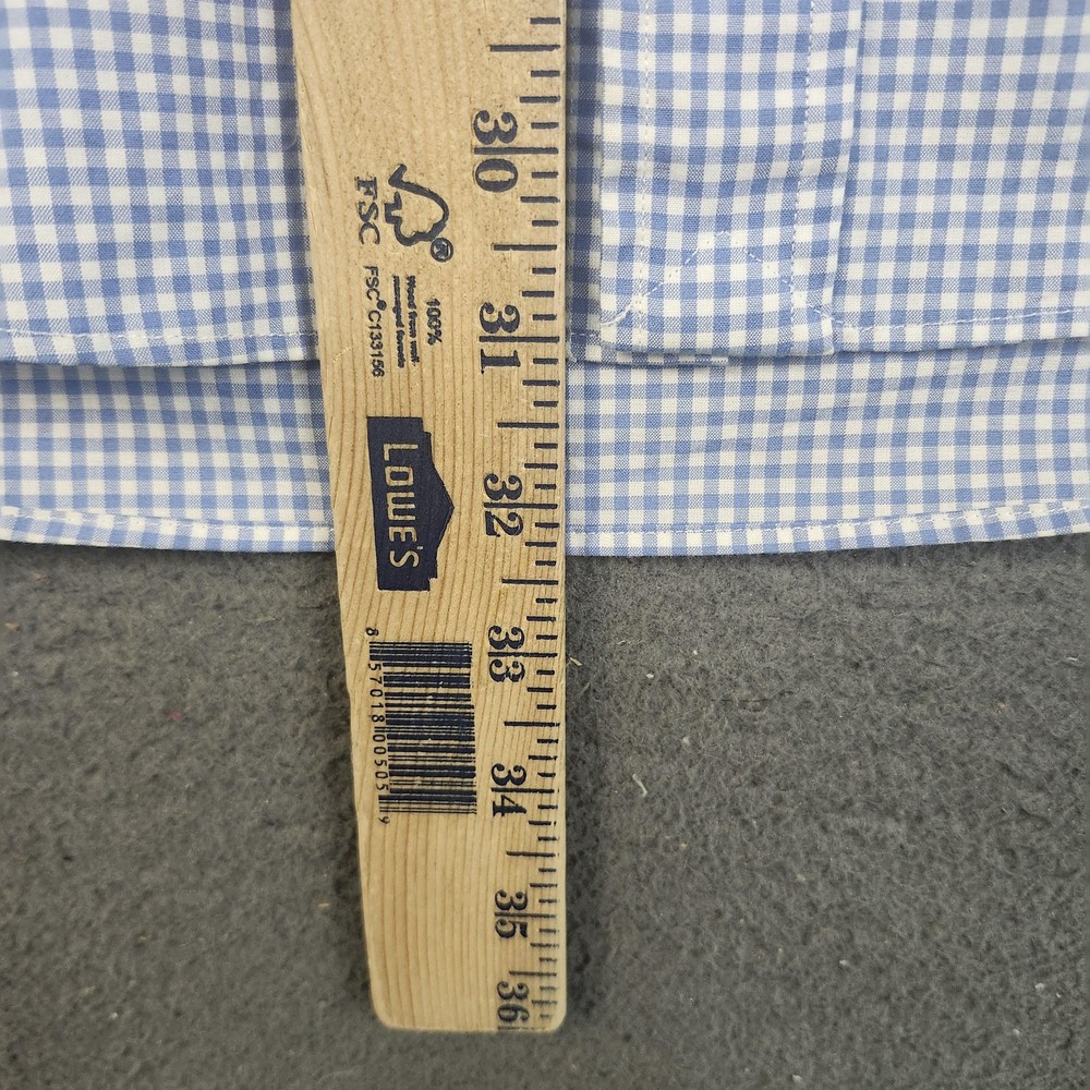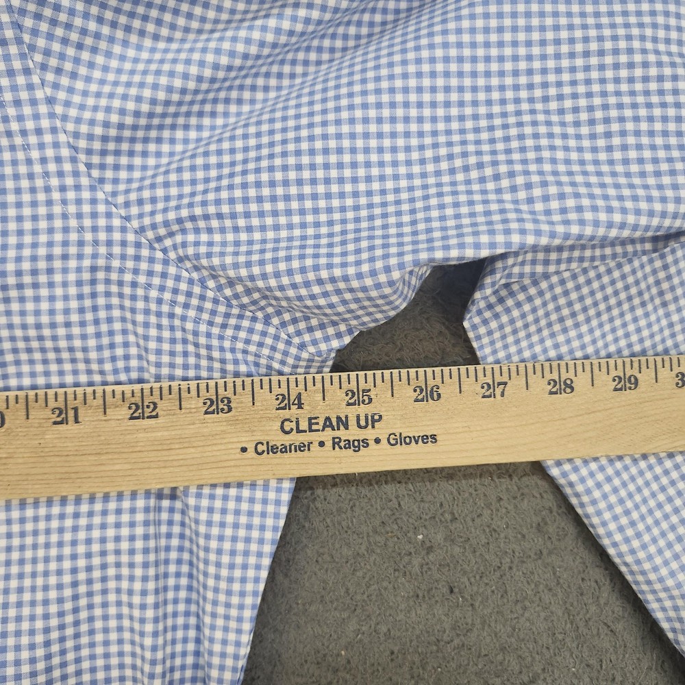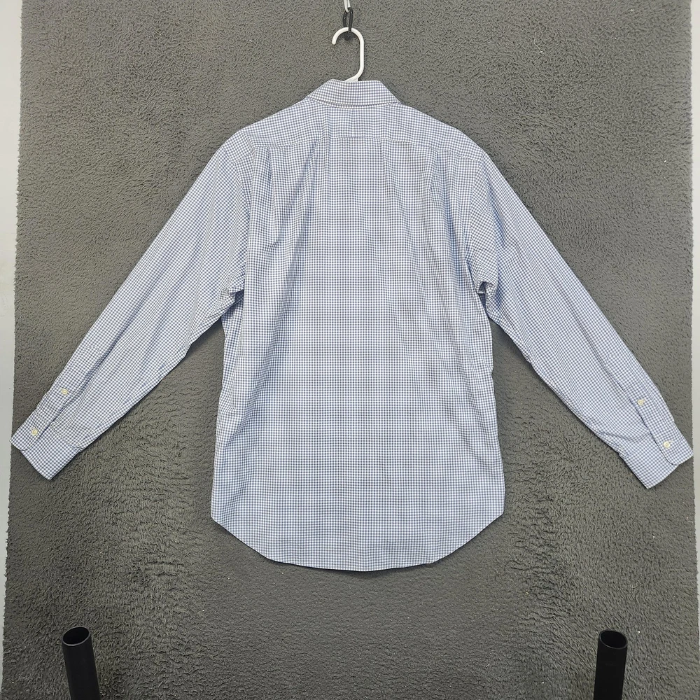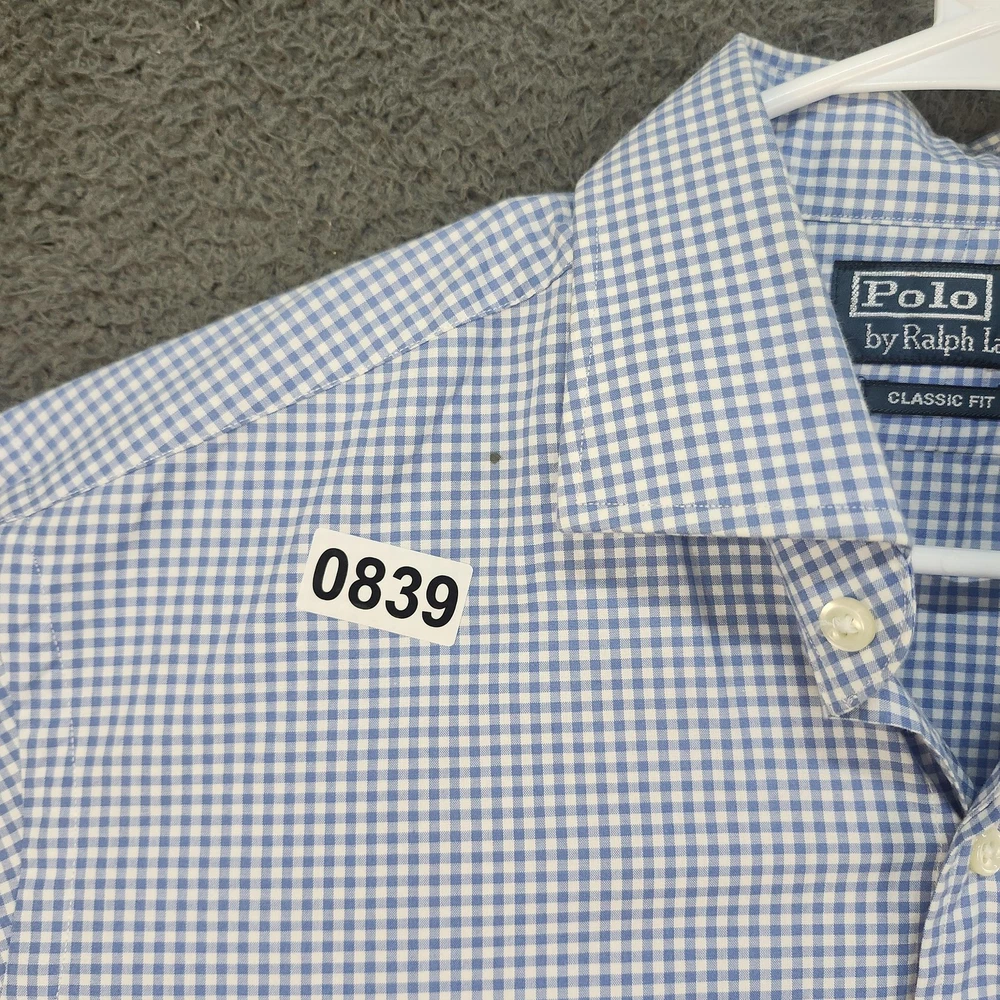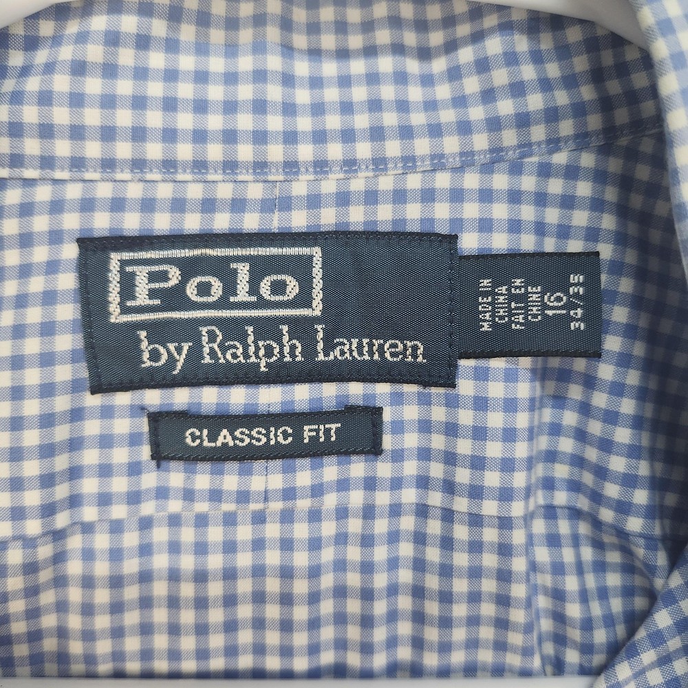 Brand: Polo by Ralph Lauren Style: Mens long-sleeve button-front dress shirt in a classic fit. Color/Pattern: Light blue and white gingham check. Size on tag: 16 neck, 34/35 sleeve (Classic Fit). Made in China. Details: Point collar, full button front, button cuffs, curved shirttail hem, back yoke with pleats for ease of movement. Flaws: Small dark spot on front near collar and another small spot on back, both shown in photos.