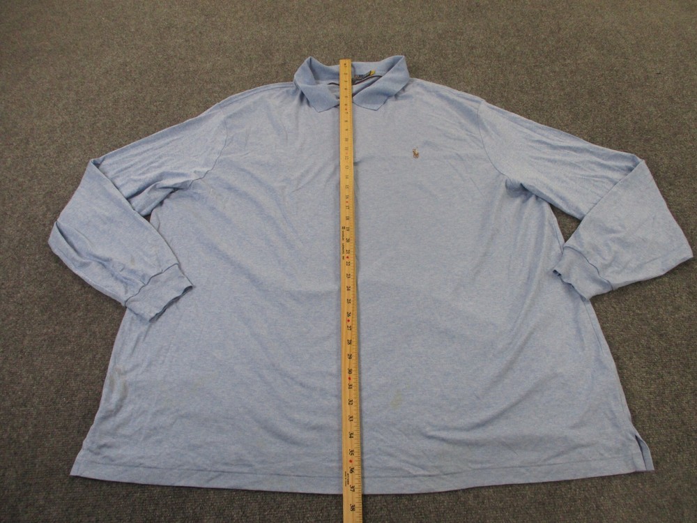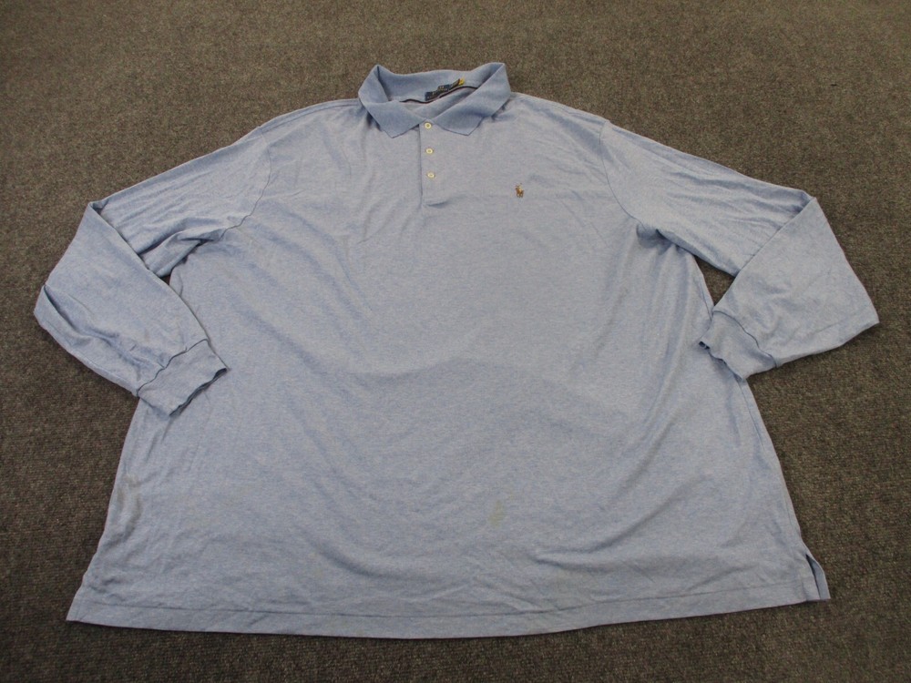 Department: Men Theme: Classic, USA Sleeve Length: Long Sleeve Vintage: No Occasion: Casual Performance/Activity: Golf Neckline: Collared Accents: Logo Closure: Button Color: Blue Features: Stretch Product Line: Ralph Lauren Performance Size: Big 5X Material: Cotton Fit: Classic Type: Polo Brand: Polo Ralph Lauren Pattern: Solid Collar Style: Spread Size Type: Big & Tall Seller Notes: “Stained on front and back. Check below for full description & photos.” Fabric Type: Knit