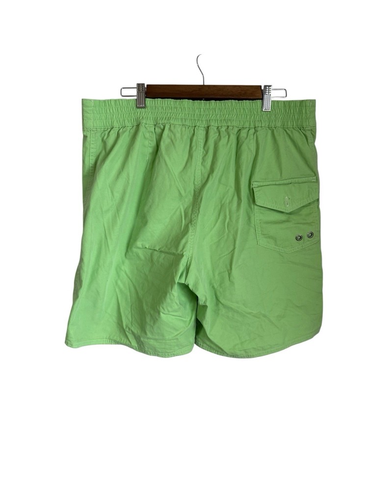 The product is a pair of Polo Ralph Lauren men's XL green swim shorts with a blue #3 pony logo, perfect for a beach or poolside look. These swim trunks are lined with polyester for added comfort and durability, made from a softshell fabric of nylon and cotton. The shorts feature an elastic waistband, quick-dry capabilities, and a drawstring for a customized fit. With a board shorts style and above-the-knee length, these swim bottoms are both stylish and practical for recreational water activities. Machine washable for easy care, these shorts are a stylish addition to any man's swimwear collection.