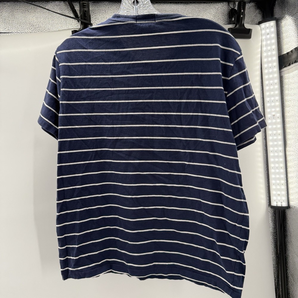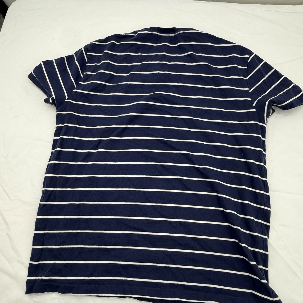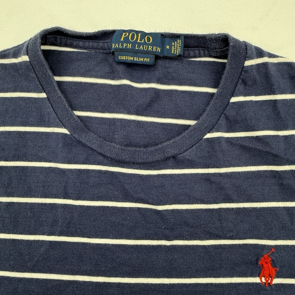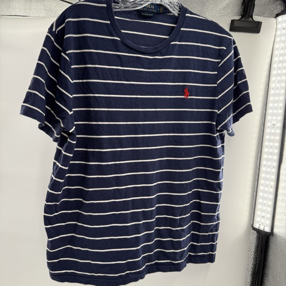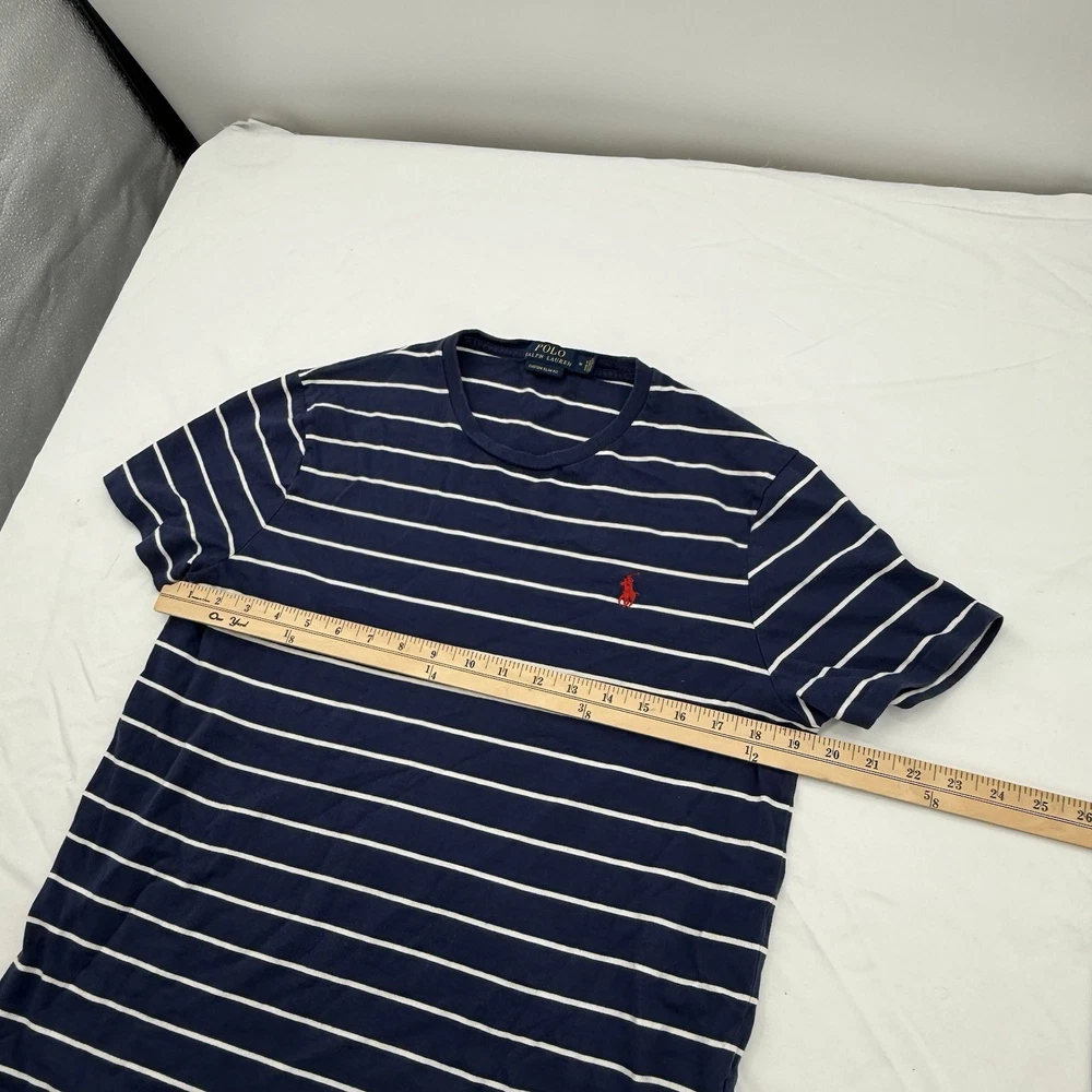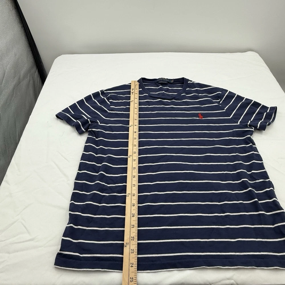 The Polo Ralph Lauren Custom Slim Fit Men's T-Shirt in Blue and White Striped is a stylish and high-quality piece of clothing made from cotton knit fabric. This short sleeve shirt features a crew neck and a slim fit, making it perfect for men looking to add a touch of sophistication to their wardrobe. Machine washable and crafted by the renowned brand Polo Ralph Lauren, this T-shirt is designed for a comfortable and flattering fit in size Medium.