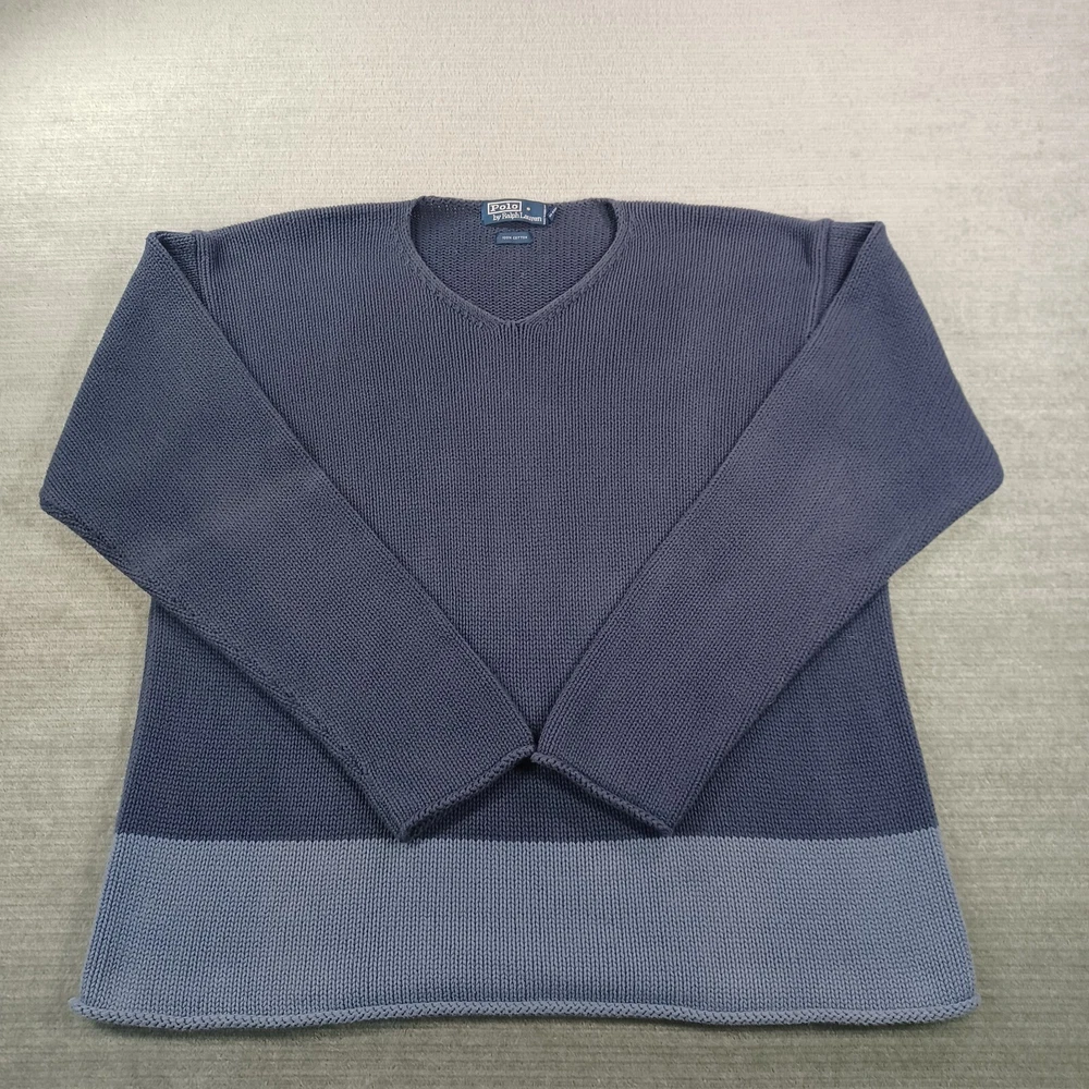 Polo Ralph Lauren Sweater Mens L Blue Knit Color Block Stretch Casual Midweight Good pre-owned condition Please review all photos for details and measurements.