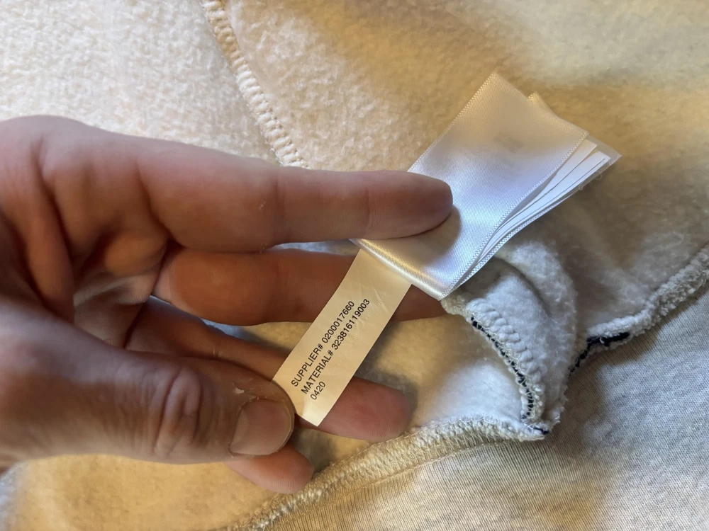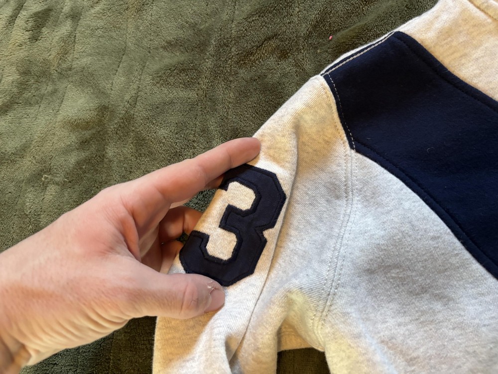 Brand: Polo Ralph Lauren Style: Boys full zip hoodie sweatshirt with contrast diagonal sash and big pony logo Size: Boys Medium (10-12) Color: Heather gray with navy blue sash, hood lining, and sleeve number patch; maroon pony embroidery Material: Cotton and polyester fleece blend with cotton contrast panels (see fabric tag photo for full fiber content) Pattern: Colorblock design with diagonal sash and applique number graphic Details: Full-length front zipper with logo pull, split kangaroo pockets, large embroidered polo player logo at left chest, navy diagonal sash panel across front, twill "3" applique patch on right sleeve, ribbed cuffs and hem, lined hood with contrast navy interior Manufacturing: Made in Cambodia; internal tags list RN 41381 and CA 56658; internal production codes include Supplier # 020070660 and Material # 323801679003 Care: Machine wash cold with like colors, tumble dry low; turn inside out and close fasteners before laundering Department: Boys; casual athletic-inspired layer suitable for everyday wear, school, or sports Keywords: boys Polo Ralph Lauren hoodie, big pony sweatshirt, kids medium 10-12 zip up, gray navy colorblock fleece
