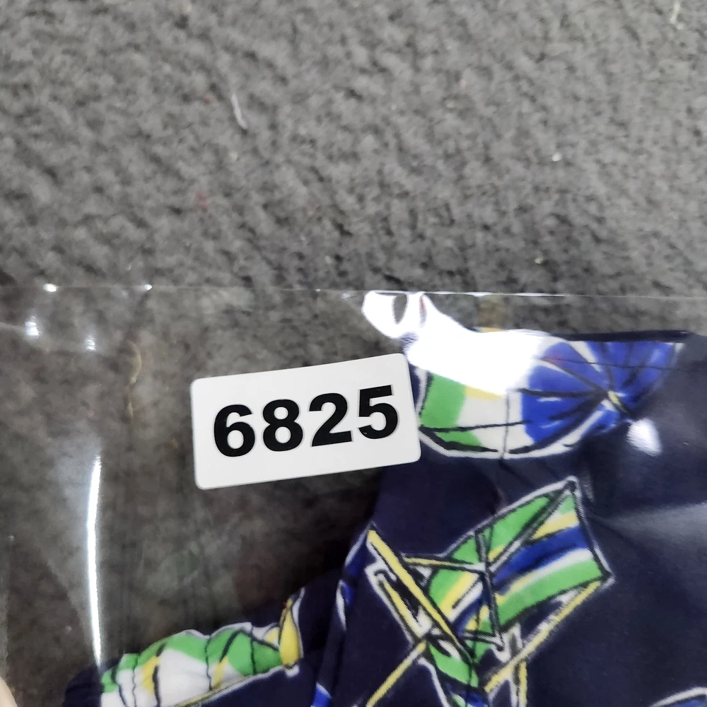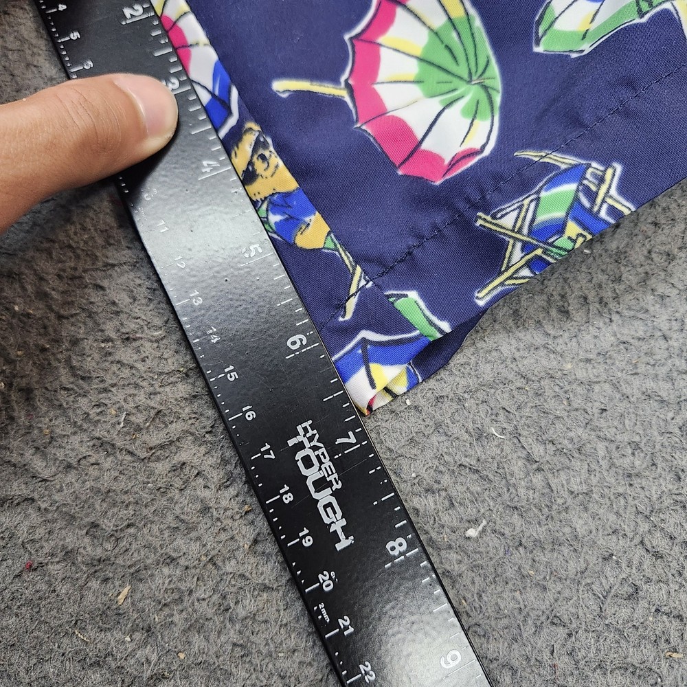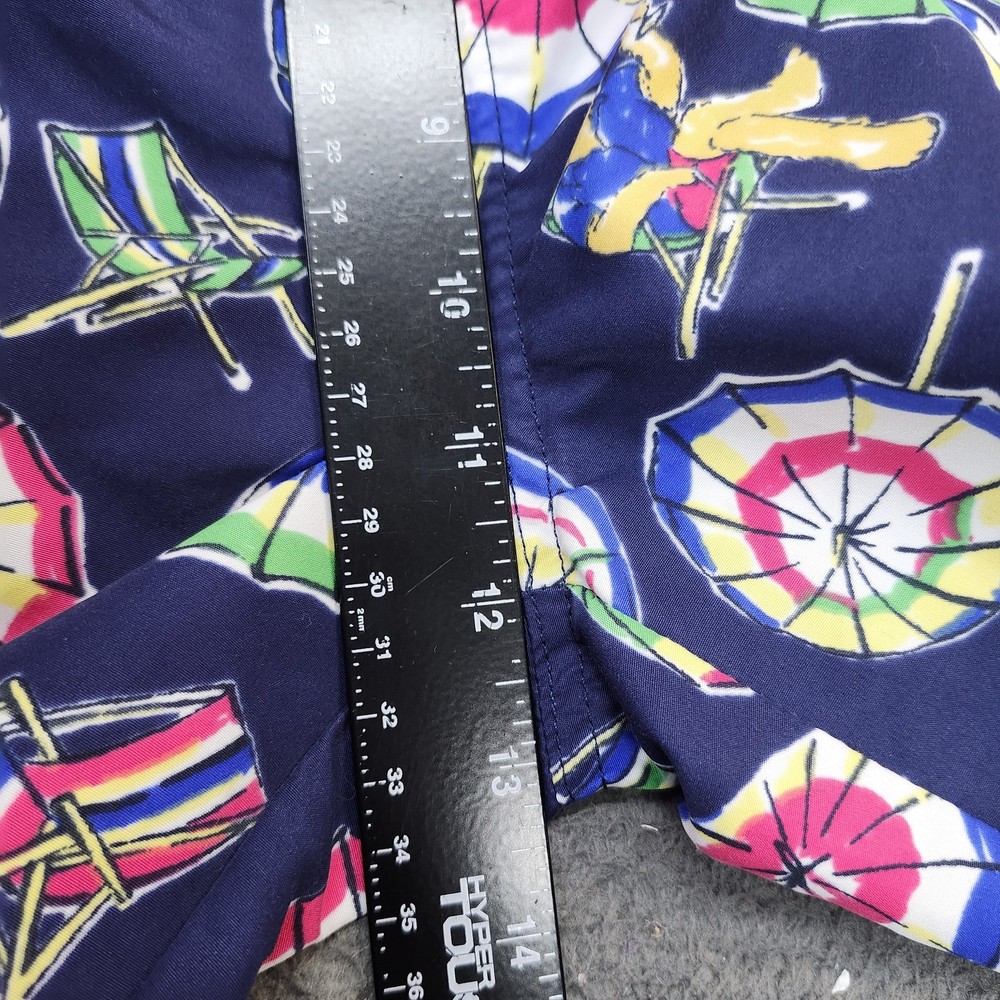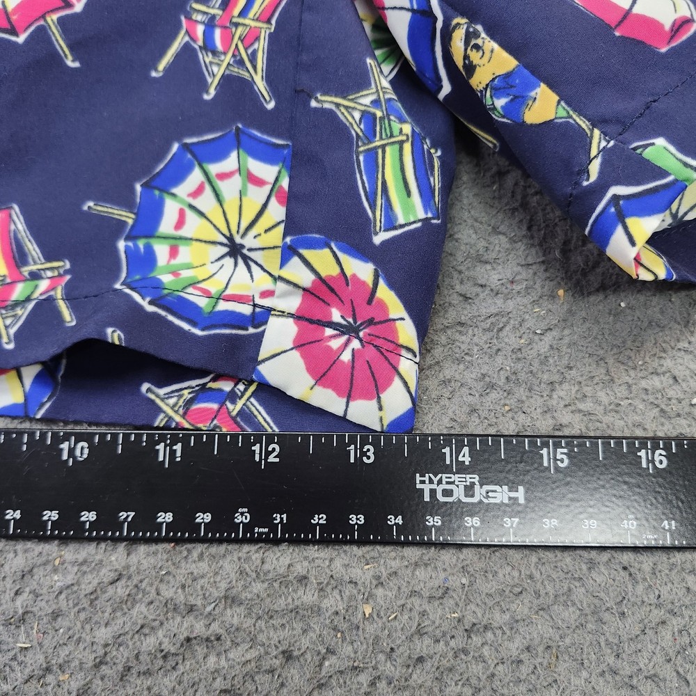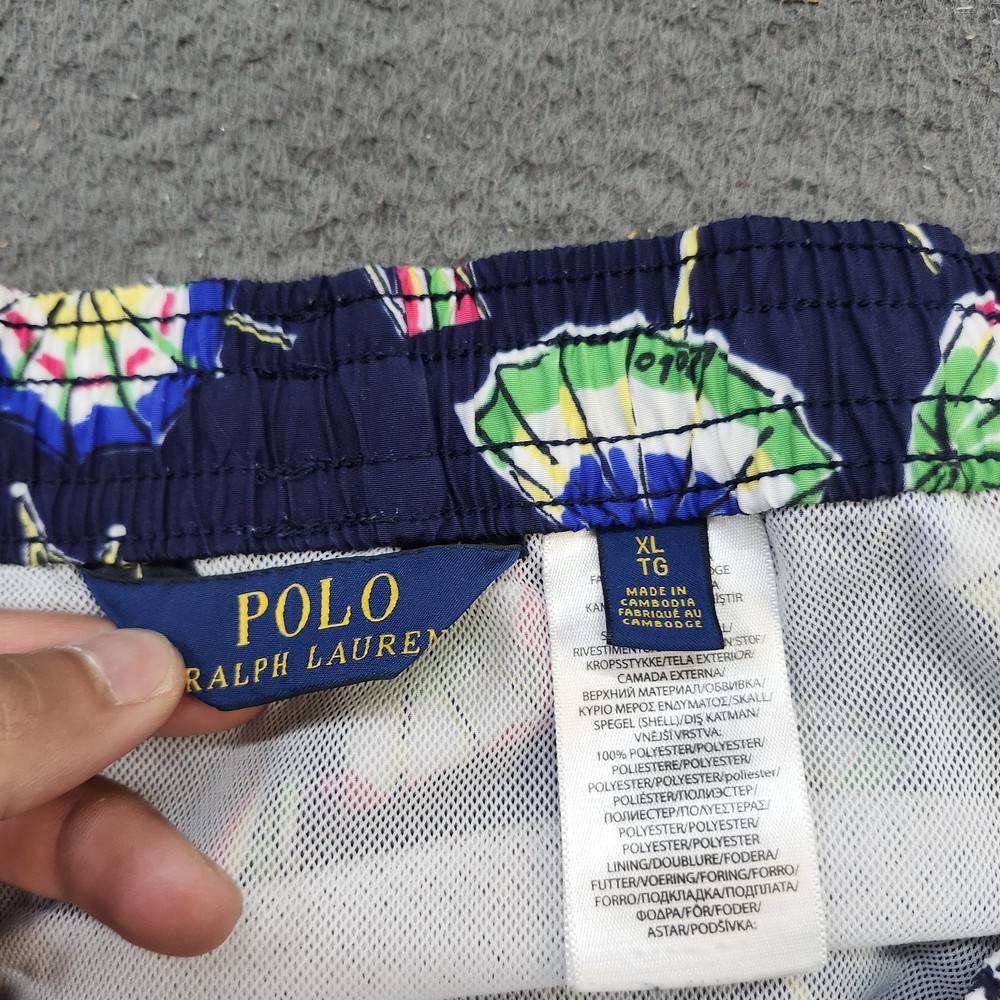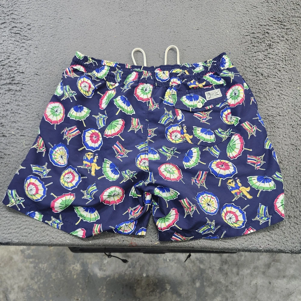 Brand: Polo Ralph Lauren. Style: Mens swim shorts designed as above-the-knee beach and pool trunks. Color: Navy blue base with multicolor geometric beach umbrellas, lounge chairs, and Polo Bear characters in an allover print. Size: Mens XL, as indicated on the interior size tag marked "XL / TG". Material: Shell 100% polyester with 100% polyester mesh lining, according to the interior care label. Country of origin: Made in Cambodia, as stated on the interior tag. Design details: Elastic waistband with exterior drawstring, mesh brief lining, side hand pockets, and a back right patch pocket with button closure and drainage eyelet. Branding and accents: Woven interior "Polo Ralph Lauren" waistband label, back pocket woven "Polo Ralph Lauren Swimwear" patch, and signature Polo Bear beach graphics throughout. Construction: Lightweight woven polyester swim fabric with a relaxed mens fit and above-the-knee length for ease of movement. Features and use: Elastic and drawstring waist for an adjustable fit, mesh-lined interior, and functional pockets suited for recreational swimming, beach days, and summer vacation wear. Additional details: Inventory sticker 6825 is attached in the photos.