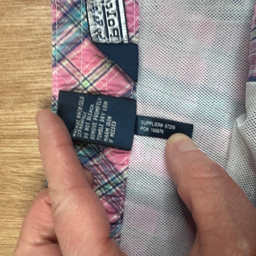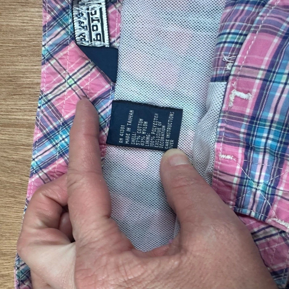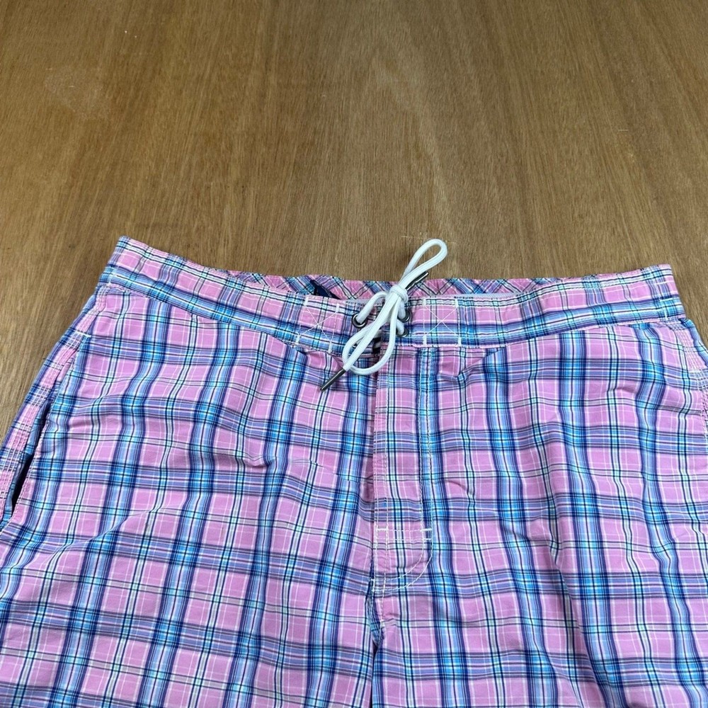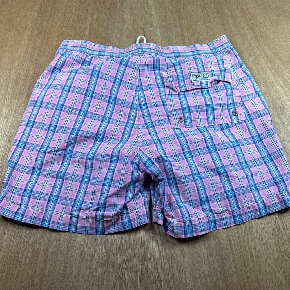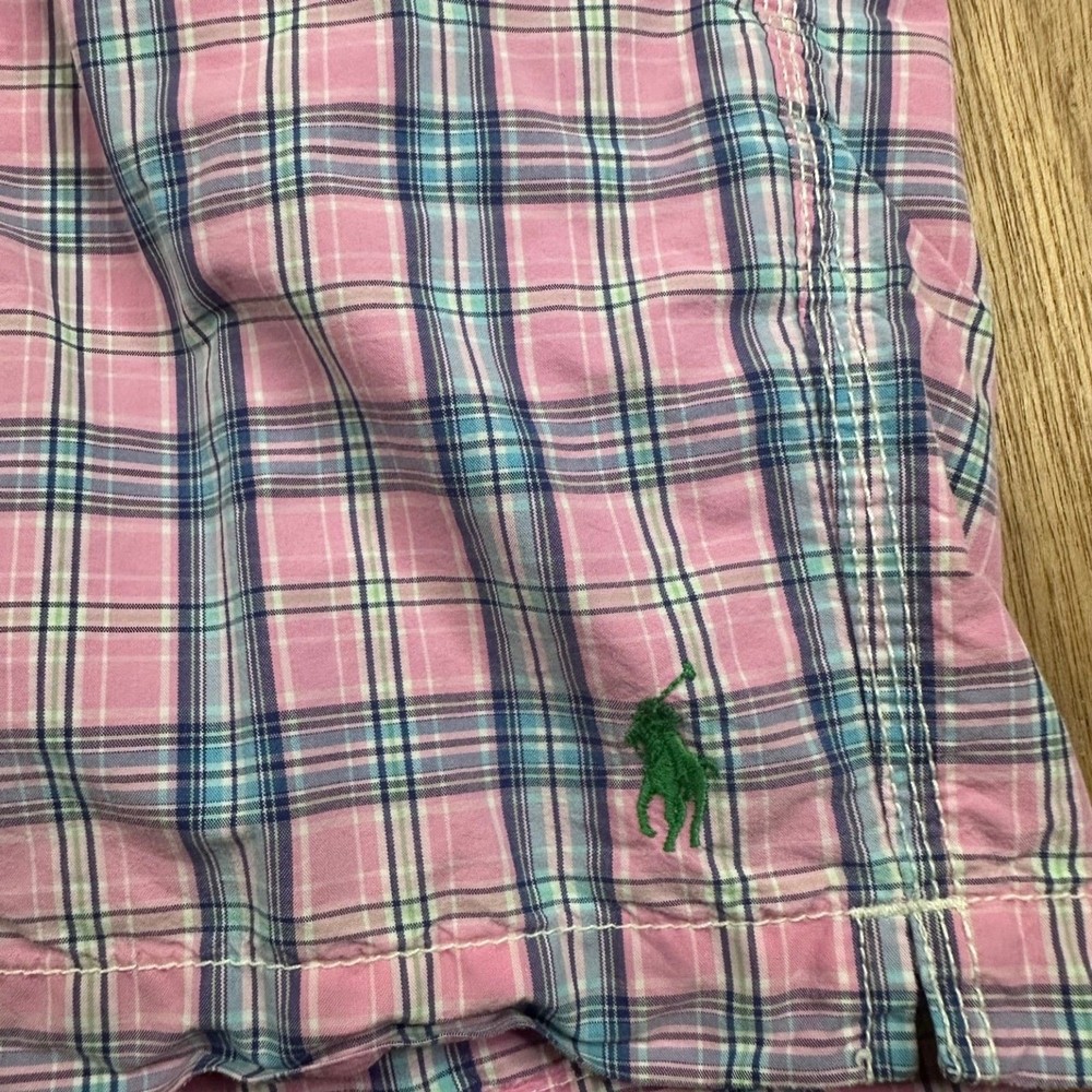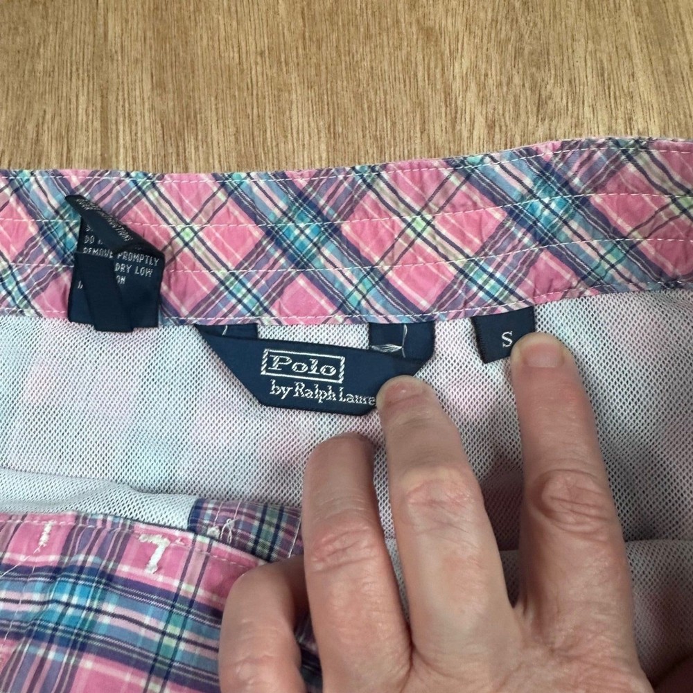 Classic Polo swim trunks in a pink, blue, and green plaid pattern with the iconic green pony logo embroidered at the hem. Lightweight cotton shell with mesh lining. Adjustable drawstring waist. Clean preppy summer staple. Bright, coastal look. Easy vacation piece. Features Brand: Polo Ralph Lauren Size: S (Small) Color: Pink Multi Plaid 100% Cotton shell Mesh lining Elastic waistband Adjustable drawstring Side pockets Back flap pocket with button Embroidered pony logo Condition Pre-owned. Normal wash wear. No major stains or holes observed. Mesh lining intact. #PoloRalphLauren #PreppyStyle #SwimTrunks #SummerWear 1622