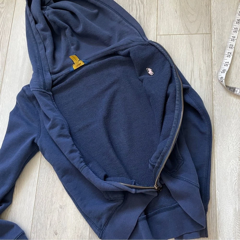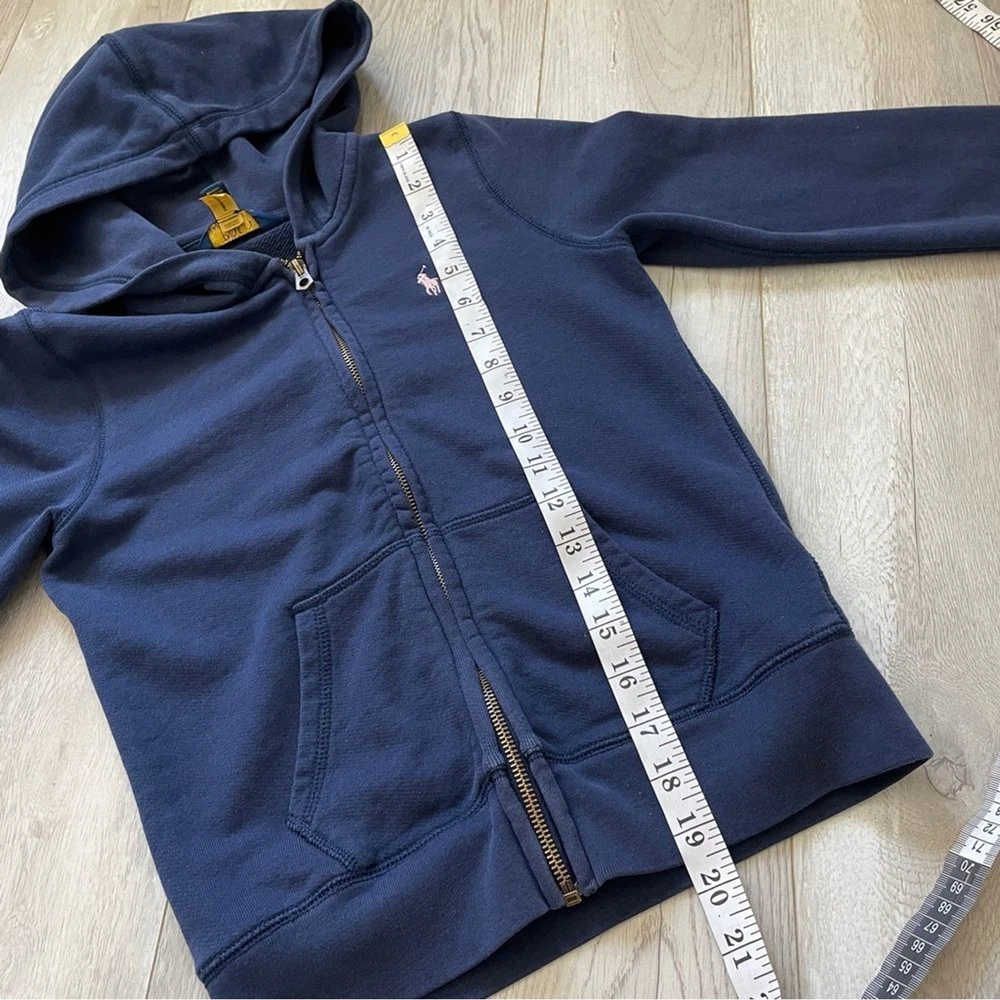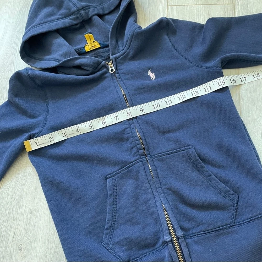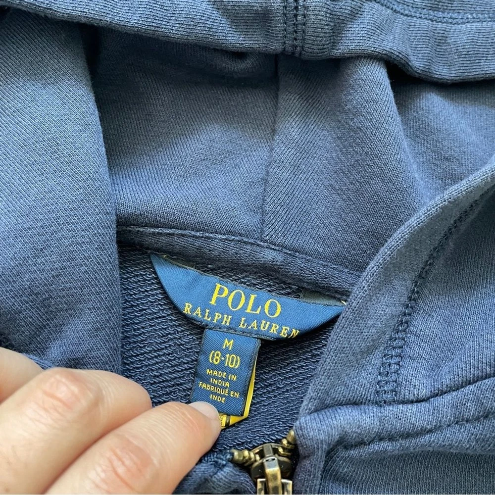 Polo Ralph Lauren Terry Full Zip Hoodie Jacket in the color Blue. Hooded. Terry interior. Super soft and comfy. Full zip. Long sleeve. In pre-loved condition, one stain in back. Kids Size 8-10. Cotton / Polyester.