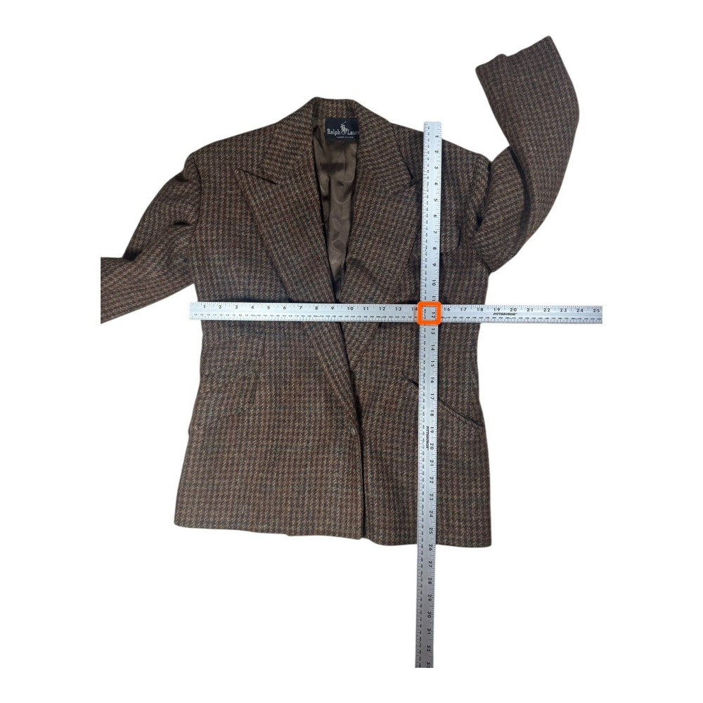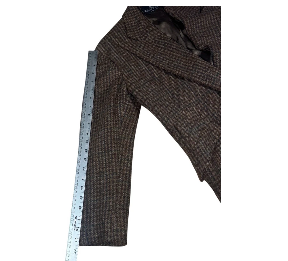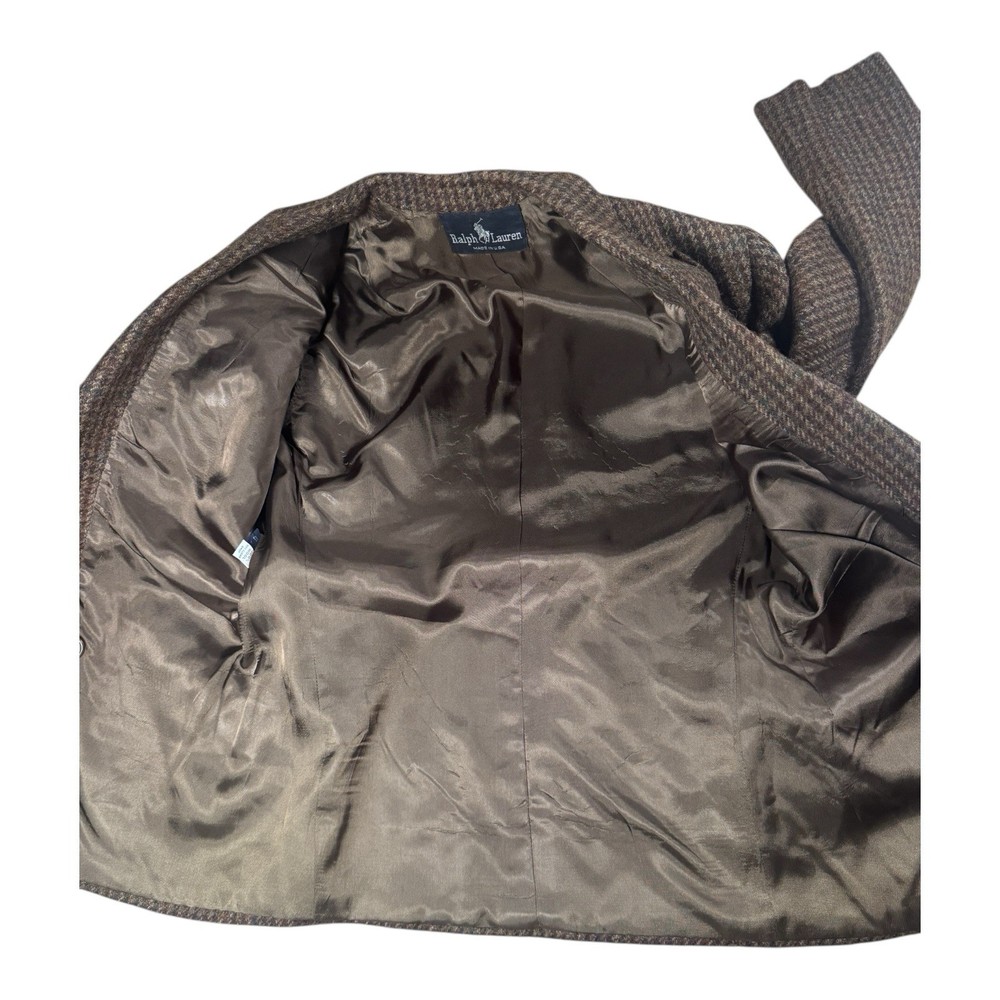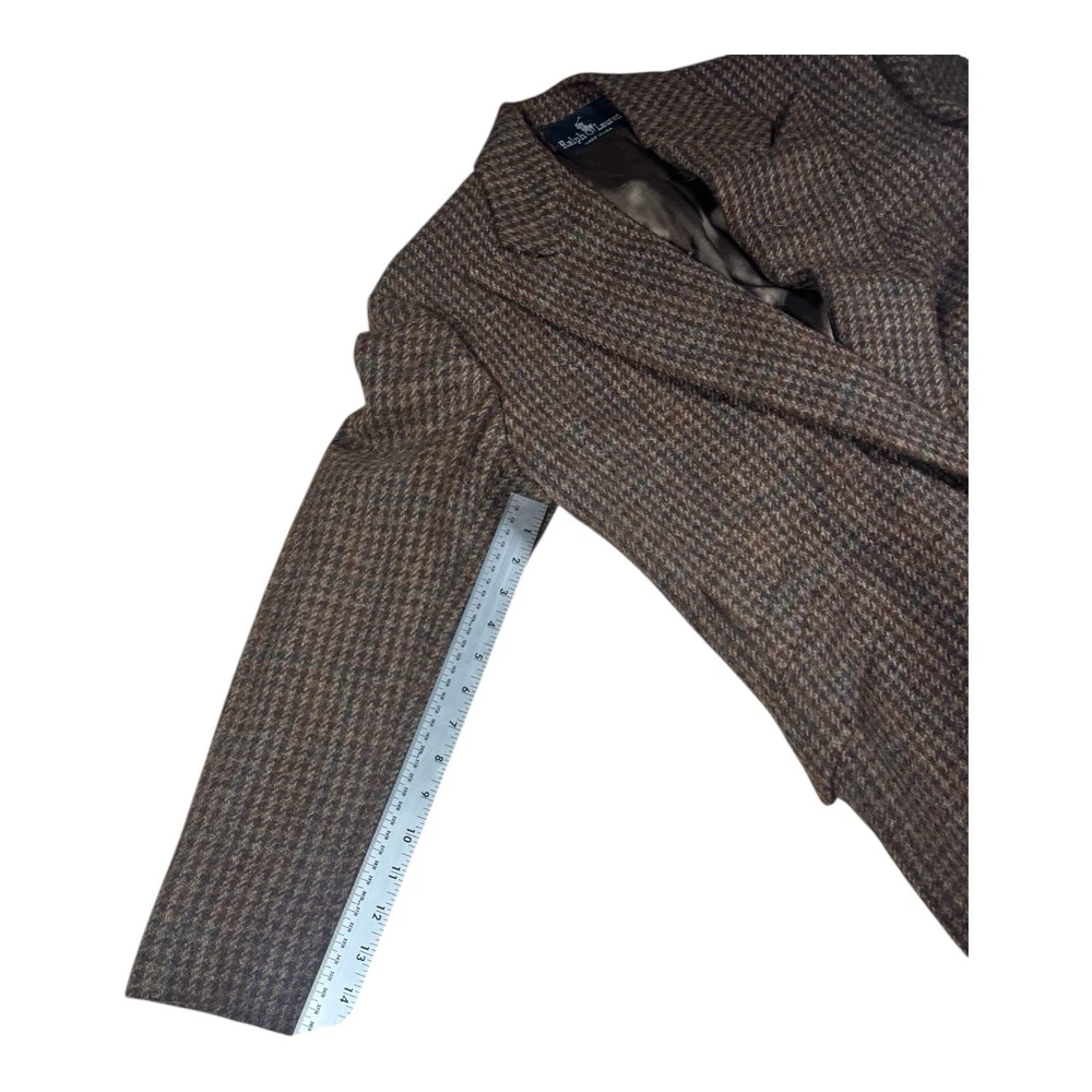 Good vintage condition with no holes or major flaws noted, and all seams, lining, and structure remain intact. This 1970s Polo Ralph Lauren women’s tailored blazer is made in the USA from wool tweed with a brown houndstooth pattern, featuring a classic notch lapel, single-breasted two-button closure, chest welt pocket, flap hip pockets, structured shoulders, and full satin lining, offering a timeless, structured silhouette suitable for casual, business, or dress wear—please review all photos for details and overall condition.